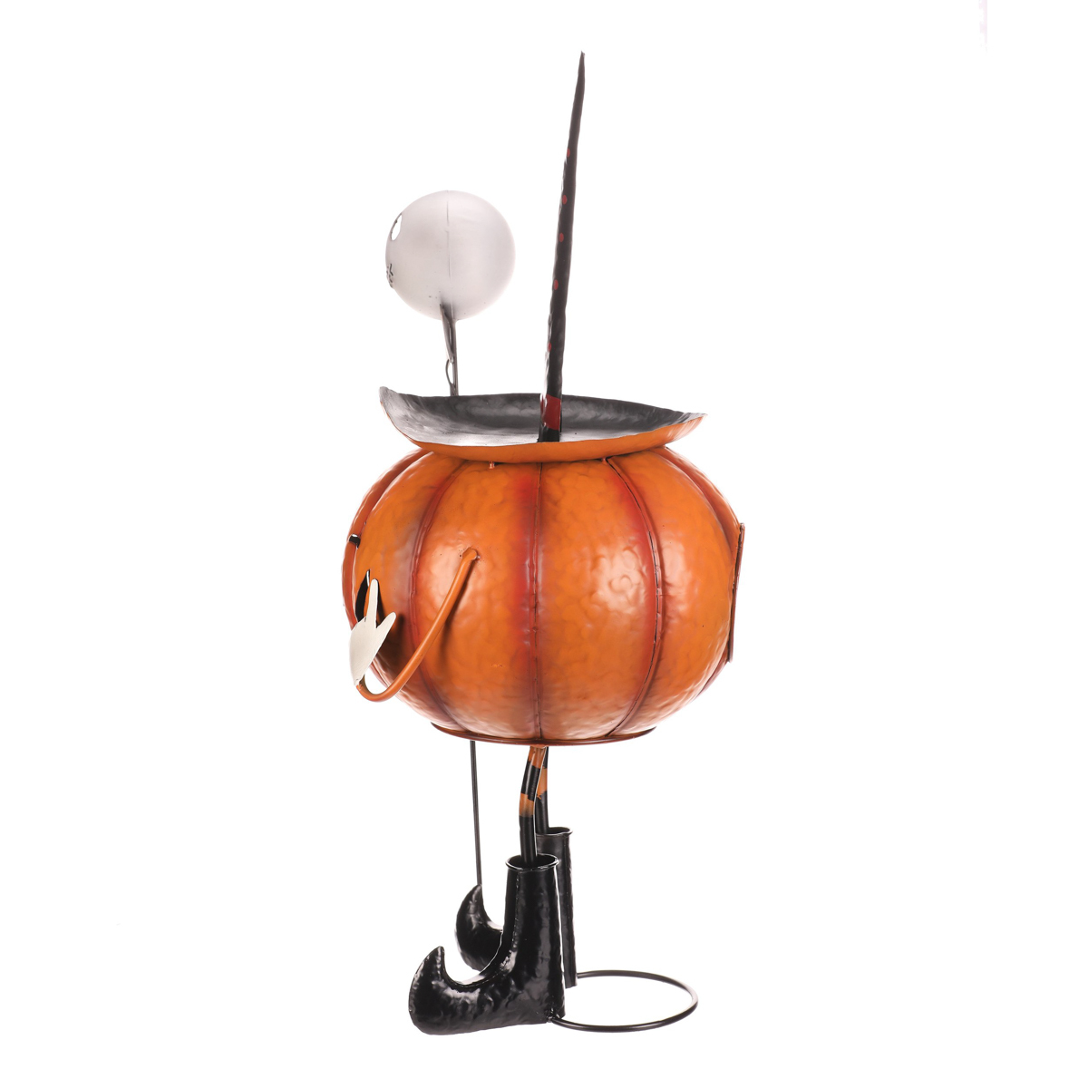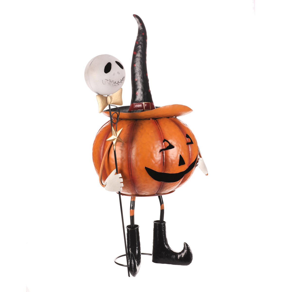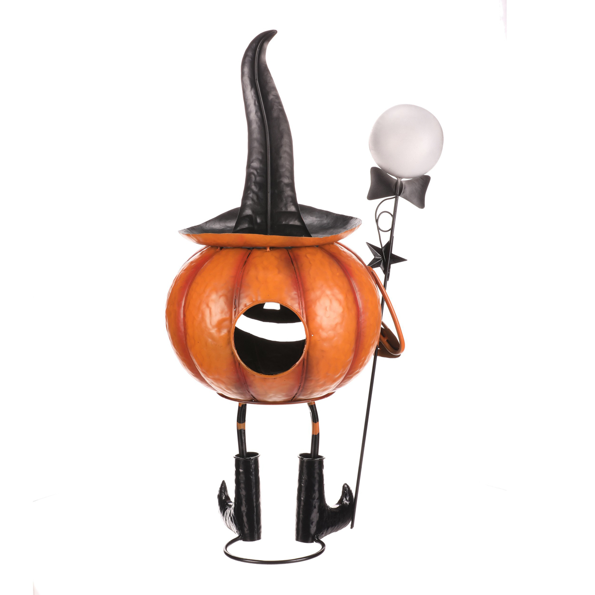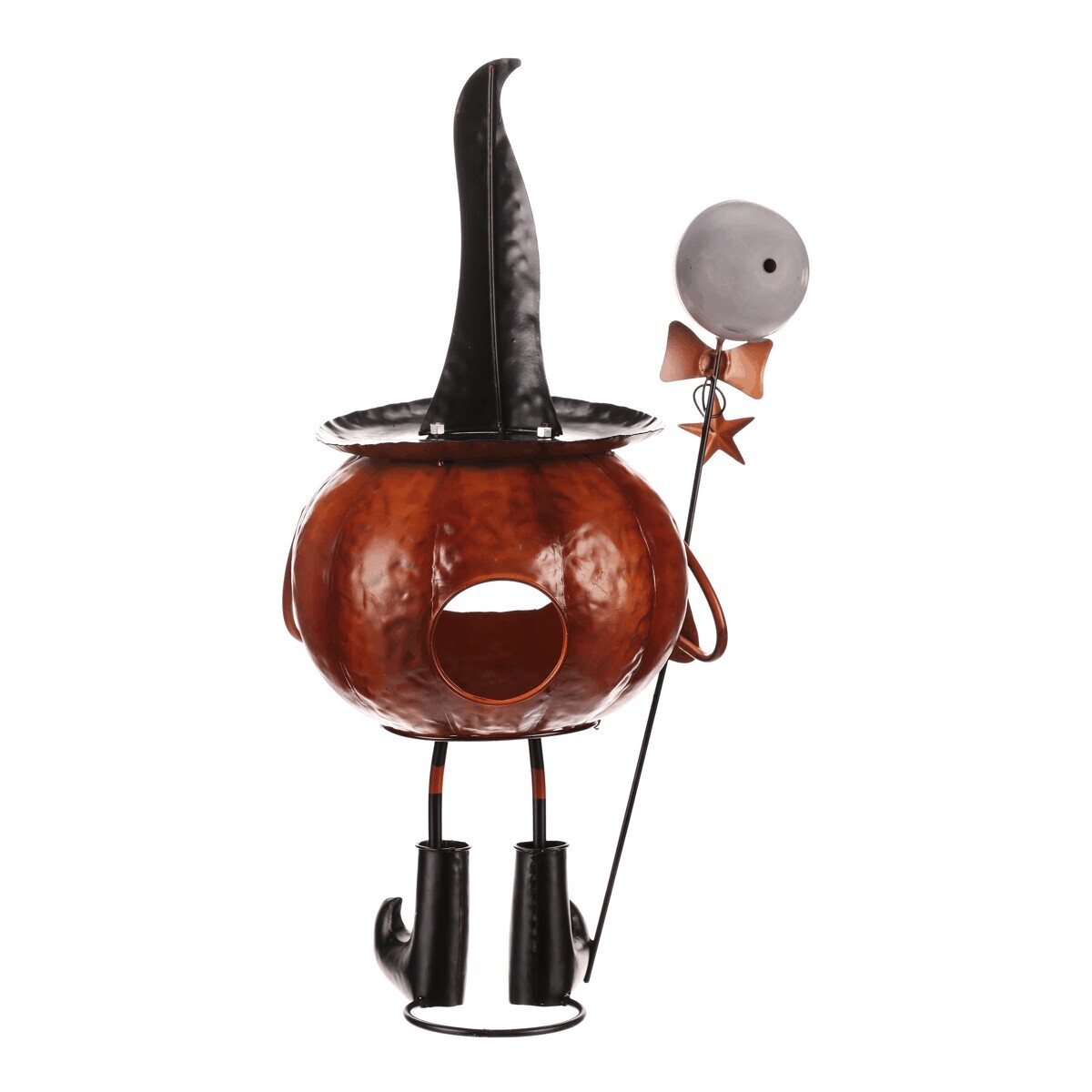 Oranžová kovová dýně s kloboukem a hůlkou zakončenou bubákem, sice vypadá strašidelně, ale její veselý výraz napoví, že to s tou hrůzou nebude tak zlé. Ideální dekorace na Halloween i podzimní večery, která potěší každého, kdo má rád trochu tajemna s úsměvem.