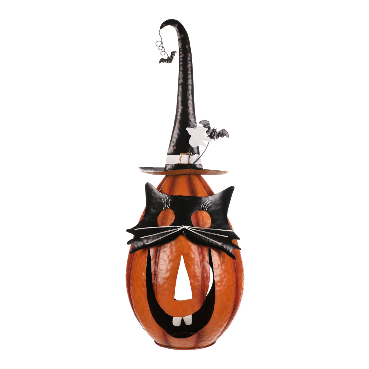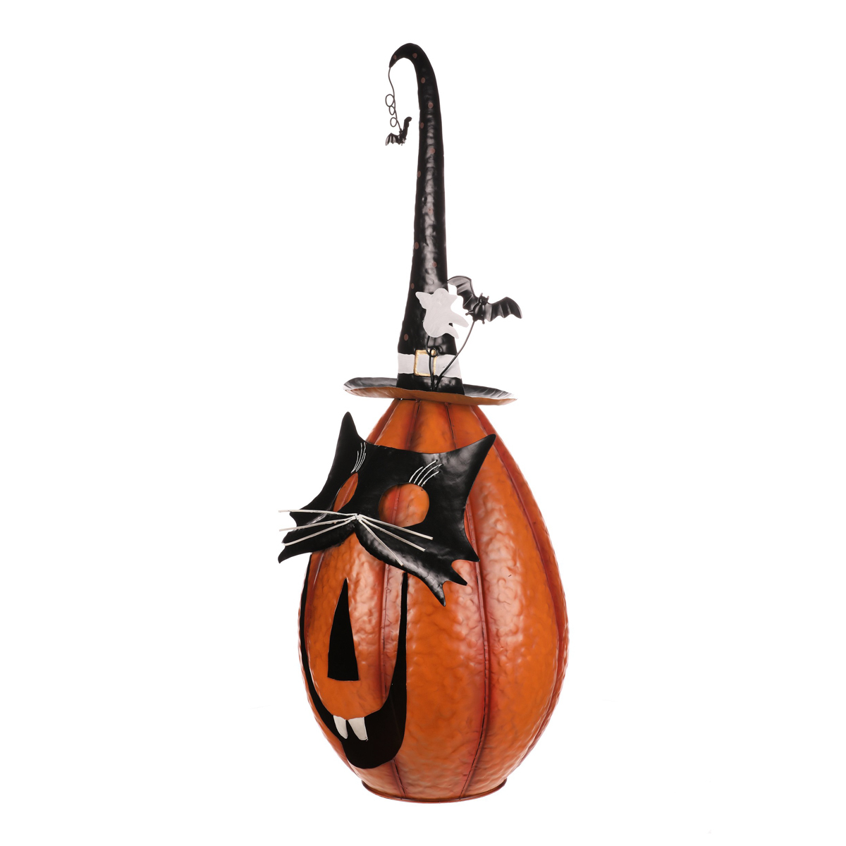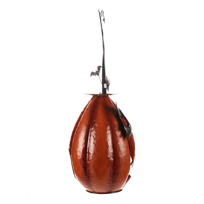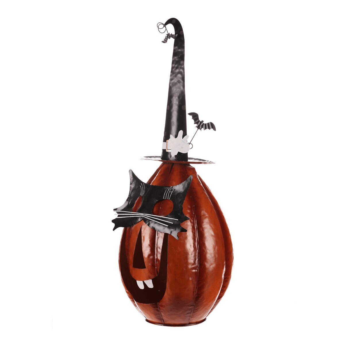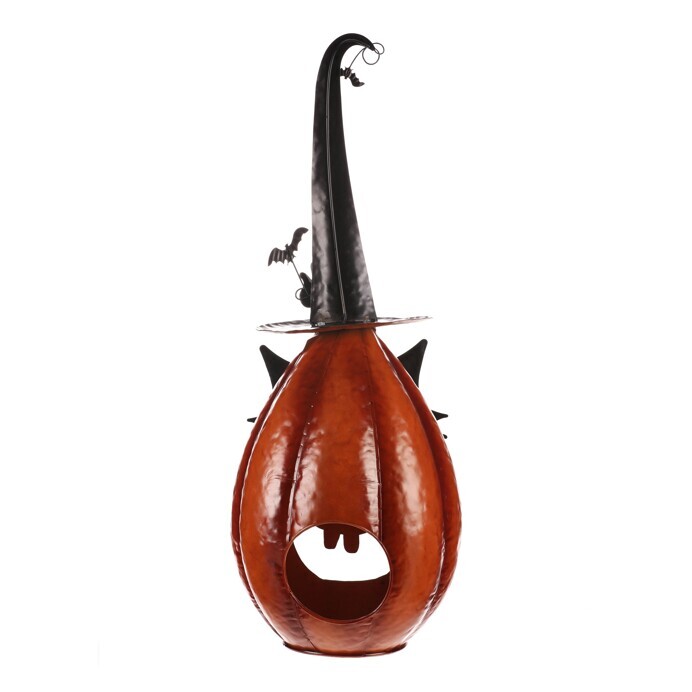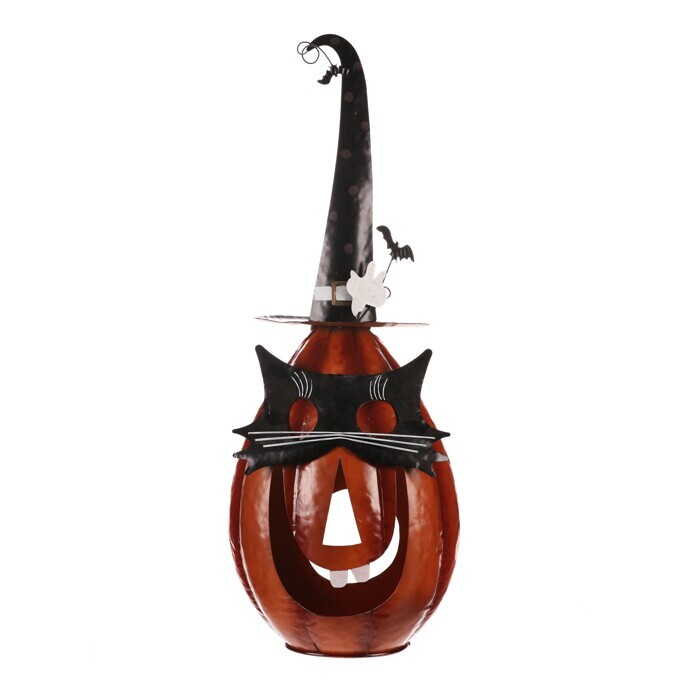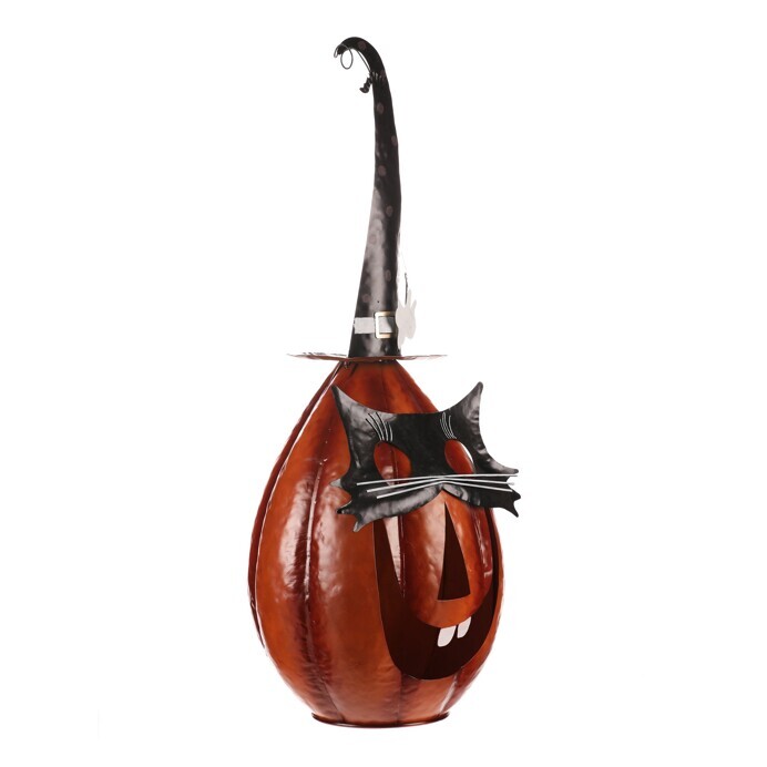 Oranžová kovová dýně se špičatým kloboukem a v kočičí masce sice vypadá strašidelně, ale její veselý výraz napoví, že to s tou hrůzou nebude tak zlé. Ideální dekorace na Halloween i podzimní večery, která potěší každého, kdo má rád trochu tajemna s úsměvem.