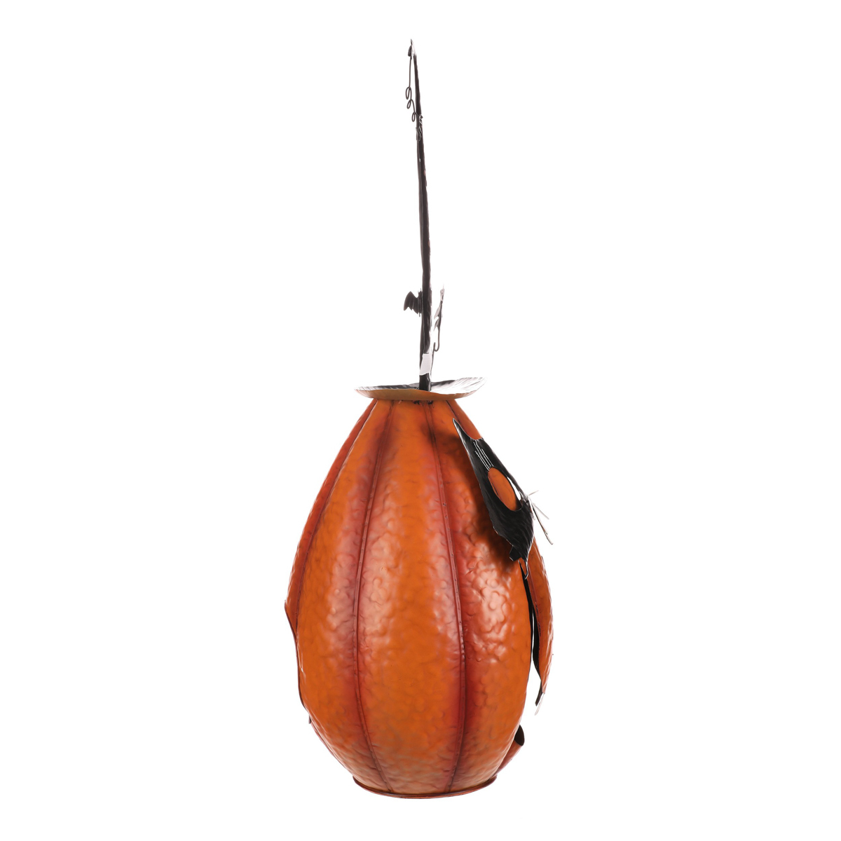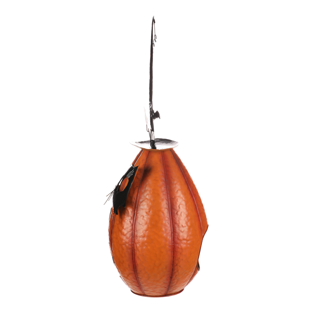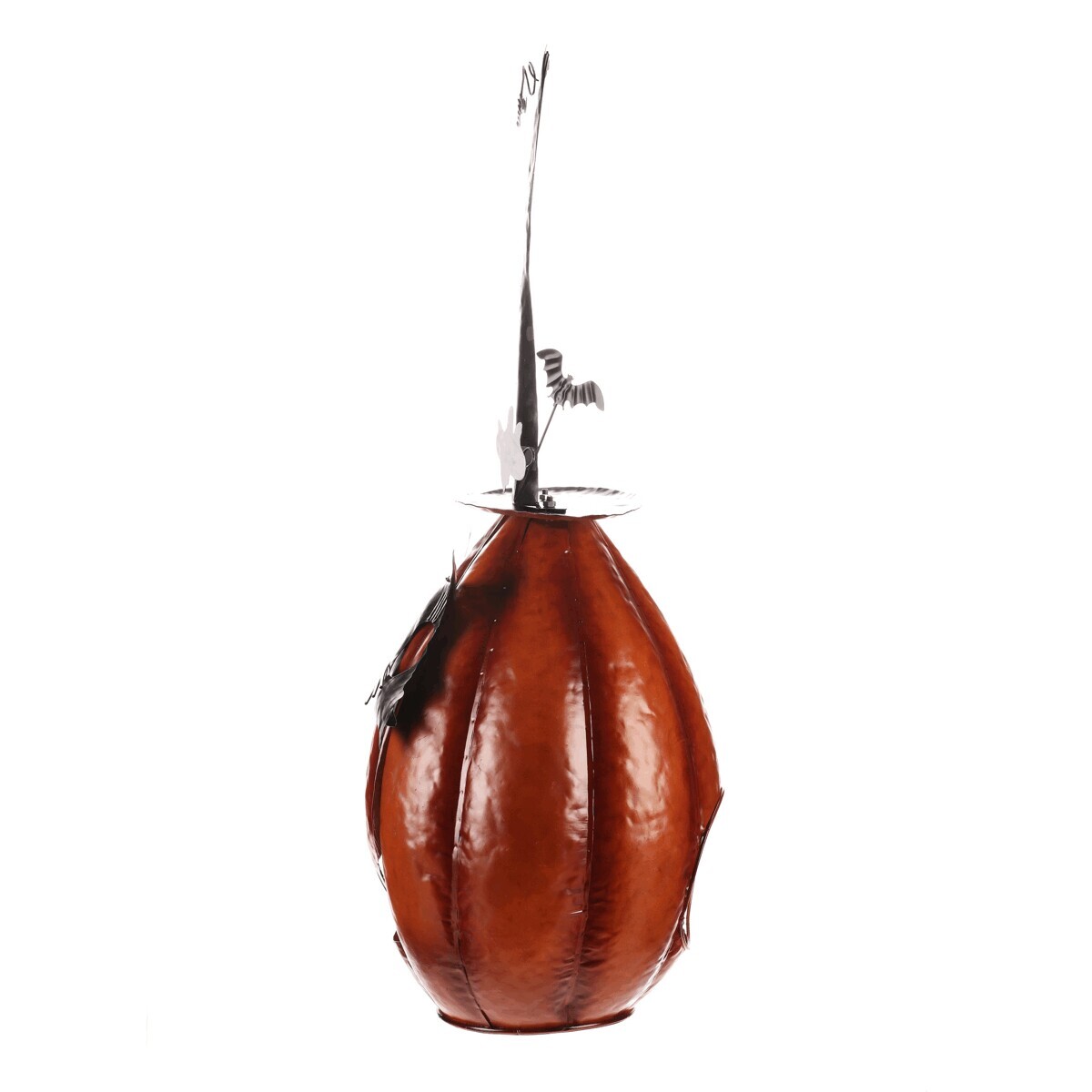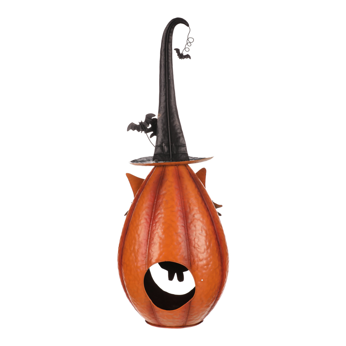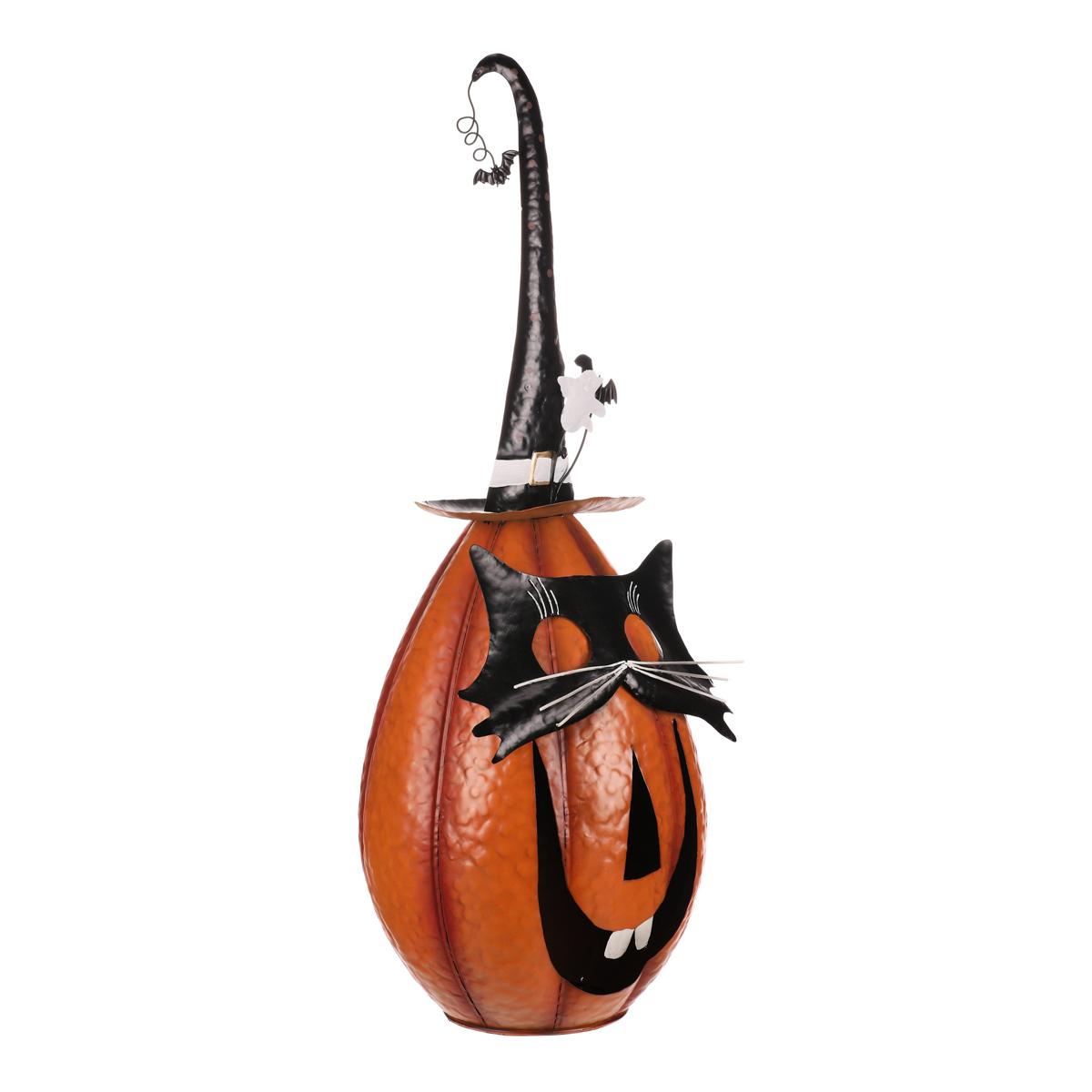Oranžová kovová dýně se špičatým kloboukem a v kočičí masce sice vypadá strašidelně, ale její veselý výraz napoví, že to s tou hrůzou nebude tak zlé. Ideální dekorace na Halloween i podzimní večery, která potěší každého, kdo má rád trochu tajemna s úsměvem.