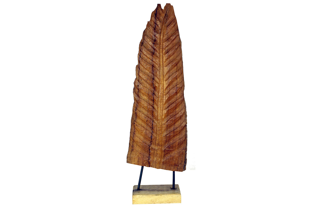 Dřevořezba na podstavci představuje dekorativní prvek vyrobený z přírodního dřeva v hnědých odstínech. Její detailní zpracování odhaluje výraznou texturu a tvar listu, který je umístěn na jednoduché dřevěné základně s kovovými podpěrami. Díky svému přírodnímu vzhledu a decentní velikosti je vhodná pro umístění na poličku, komodu nebo pracovní stůl, kde přispívá k příjemné atmosféře interiéru. Provedení umožňuje snadné postavení a stabilitu dekorace.