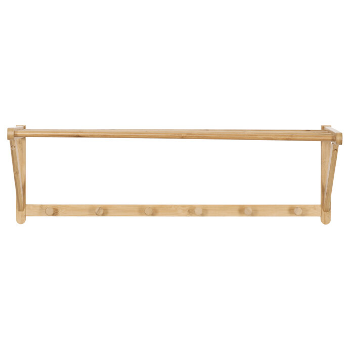 Nástěnná police s věšáky je vyrobena z masivního bambusu v přírodním odstínu, který přináší do interiéru příjemnou a teplou atmosféru. Police nabízí praktické horní místo pro odkládání drobných předmětů či dekorací, zatímco spodní část je vybavena šesti pevnými věšáky pro zavěšení kabátů, klobouků nebo tašek. Bambusové provedení se snadno udržuje a díky pevné montáži na stěnu zajišťuje stabilitu a dlouhou životnost. Design s hladce zaoblenými hranami a přírodní texturou materiálu podtrhuje jednoduchost a funkčnost produktu. Rozměry a nosnost odpovídají běžným požadavkům na domácí i kancelářské využití.