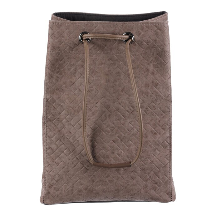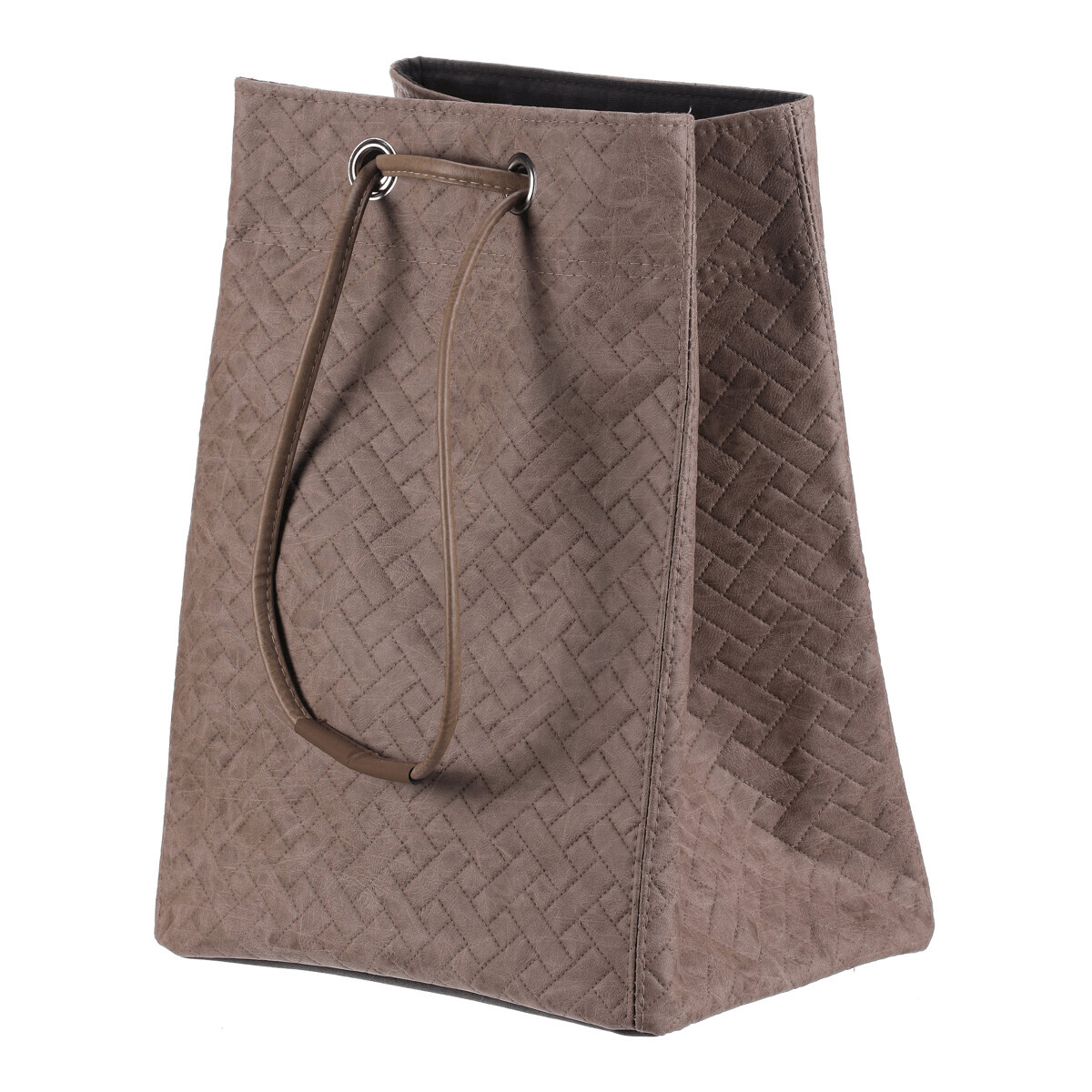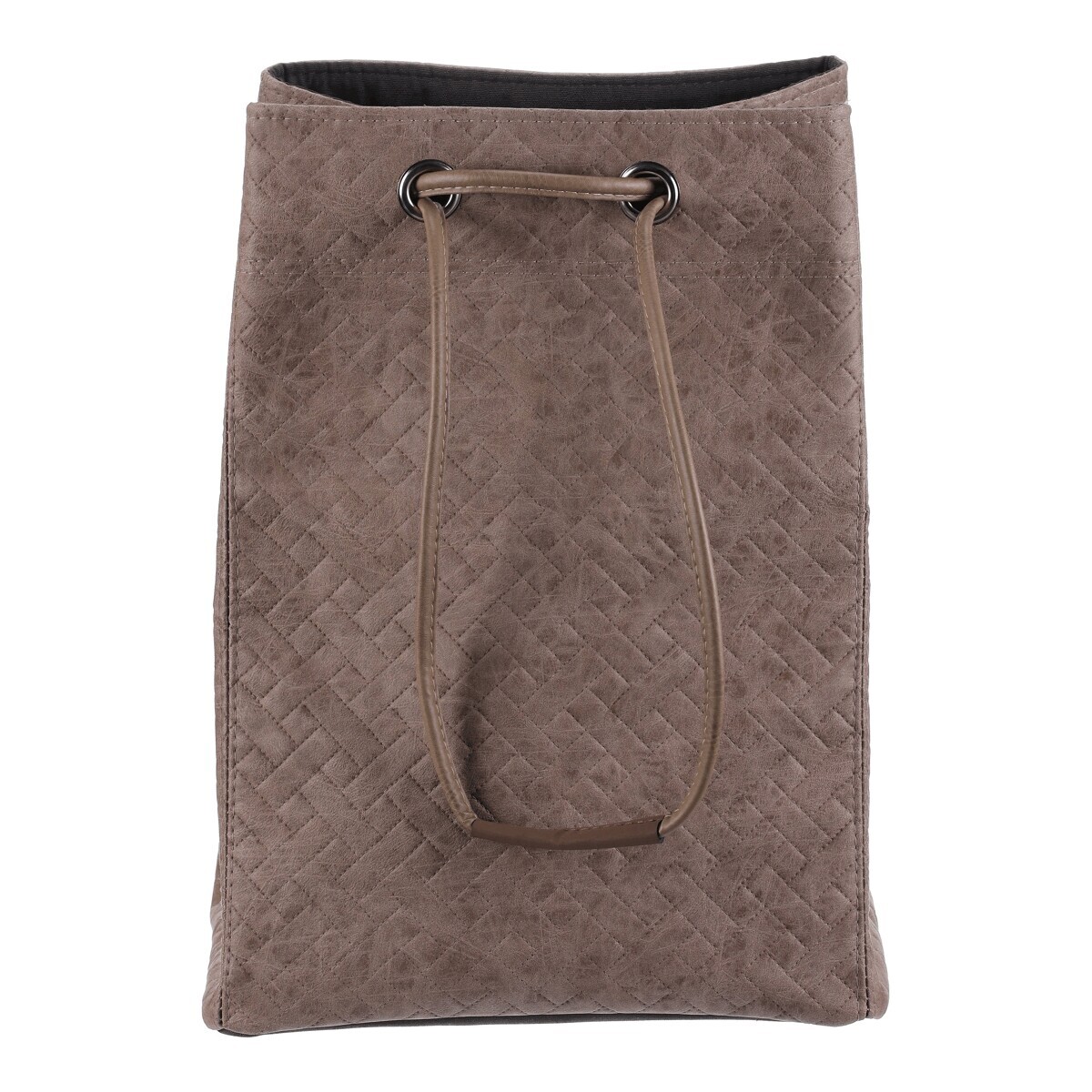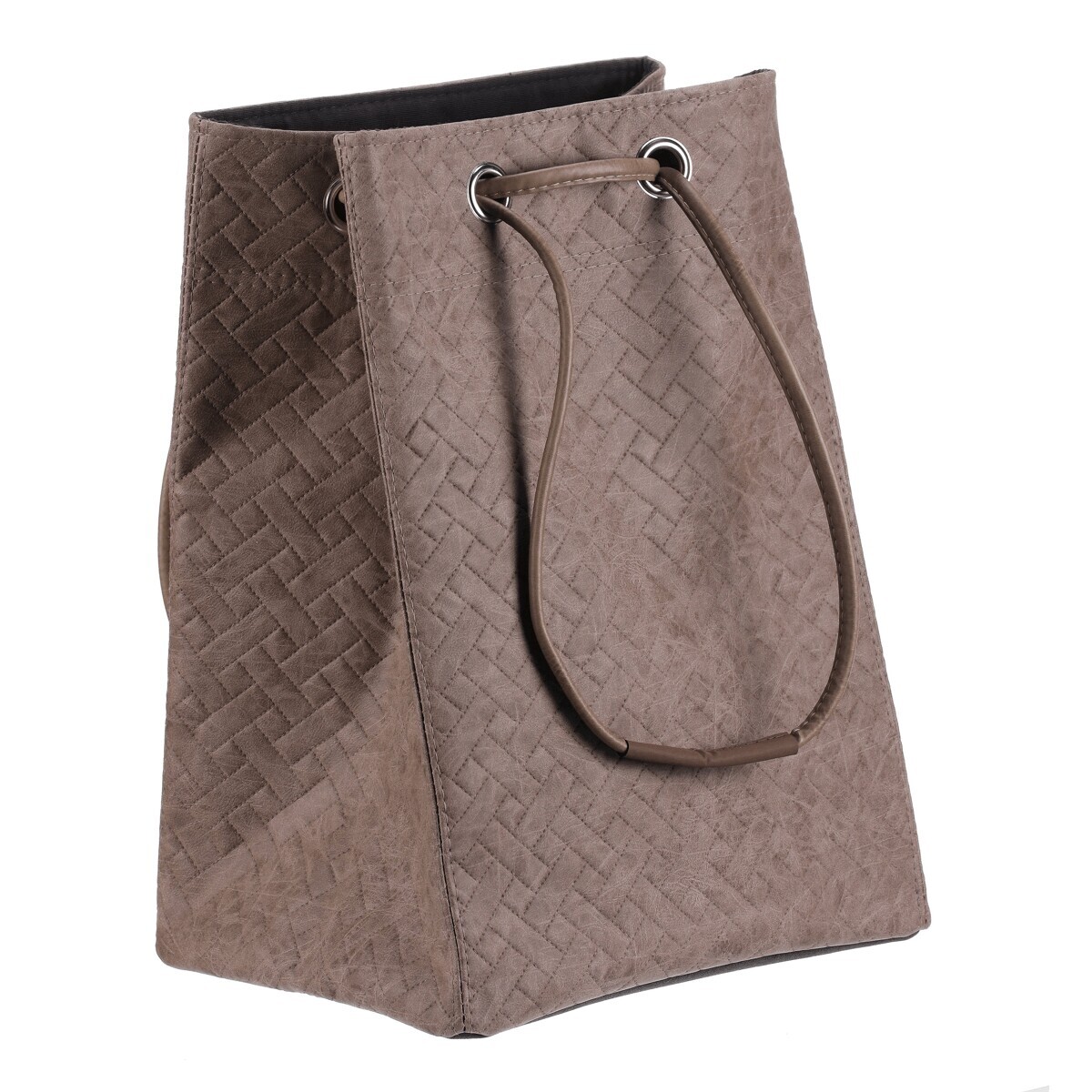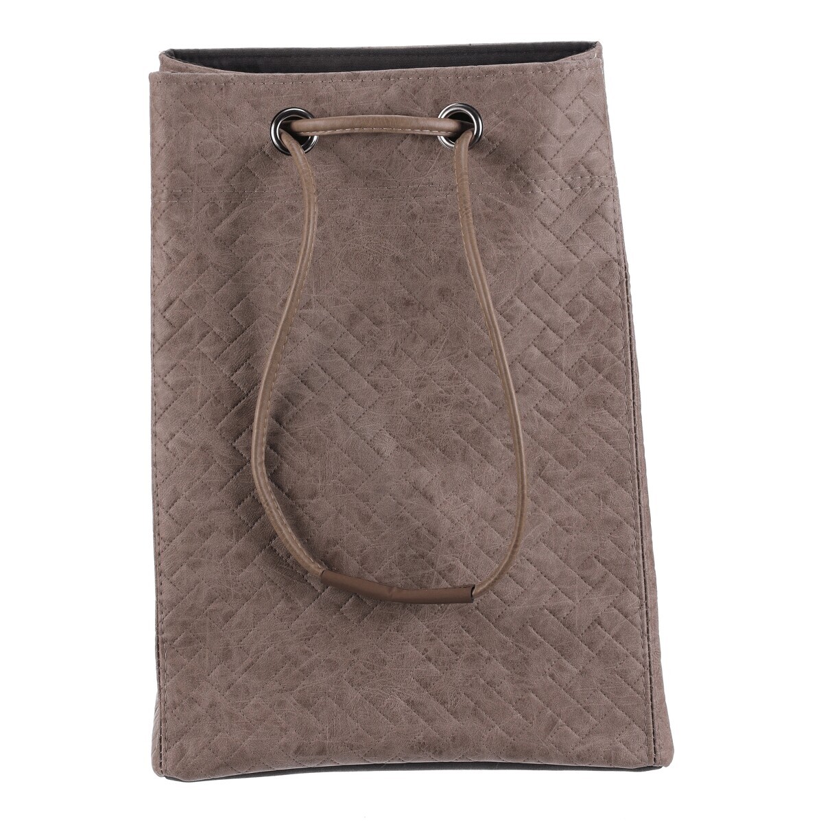 Látkový koš na prádlo ve tvaru praktického vaku zaujme moderním vzhledem i funkčností. Má jemnou hnědou barvu, koženkový povrch a horní část se snadno uzavírá pomocí stahovací šňůry. Díky lehké konstrukci se s ním dobře manipuluje, je dobře skladovatelný a v interiéru působí i jako stylový doplněk, není tak pouze úložným prostorem.