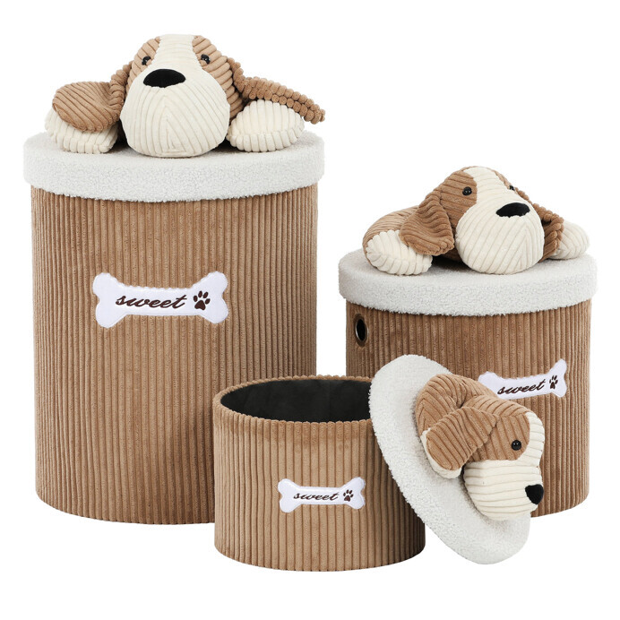 Sada tří látkových košů v hnědé barvě spojuje praktické využití s hravým designem. Mají měkký manšestrový povrch, kulatý tvar a víko zdobené roztomilým pejskem. Díky různým velikostem je snadno využijete jako regálové i prádelní koše. Ideální pro ukládání prádla, hraček nebo drobností. Zkrátka je to stylový pomocník, který zútulní každý interiér.
