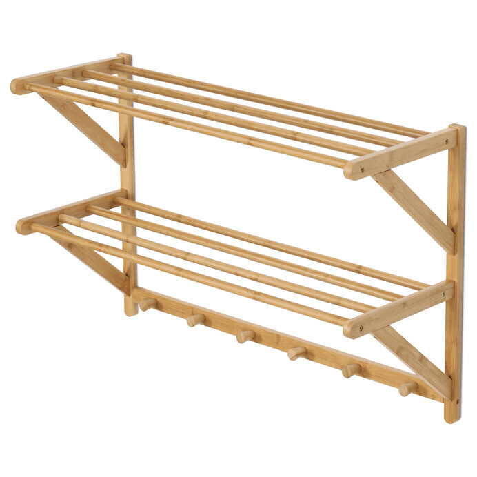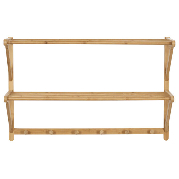 Nástěnná police s věšáky je vyrobena z masivního bambusu v přírodním odstínu, který přináší do interiéru příjemnou a svěží atmosféru. Police nabízí dvě úložné plochy tvořené pevnými tyčemi, které jsou vhodné pro odkládání drobných předmětů či textilu. Spodní část je vybavena šesti kulatými věšáky, které umožňují praktické zavěšení kabátů, klobouků nebo tašek. Díky kvalitnímu zpracování a stabilnímu uchycení na stěnu je police vhodná pro vstupní haly, chodby i ložnice. Přírodní bambus se snadno udržuje a je navržen pro dlouhou životnost.