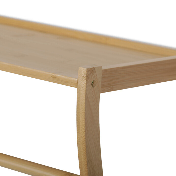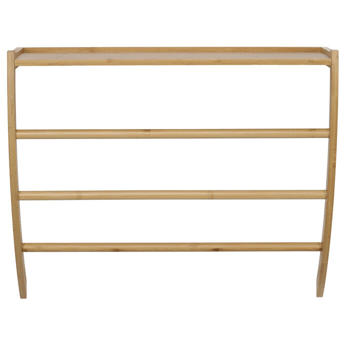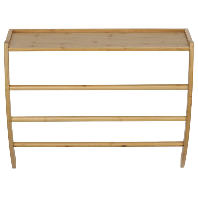 Nástěnná police z masivního bambusu v přírodním odstínu kombinuje funkčnost s přírodním vzhledem. Její elegantní obloukový tvar a dvě vodorovné tyče pod policí umožňují praktické zavěšení drobných předmětů nebo textilií. Povrch bambusu je hladký a snadno udržovatelný, což zajišťuje dlouhou životnost a přirozený vzhled. Police je vhodná pro umístění v chodbě, koupelně nebo obývacím pokoji, kde poslouží jako stylový a praktický doplněk interiéru.