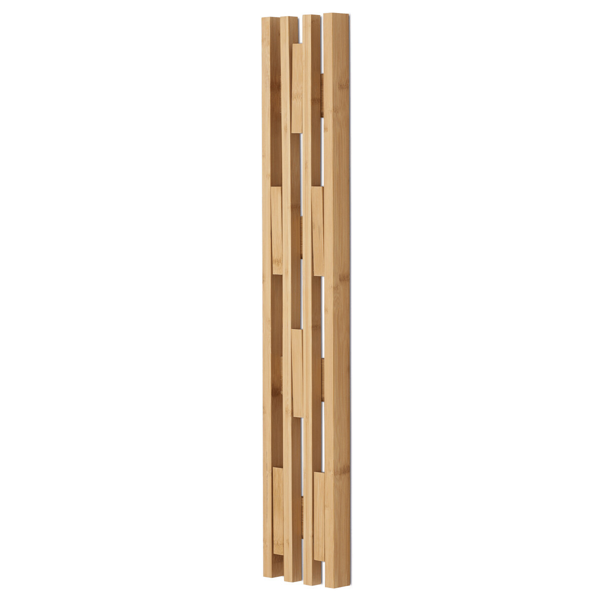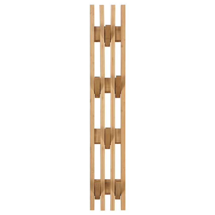 Nástěnný věšák z masivního bambusu v přírodním odstínu nabízí praktické a prostorově úsporné řešení pro zavěšení oděvů či doplňků. Skládací design umožňuje snadné rozložení a opětovné složení podle potřeby, což šetří místo v interiéru. Věšák je tvořen čtyřmi vertikálními lištami s pevně připevněnými háčky, které jsou rozmístěny ve třech úrovních pro pohodlné zavěšení různých předmětů. Bambusové provedení zajišťuje pevnost a stabilitu, zároveň materiál snadno udržuje přirozený vzhled a je odolný vůči běžnému opotřebení. Kompaktní rozměry a jednoduchý montážní systém umožňují jeho využití v předsíních, koupelnách nebo kancelářích.