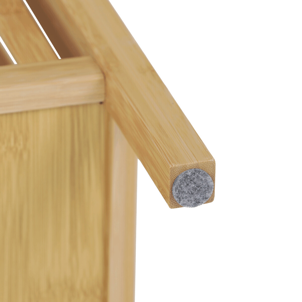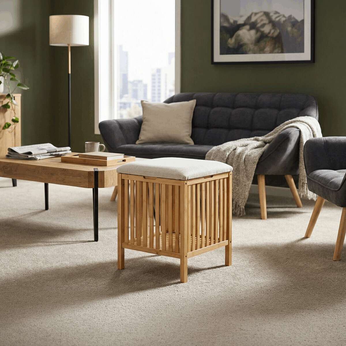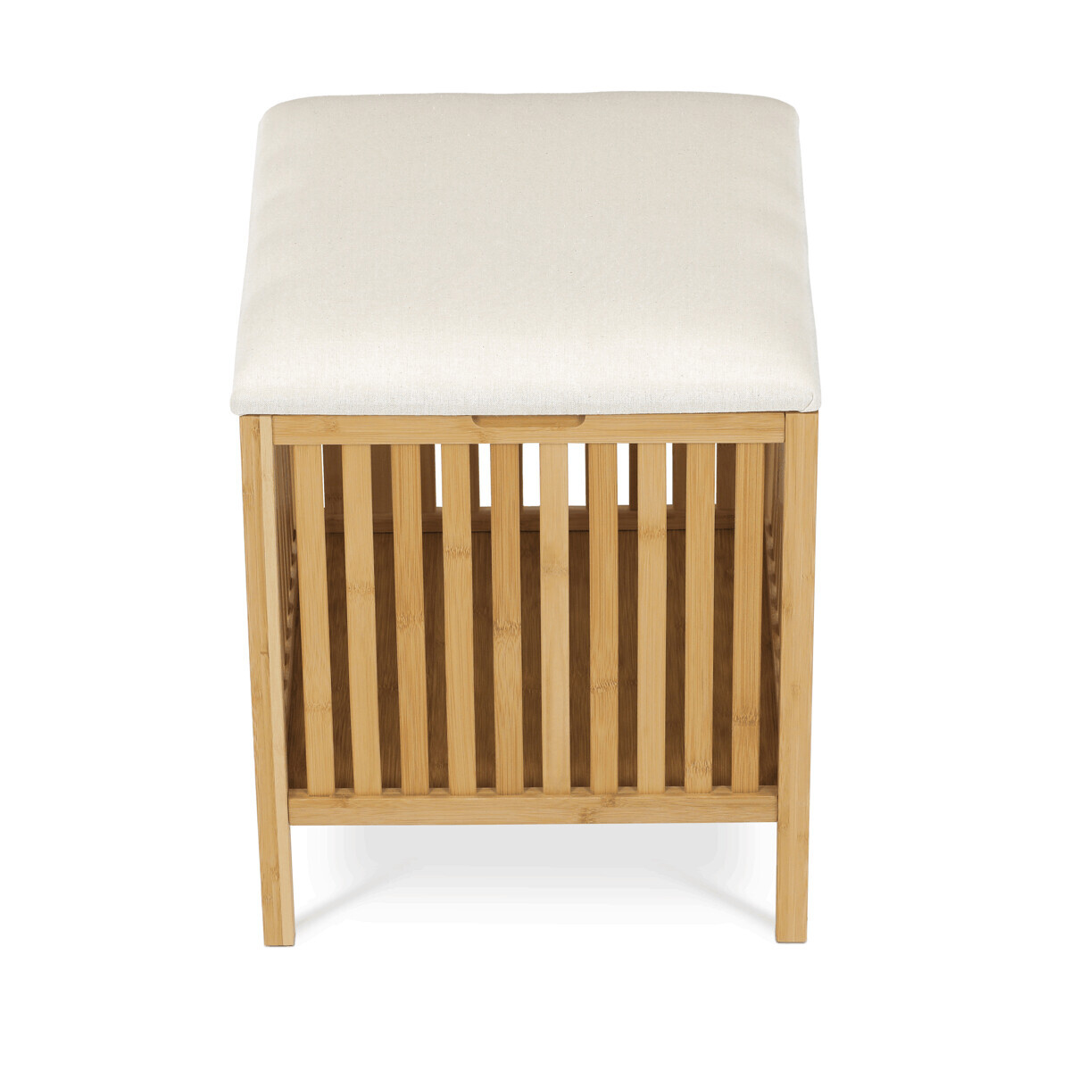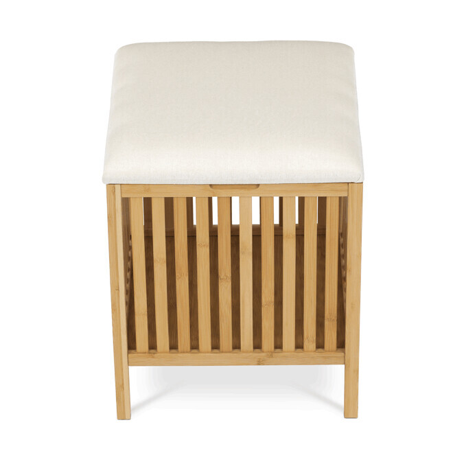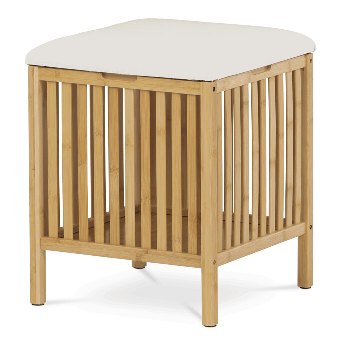 Taburet z masivního bambusu v přírodním odstínu kombinuje praktický úložný prostor s možností sezení díky polstrovanému sedáku v jemné bílé barvě. Bambusové lamely tvoří pevnou a vzdušnou základnu, která umožňuje cirkulaci vzduchu uvnitř koše. Polstrovaný sedák je potažený látkou, která se snadno udržuje a zvyšuje komfort při sezení. Díky svému přírodnímu vzhledu se hodí do různých interiérů, kde přináší přírodní atmosféru a funkčnost v jednom.