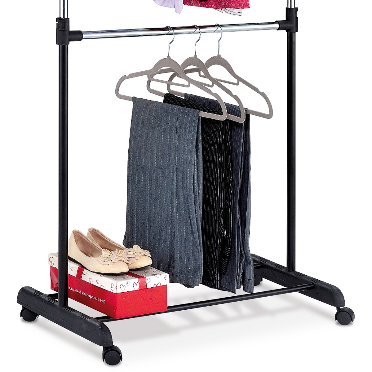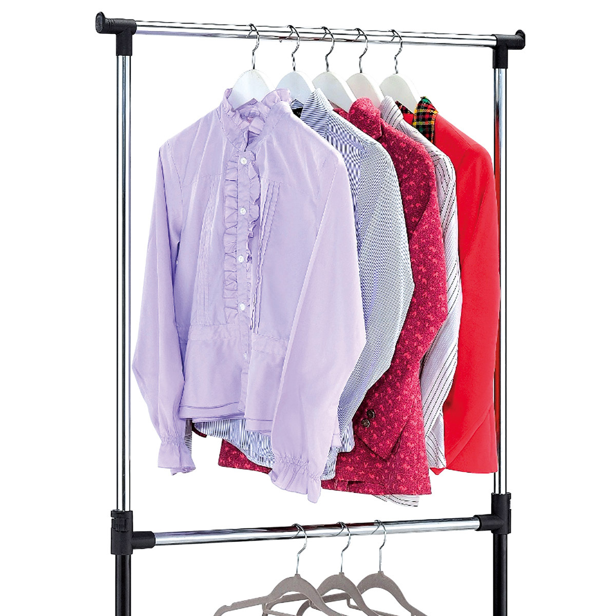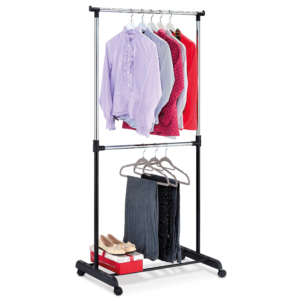 Dvojramenný stojan na šaty v černém provedení kombinuje kovové a plastové části s chromovanými prvky, které zajišťují stabilitu a moderní vzhled. Horní tyč je určena pro zavěšení košil, bund či šatů, zatímco spodní tyč nabízí prostor pro zavěšení kalhot nebo sukní. Pevná základna je vybavena kolečky pro snadnou manipulaci a přemístění v interiéru. Praktický odkladač ve spodní části umožňuje uložení bot nebo krabic, což přispívá k lepší organizaci prostoru. Stojan je navržen tak, aby poskytoval dostatek místa pro oděvy a zároveň byl stabilní a snadno přemístitelný.