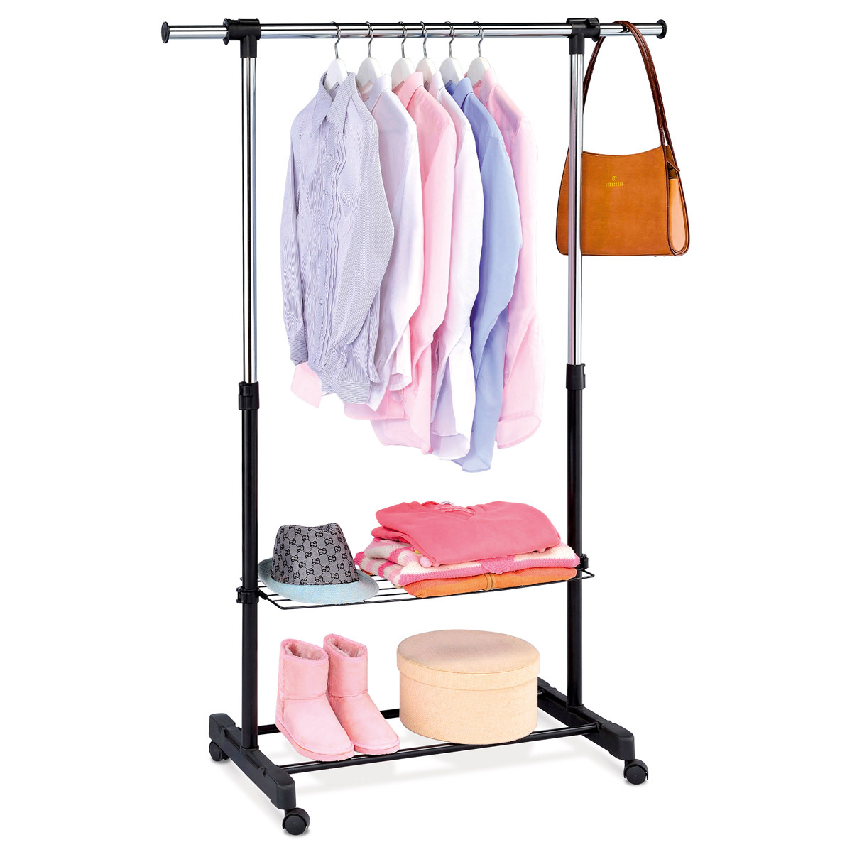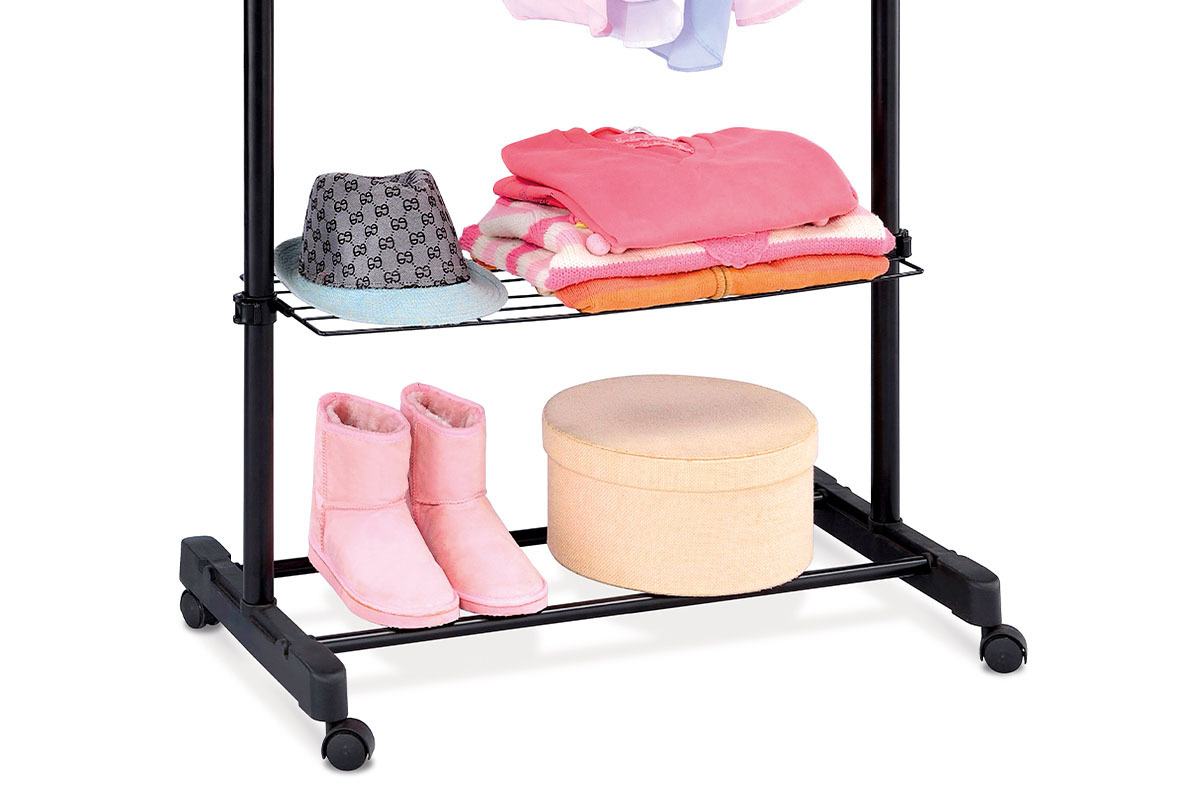 Stojan na šaty s odkladačem a poličkou v černém provedení kombinuje pevný kovový rám s chromovanými prvky pro moderní vzhled a dlouhou životnost. Výškově nastavitelná tyč umožňuje zavěšení oblečení různých délek, zatímco spodní drátěná polička nabízí prostor pro uskladnění bot nebo dalších doplňků. Praktický odkladač na boku je vhodný pro zavěšení tašek či šál. Stojan je vybaven čtyřmi kolečky pro snadnou manipulaci a stabilní základnou, která zajišťuje bezpečné postavení i při plném zatížení. Díky kombinaci kovu a plastu je snadno udržovatelný a vhodný do domácností i komerčních prostor.