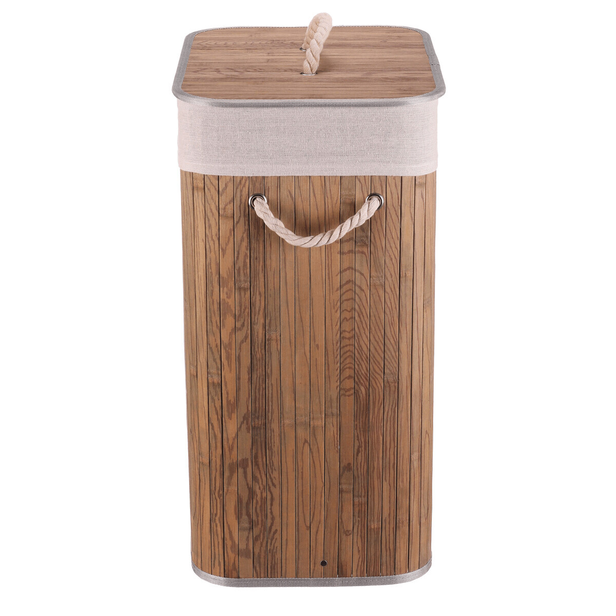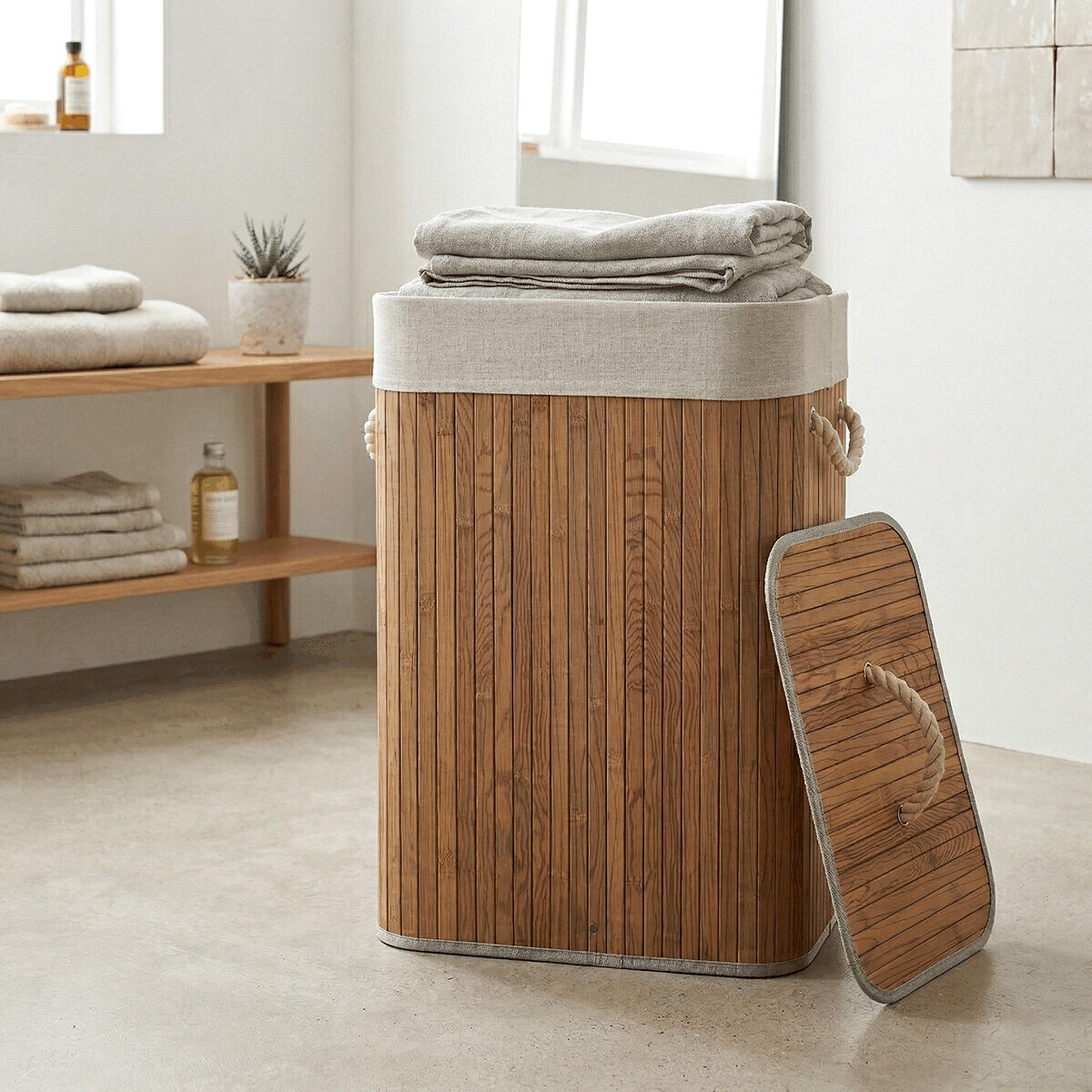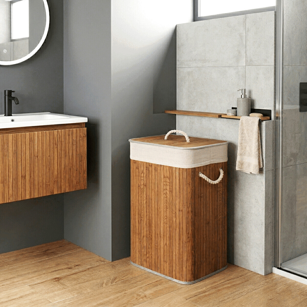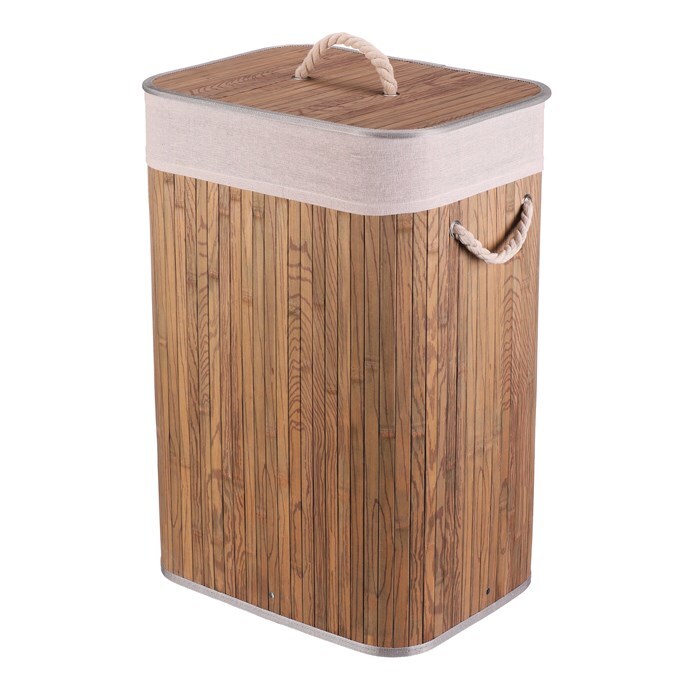 Prádelní koš z bambusu v tmavě šedém odstínu nabízí praktické řešení pro uskladnění prádla s přírodním vzhledem. Koš je opatřen víkem a dvěma pevnými úchyty z provazu pro snadnou manipulaci. Bambusové lamely jsou uspořádány vertikálně a doplněny textilním lemem v šedé barvě, který zjemňuje celkový design. Díky použitým materiálům je koš pevný a navržený pro dlouhou životnost, přičemž bambus se snadno udržuje. Je vhodný do koupelen, ložnic i prádelních místností, kde přispívá k uklizenému a stylovému prostředí.