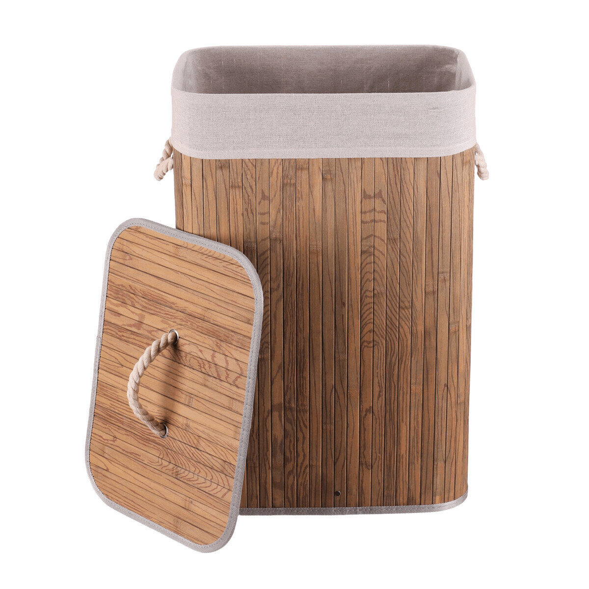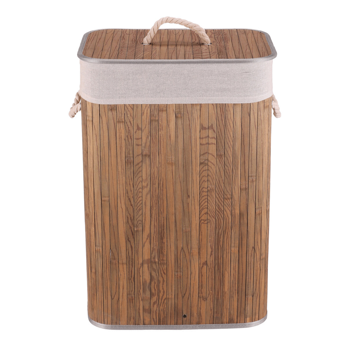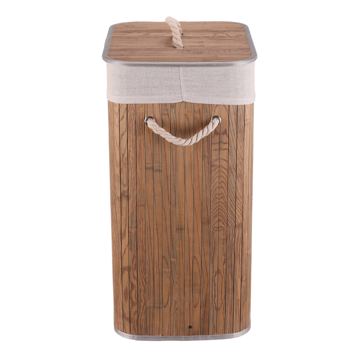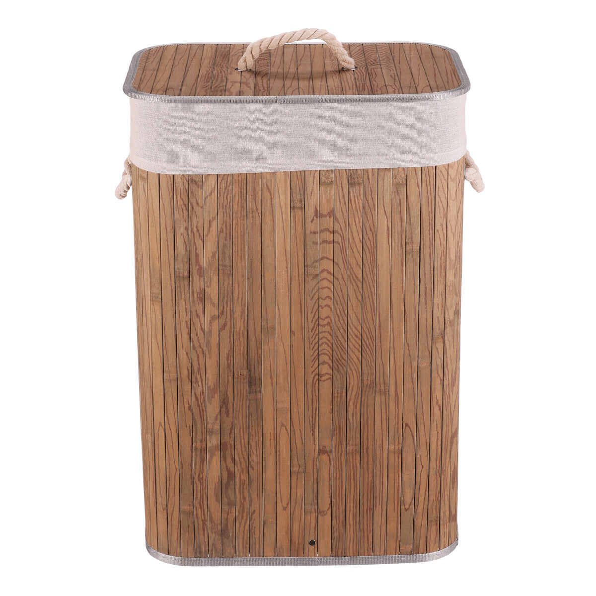 Prádelní koš z bambusu v tmavě šedém odstínu nabízí praktické řešení pro uskladnění prádla s přírodním vzhledem. Koš je opatřen víkem a dvěma pevnými úchyty z provazu pro snadnou manipulaci. Bambusové lamely jsou uspořádány vertikálně a doplněny textilním lemem v šedé barvě, který zjemňuje celkový design. Díky použitým materiálům je koš pevný a navržený pro dlouhou životnost, přičemž bambus se snadno udržuje. Je vhodný do koupelen, ložnic i prádelních místností, kde přispívá k uklizenému a stylovému prostředí.
