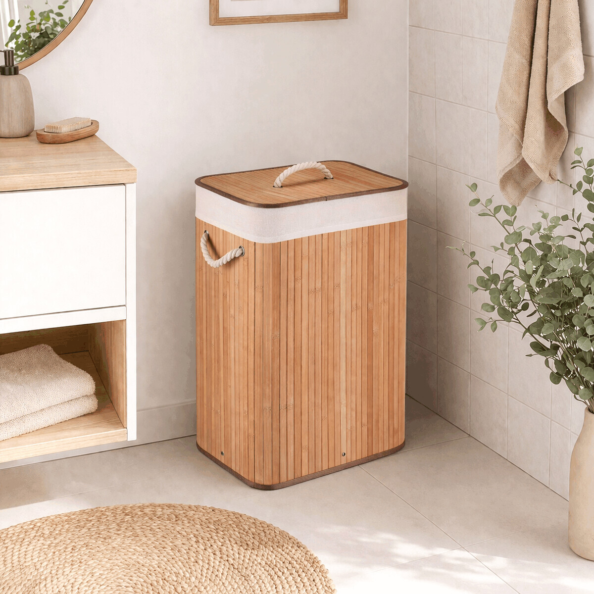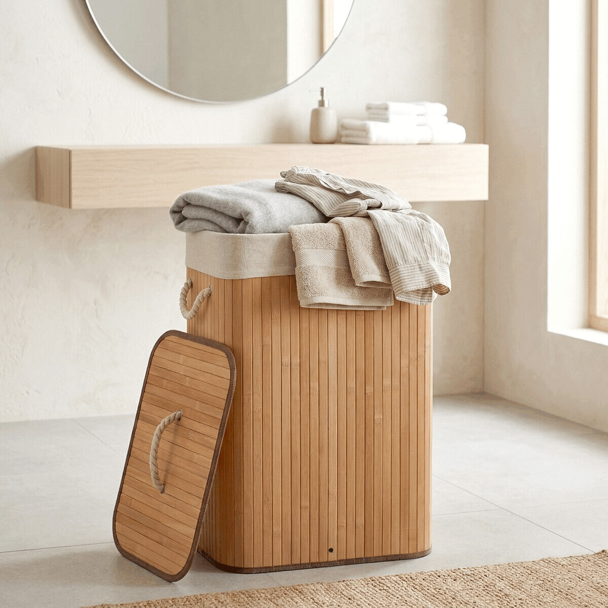 Prádelní koš z bambusu v přírodním odstínu nabízí praktické a estetické řešení pro uskladnění prádla. Jeho tělo je tvořeno tenkými bambusovými lamelami, které dodávají koši pevnost a zároveň lehkost. Vrchní víko je opatřeno pevnou rukojetí z přírodního provazu, stejně jako boční úchyty, které usnadňují manipulaci a přenášení. Koš je vhodný do koupelen i ložnic, kde díky svému přírodnímu vzhledu přispívá k příjemné atmosféře. Kompaktní rozměry umožňují snadné umístění i v menších prostorách.