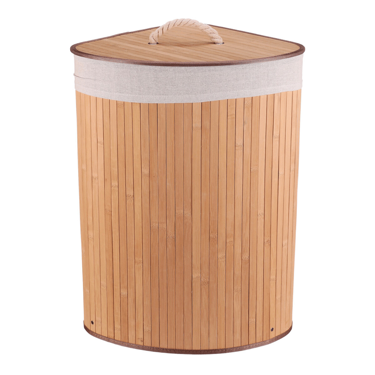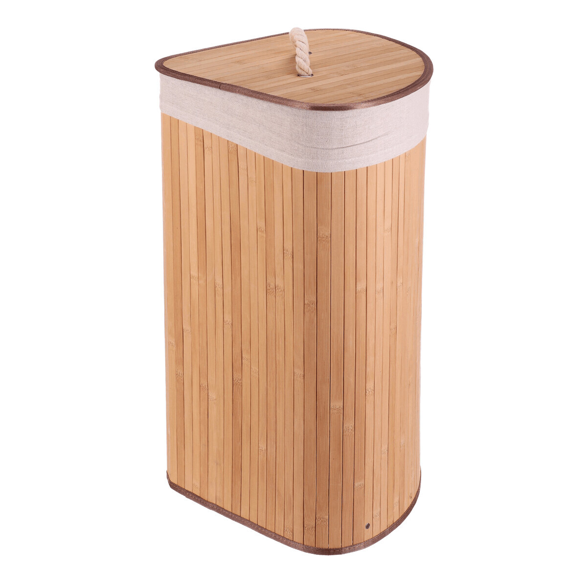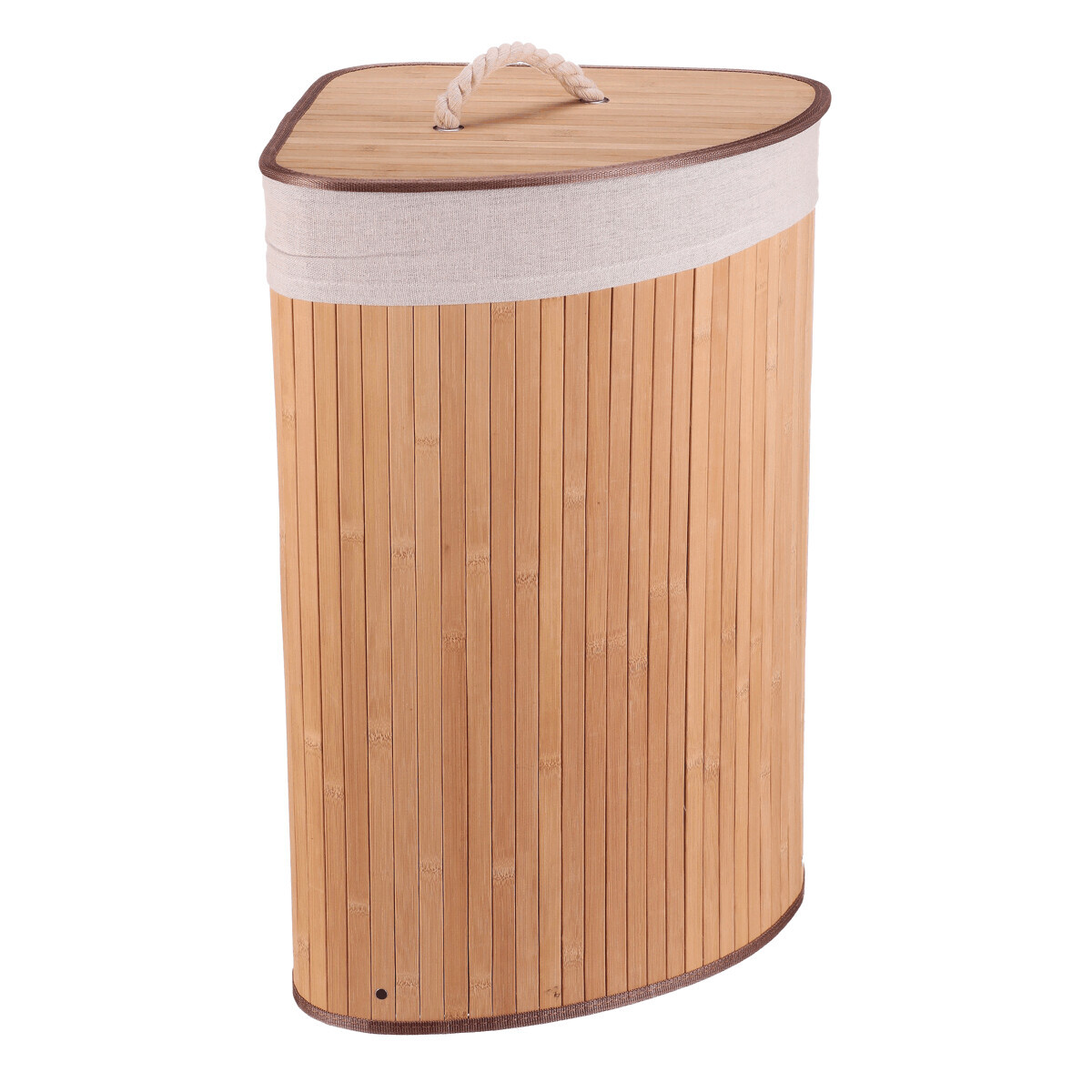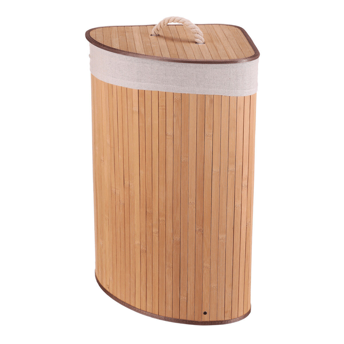 Rohový prádelní koš z bambusu v přírodním odstínu nabízí praktické a estetické řešení pro ukládání prádla. Jeho pevné bambusové lamely jsou uspořádány vertikálně a vytvářejí stabilní a lehkou konstrukci, která zároveň působí vzdušně. Koš je doplněn víkem s praktickým úchytem z pevného provazu, který usnadňuje manipulaci a zároveň zabraňuje úniku pachů. V horní části je lemovaný textilní pás v přírodní barvě, který dodává jemný kontrast a chrání okraje. Díky rohovému tvaru efektivně využívá prostor v místnosti a hodí se zejména do koupelen či šaten.