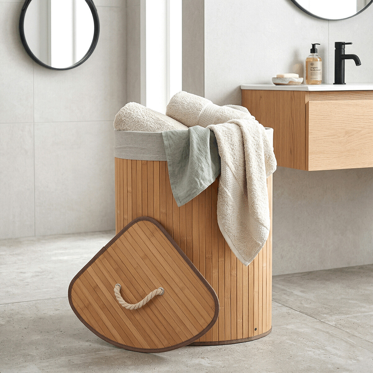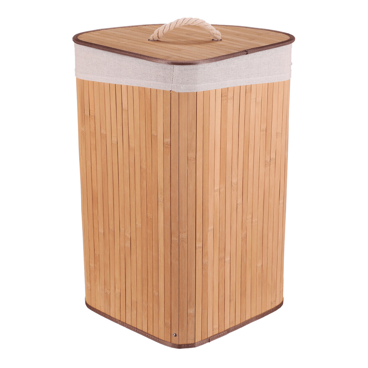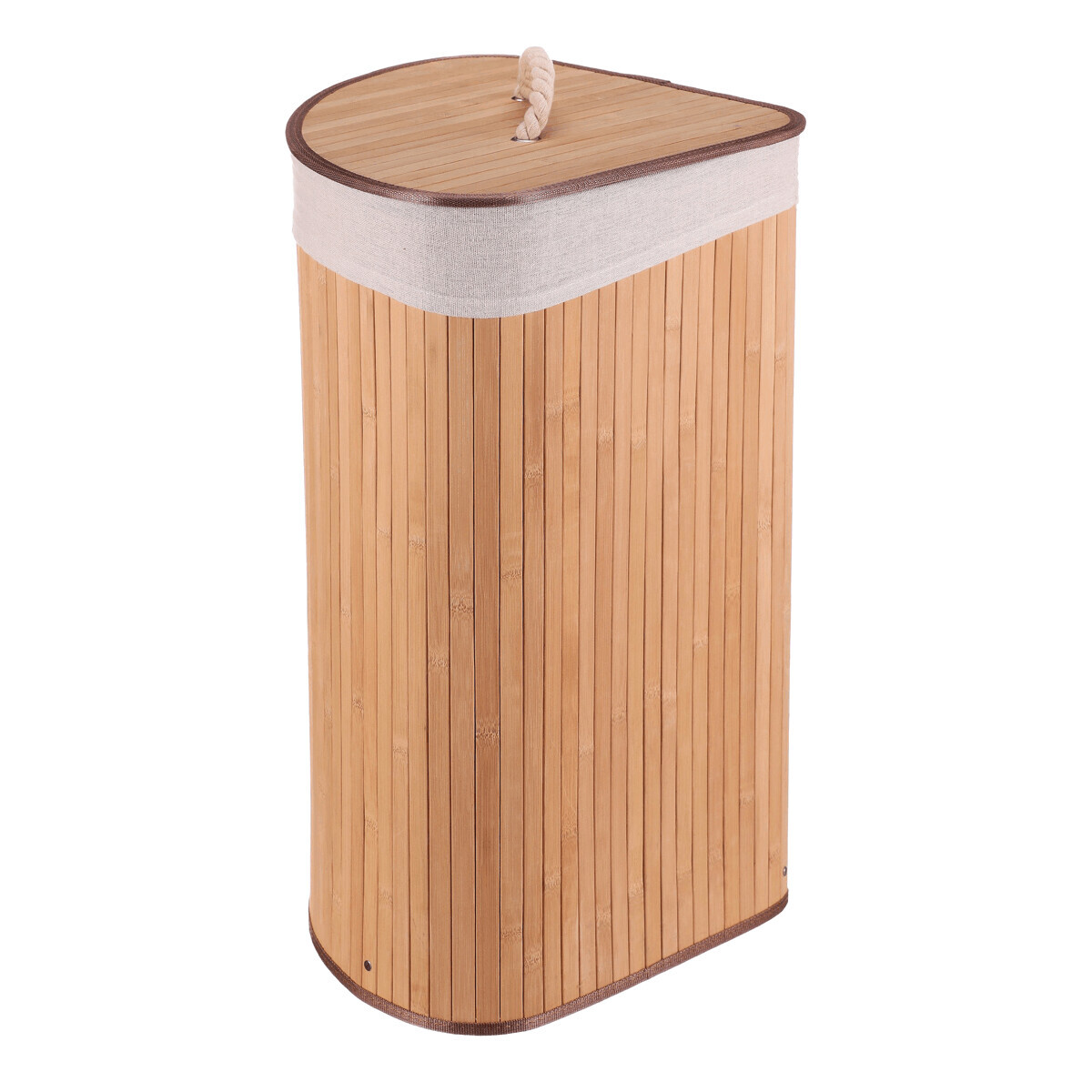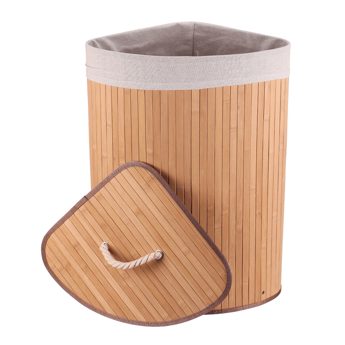 Rohový prádelní koš z bambusu v přírodním odstínu nabízí praktické a estetické řešení pro ukládání prádla. Jeho pevné bambusové lamely jsou uspořádány vertikálně a vytvářejí stabilní a lehkou konstrukci, která zároveň působí vzdušně. Koš je doplněn víkem s praktickým úchytem z pevného provazu, který usnadňuje manipulaci a zároveň zabraňuje úniku pachů. V horní části je lemovaný textilní pás v přírodní barvě, který dodává jemný kontrast a chrání okraje. Díky rohovému tvaru efektivně využívá prostor v místnosti a hodí se zejména do koupelen či šaten.