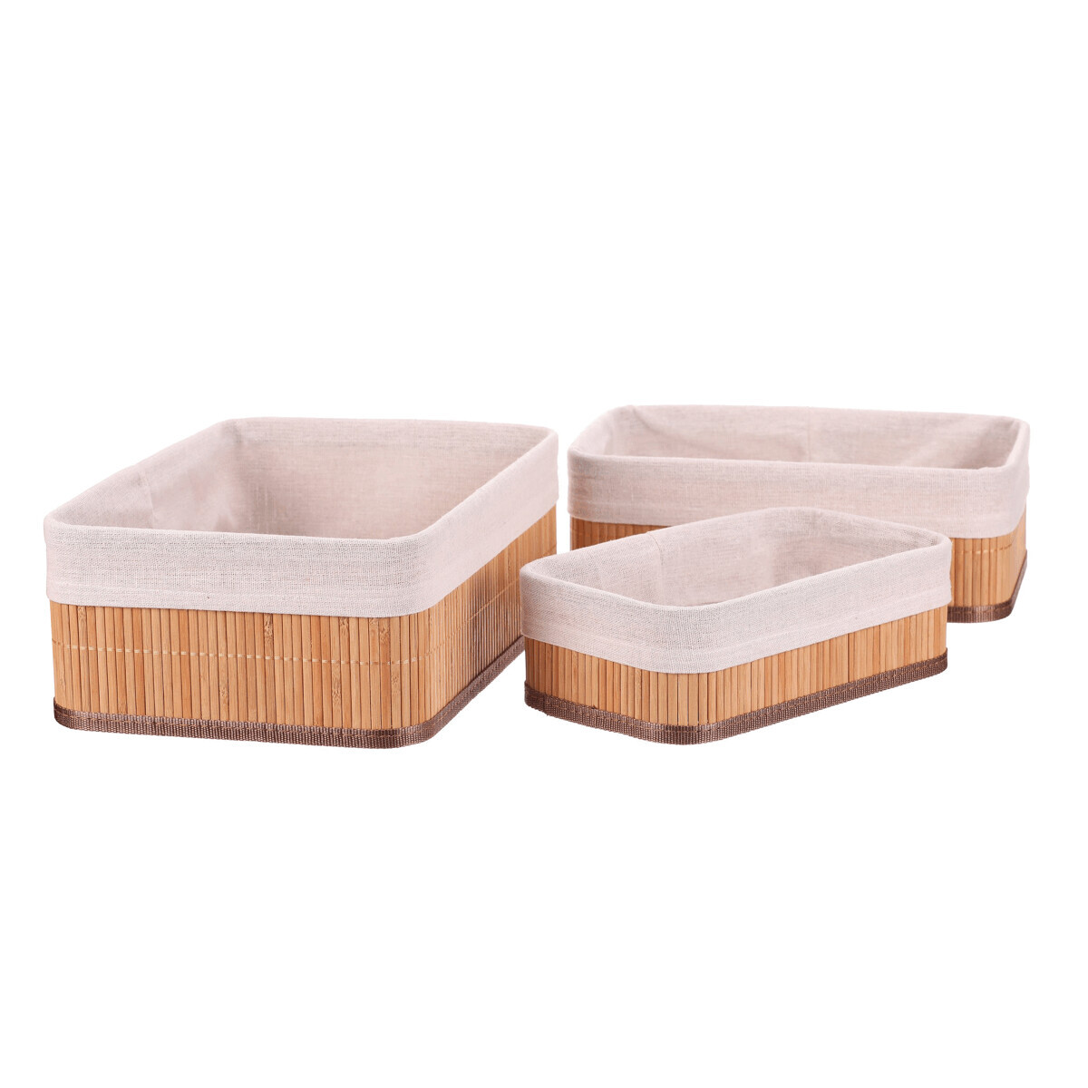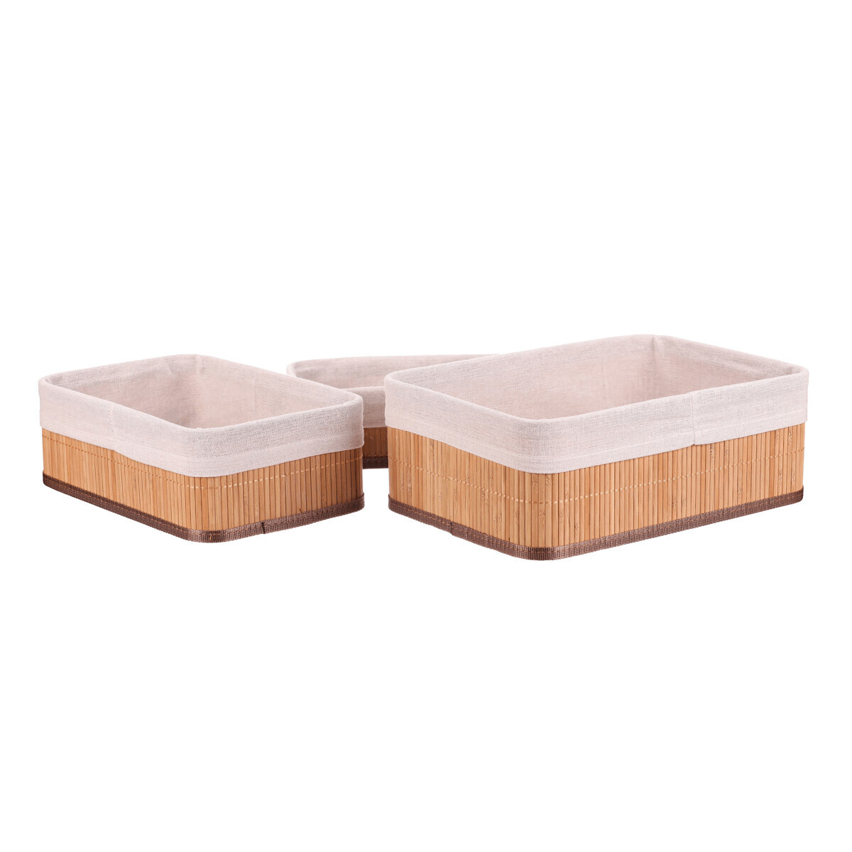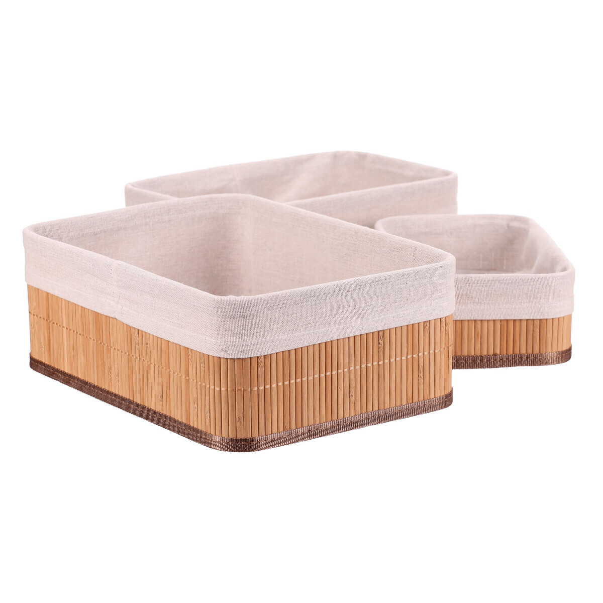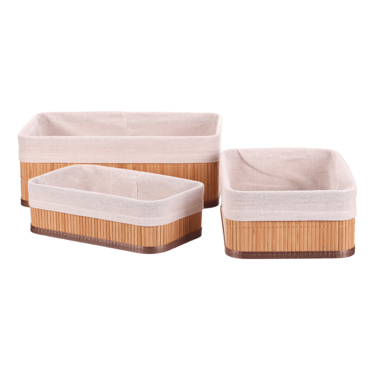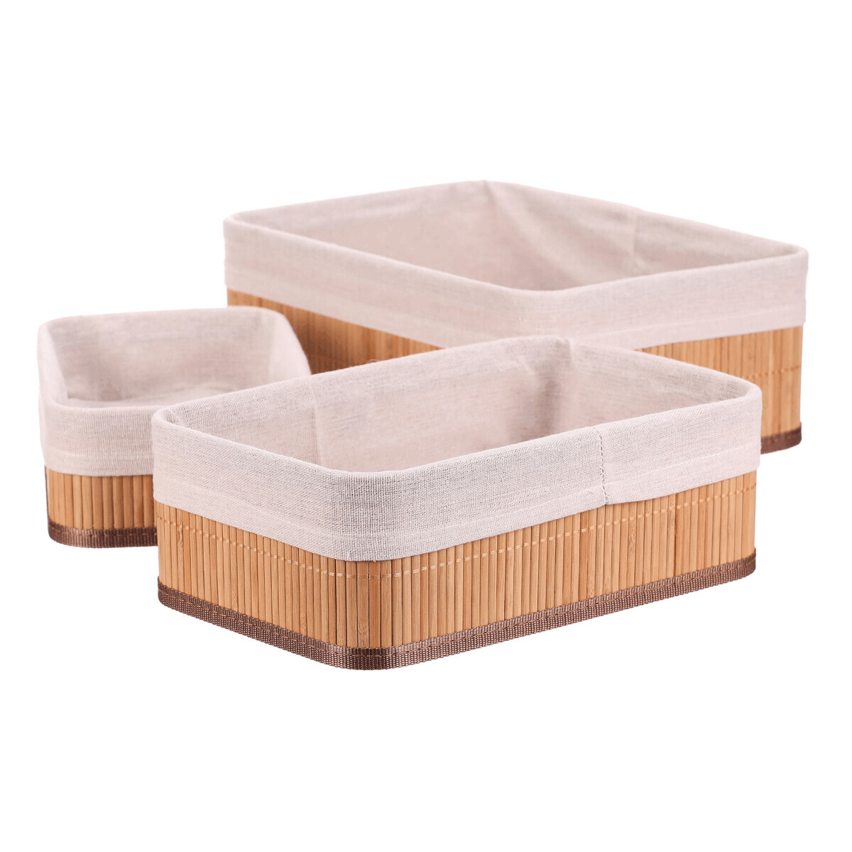 Sada tří regálových košů z přírodního bambusu nabízí praktické a estetické řešení pro organizaci prostoru. Koše mají pevné tělo z bambusových prutů, které je doplněno textilní vložkou v jemném béžovém odstínu, jež chrání uložené předměty a usnadňuje údržbu. Různé velikosti košů umožňují flexibilní využití v regálech, skříních nebo na pracovních stolech. Přírodní materiály přinášejí do interiéru teplý a přirozený vzhled, který se hodí do různých stylů bydlení. Koše jsou lehké a snadno přemístitelné, což zvyšuje jejich funkčnost v každodenním používání.