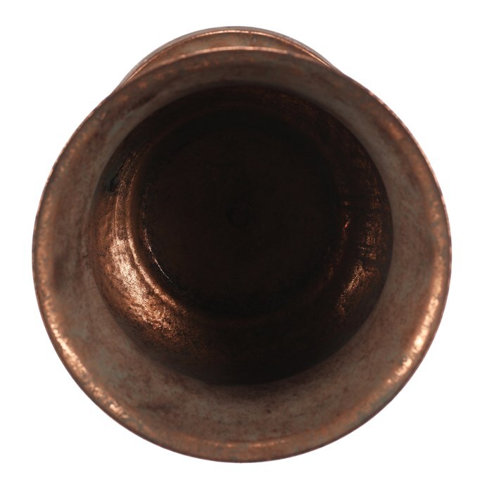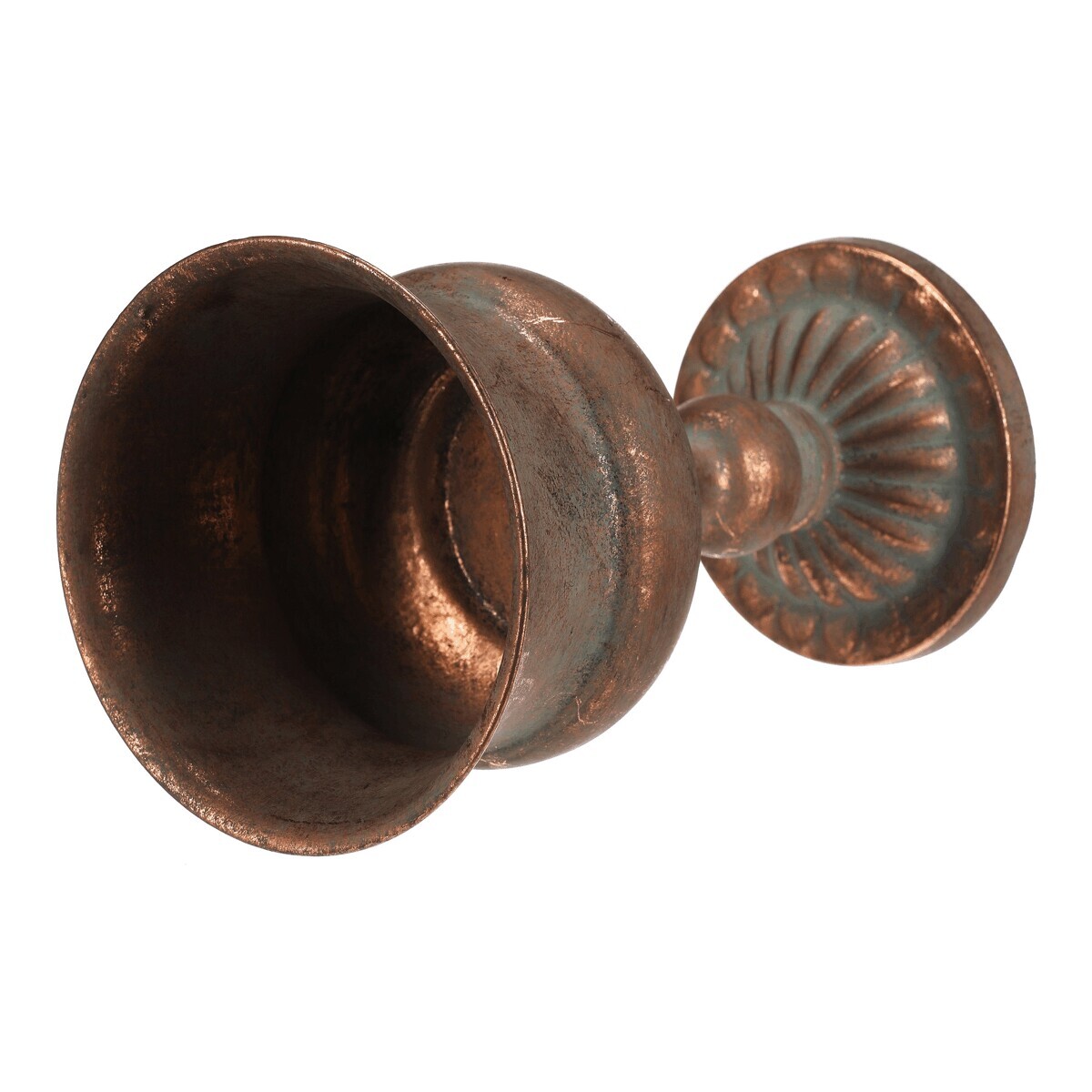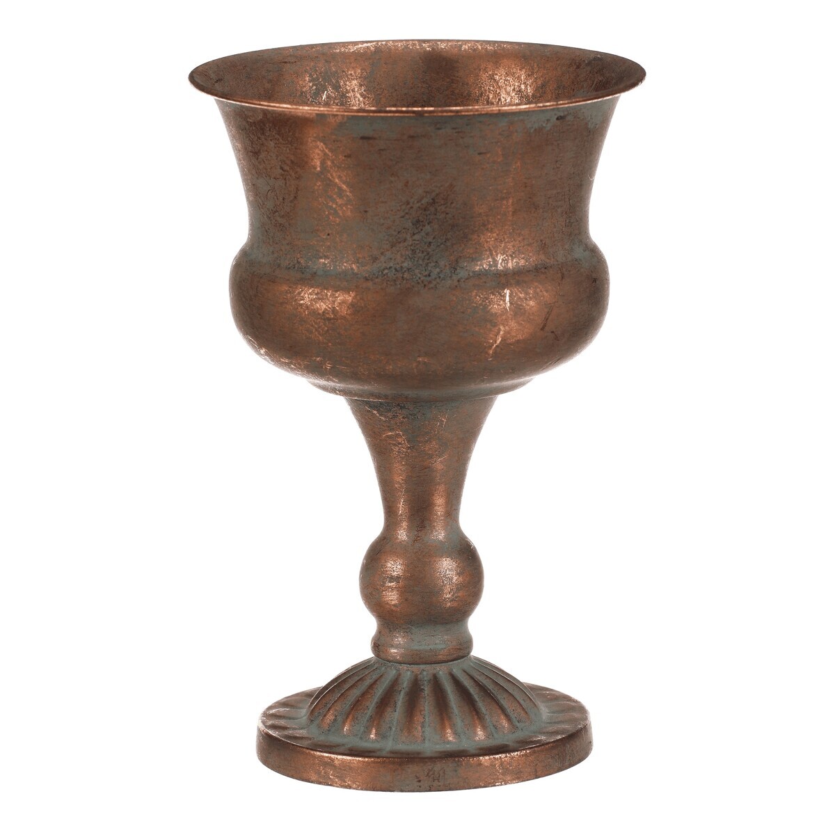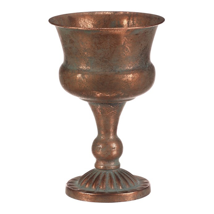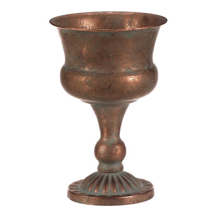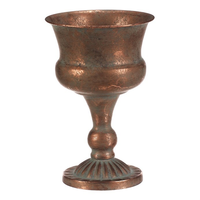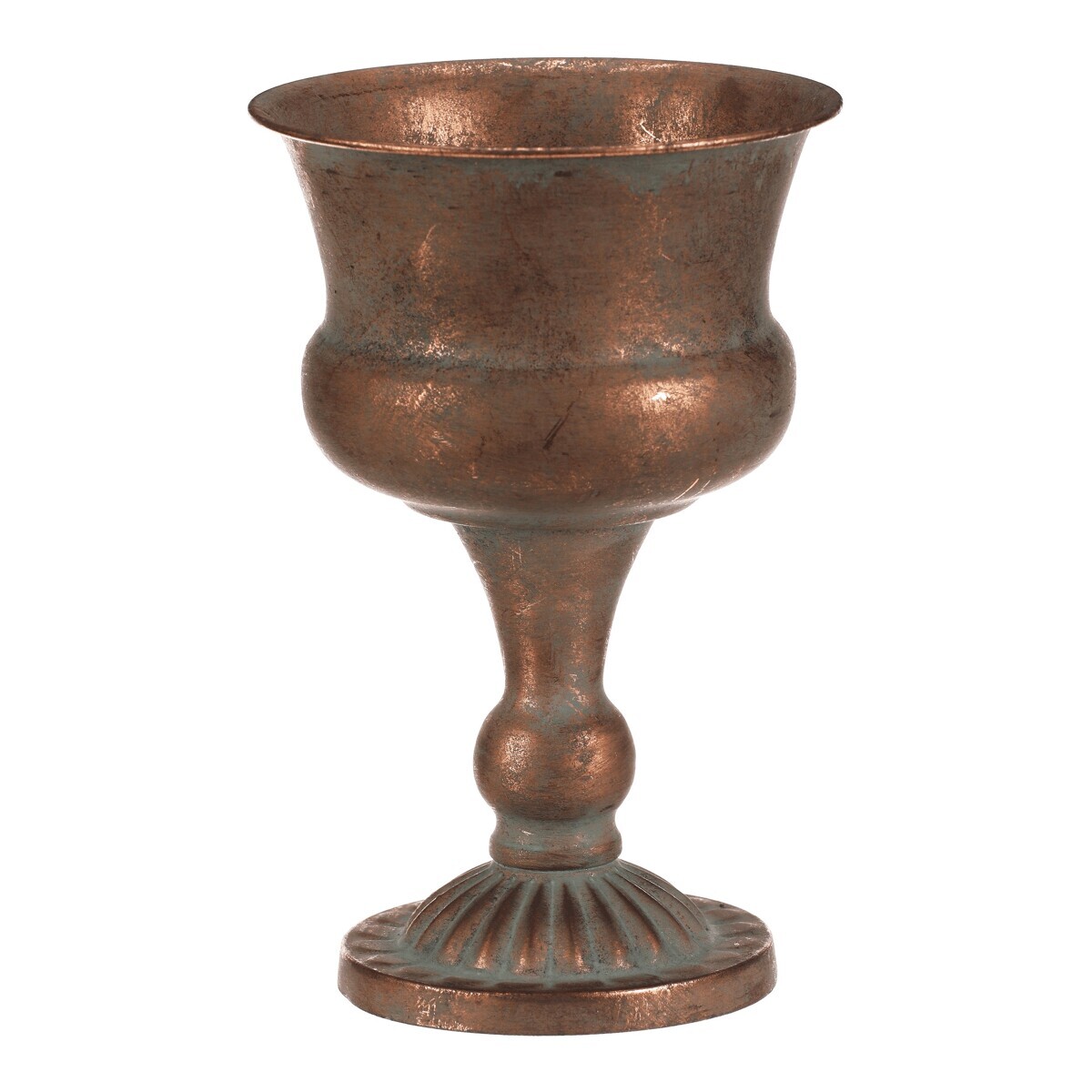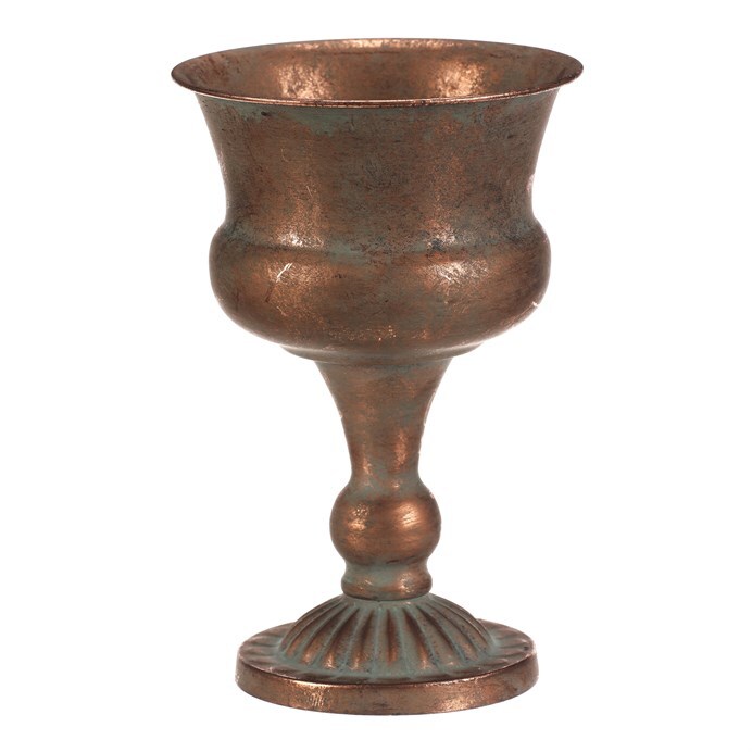 Kovová číše v měděném odstínu je vhodná jako aranžovací doplněk do interiérů s industriálním nebo vintage stylem. Její tvar připomíná klasickou pohárovou nádobu s výraznou základnou a elegantně tvarovanou stopkou, která dodává celku stabilitu. Povrch s patinovaným efektem vytváří dojem starožitnosti a přináší do prostoru zajímavý vizuální efekt. Číše je ideální pro aranžování květin, sušených dekorací nebo jako samostatný dekorativní prvek.