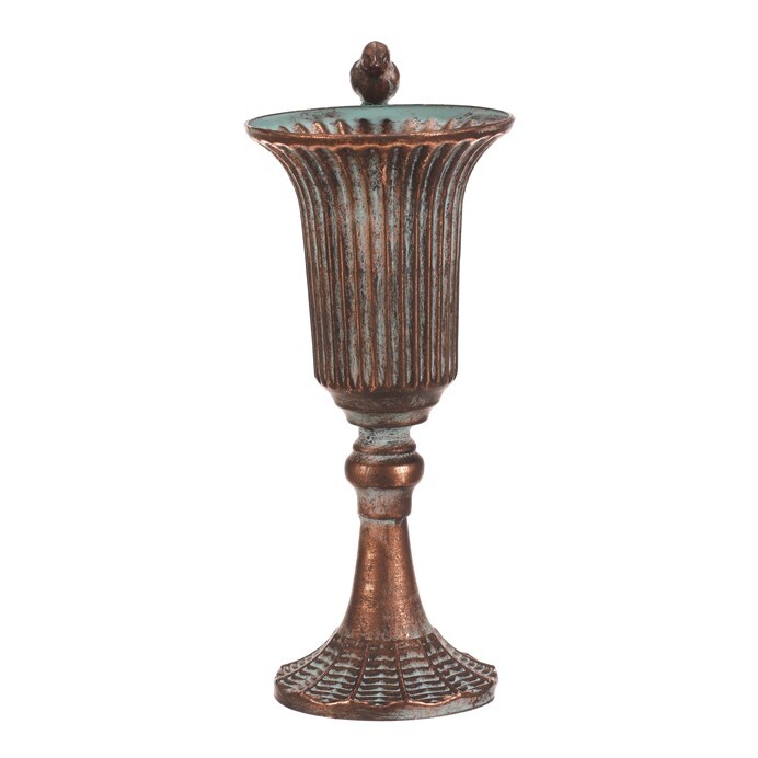 Kovová číše v měděném odstínu s patinou nabízí dekorativní prvek s vintage nádechem. Provedení je zdobeno jemnými žebrováními a na okraji je umístěna malá figurka ptáčka, která dodává celku hravý detail. Výška 30 cm umožňuje umístění na komodu, poličku nebo jako součást aranžmá v interiéru i exteriéru. Povrchová úprava s patinou zvýrazňuje strukturu kovu a podtrhuje rustikální charakter výrobku. Číše je vhodná pro dekorativní účely či jako originální doplněk zahradního prostoru.