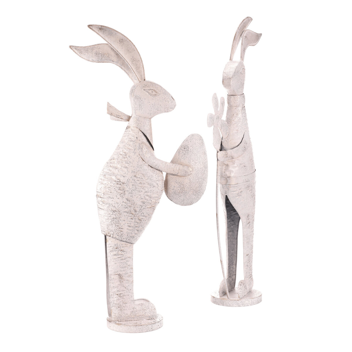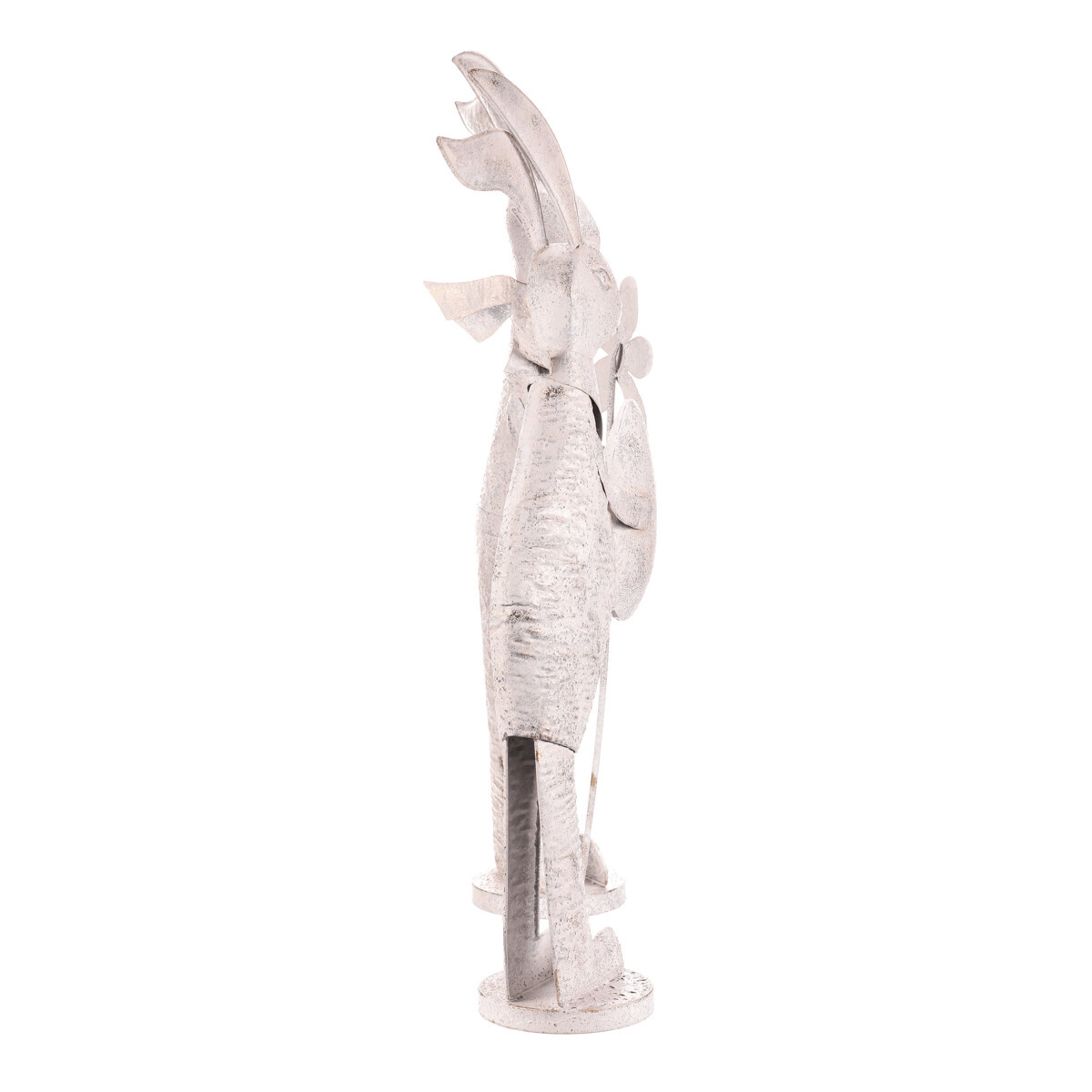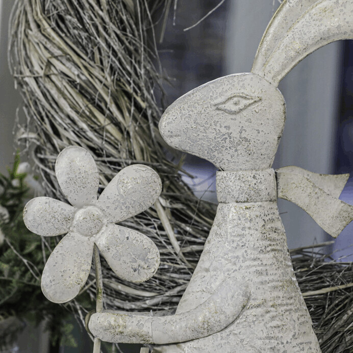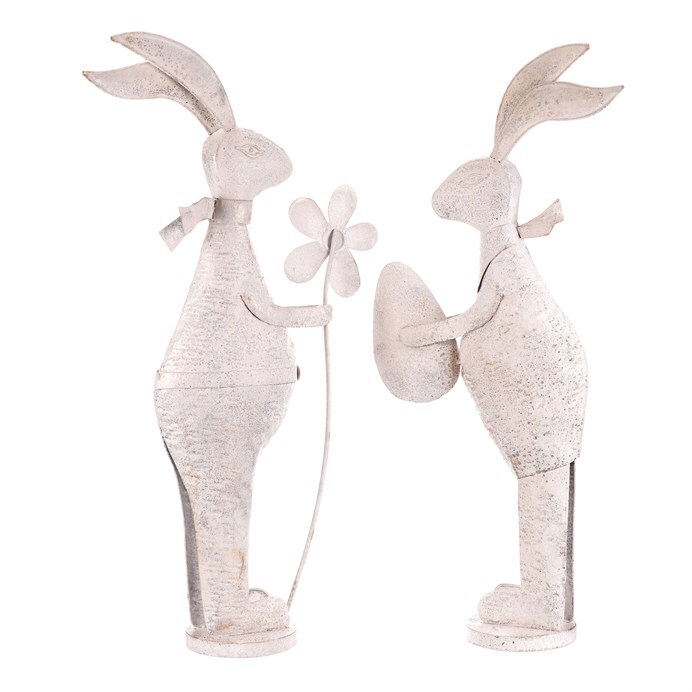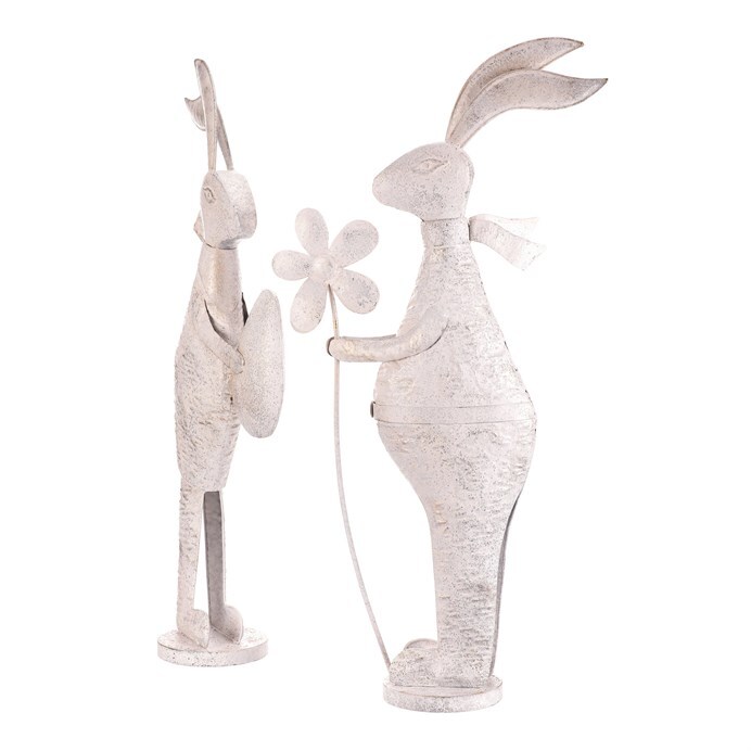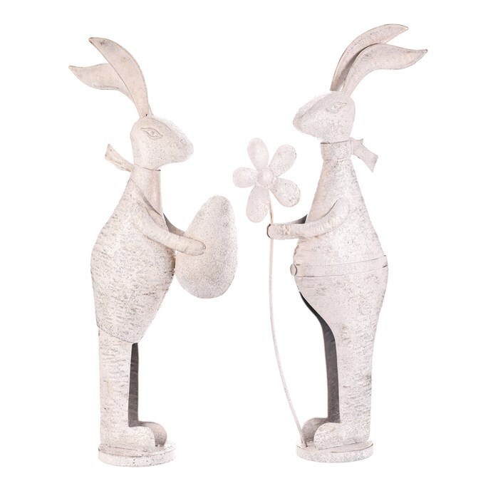 Kovová figurka zajíce v bílé patině představuje dekorativní prvek vhodný pro umístění na poličku, komodu nebo do okenního parapetu. Detailní zpracování zachycuje charakteristické znaky zajíce, který drží vajíčko nebo květinu, což přidává na hravosti a tematickém ladění. Povrch s patinou vytváří jemný vizuální efekt starobylosti a zároveň podtrhuje tvarovou plastiku. Výška střední velikosti umožňuje snadné začlenění do různých interiérových stylů, od rustikálního po moderní. Je určený pro dekorativní účely a snadnou manipulaci díky stabilní základně.