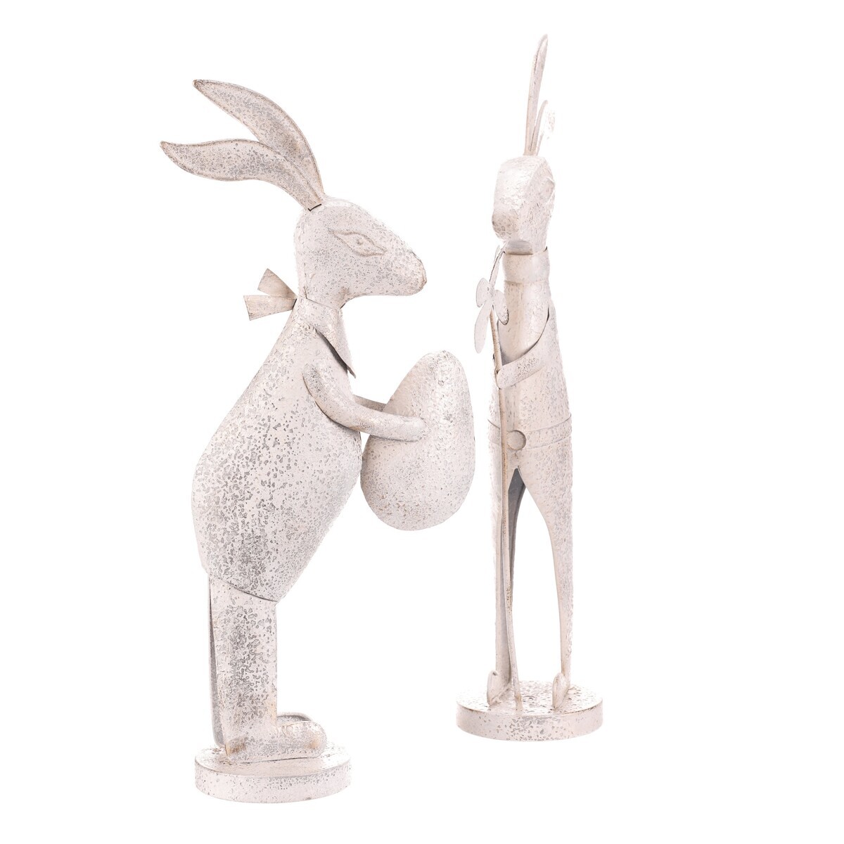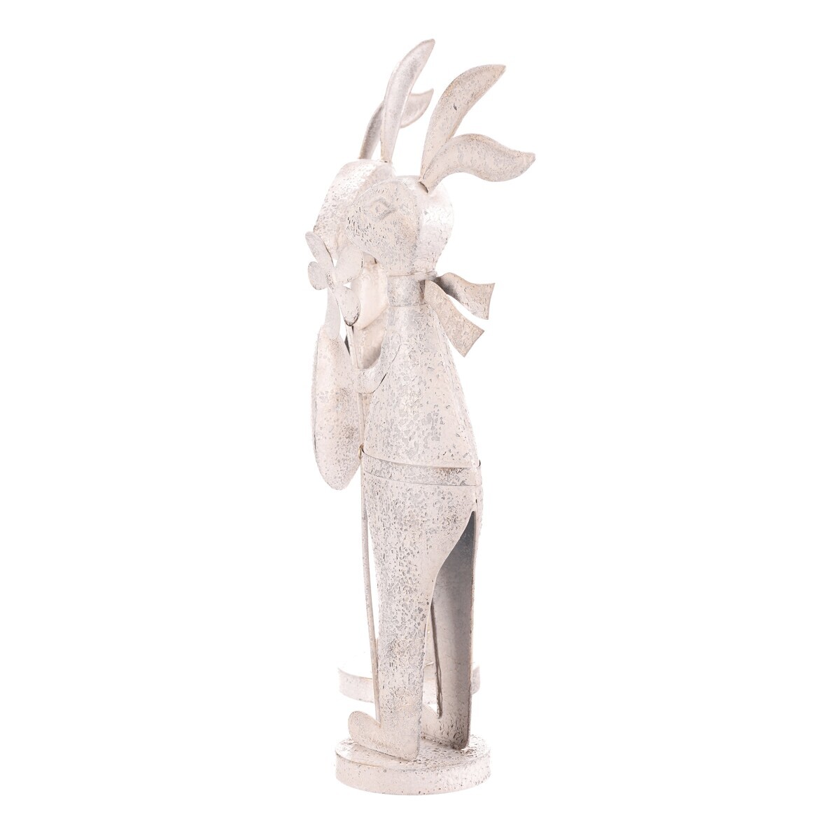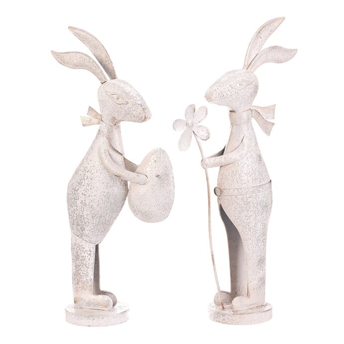 Kovová figurka zajíce v bílém patinovaném provedení přináší do interiéru nebo zahrady jemný dekorativní prvek s nádechem vintage stylu. Každý zajíc je vyroben z pevného kovu a stojí na kulaté základně, která zajišťuje stabilitu. Detailní zpracování zahrnuje jemné rytiny a patinu, která zvýrazňuje tvar a dodává výrobku charakter. Figurky jsou vhodné k postavení samostatně nebo jako součást tematické dekorace.