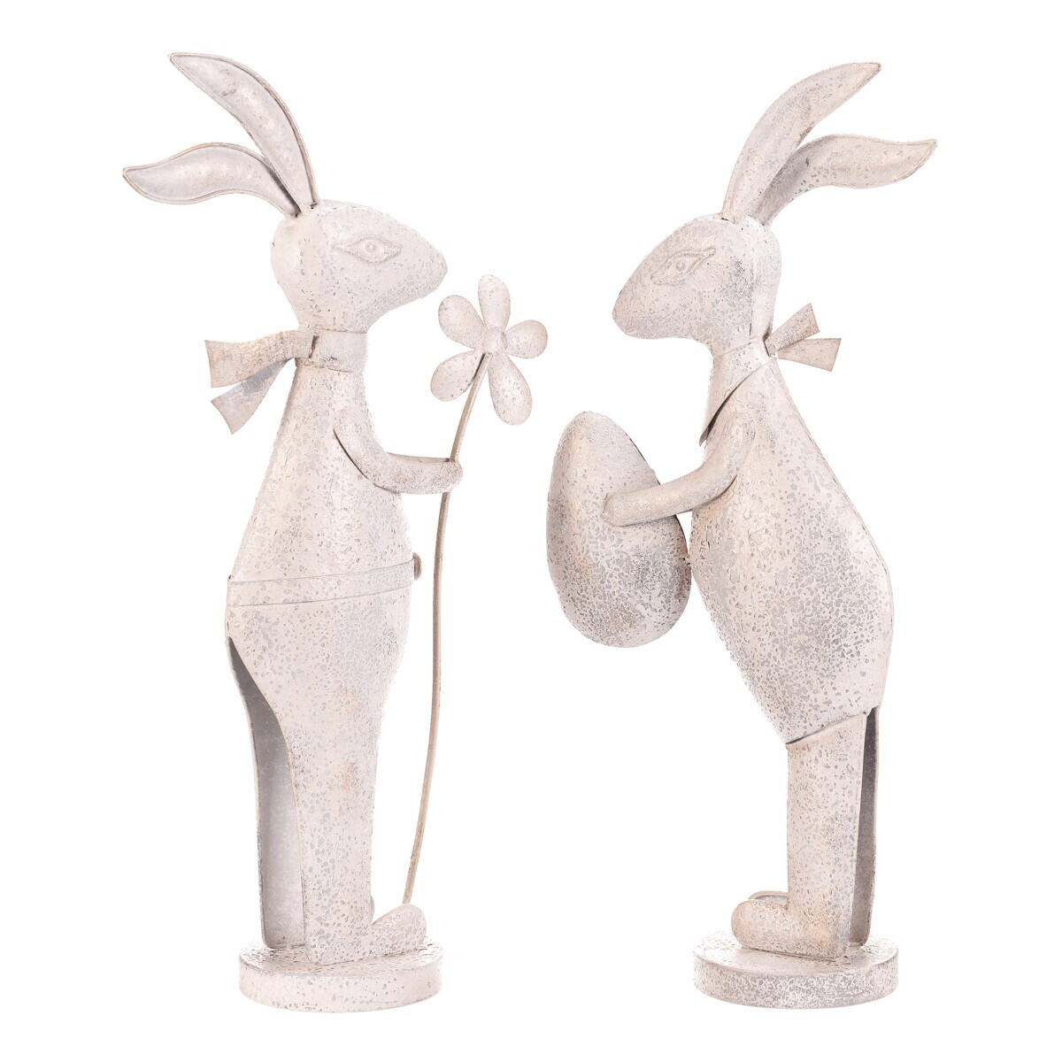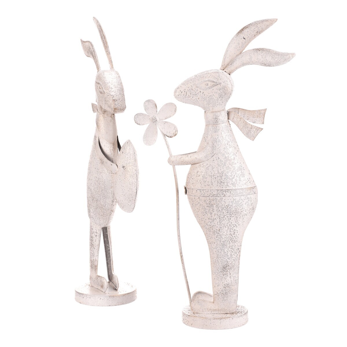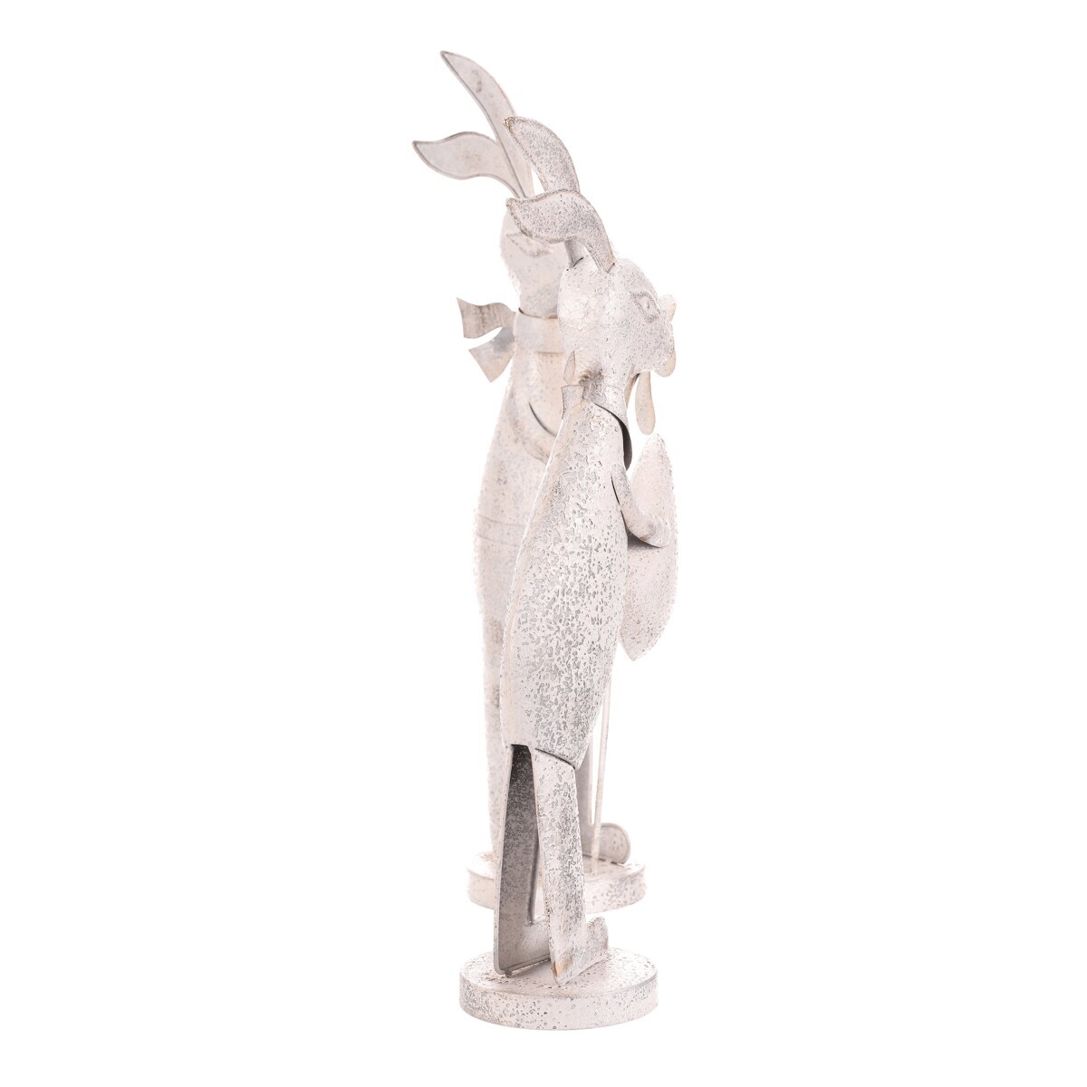 Kovová figurka zajíce v bílém patinovaném provedení přináší do interiéru nebo zahrady jemný dekorativní prvek s nádechem vintage stylu. Každý zajíc je vyroben z pevného kovu a stojí na kulaté základně, která zajišťuje stabilitu. Detailní zpracování zahrnuje jemné rytiny a patinu, která zvýrazňuje tvar a dodává výrobku charakter. Figurky jsou vhodné k postavení samostatně nebo jako součást tematické dekorace.
