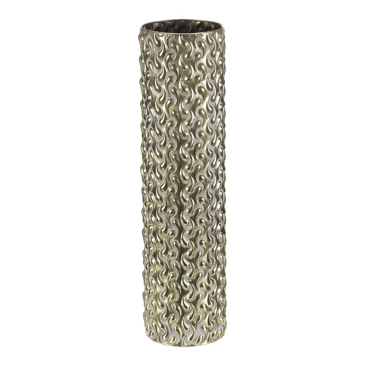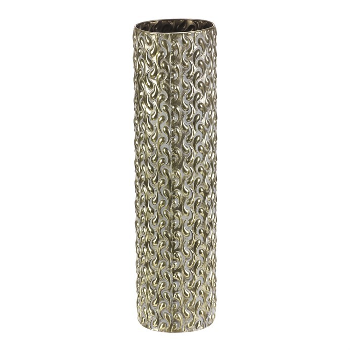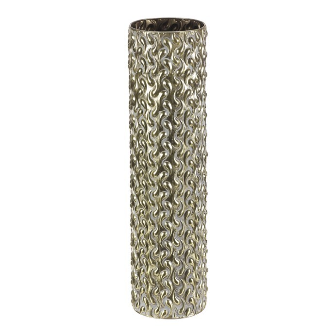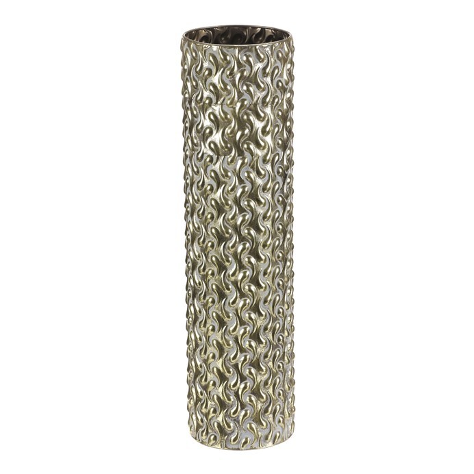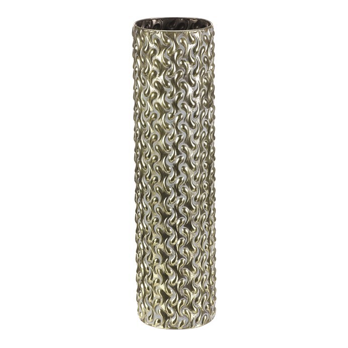 Kovový obal ve tvaru sloupce s výškou 59 cm vyniká zlatým odstínem a výraznou texturou s vlnitým reliéfem po celém povrchu. Jeho pevné provedení zajišťuje stabilitu a dlouhou životnost, přičemž povrchová úprava dodává dekoraci luxusní vzhled vhodný pro moderní i klasické interiéry. Obal je ideální pro umístění květin nebo dekorativních prvků, které zvýrazní jeho elegantní design. Díky svému tvaru a rozměru se hodí na podlahu i na větší stolní plochy.