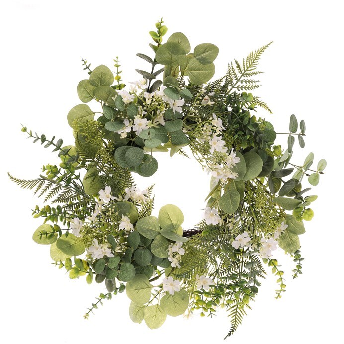 Umělý věnec o průměru 50 cm kombinuje zelené listy a bílé květy, které vytvářejí přirozený a svěží vzhled. Základnu tvoří pevné proutí, které zajišťuje stabilitu a snadnou manipulaci. Věnec je vhodný pro zavěšení na dveře, stěnu nebo jako dekorace na stůl, kde přináší příjemnou atmosféru po celý rok. Díky umělým materiálům nevyžaduje údržbu a zachovává si svůj vzhled dlouhodobě. Je ideální pro interiéry i kryté venkovní prostory.