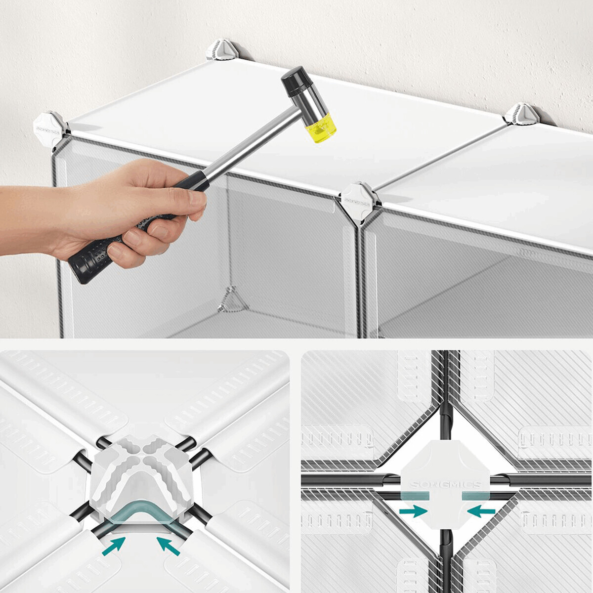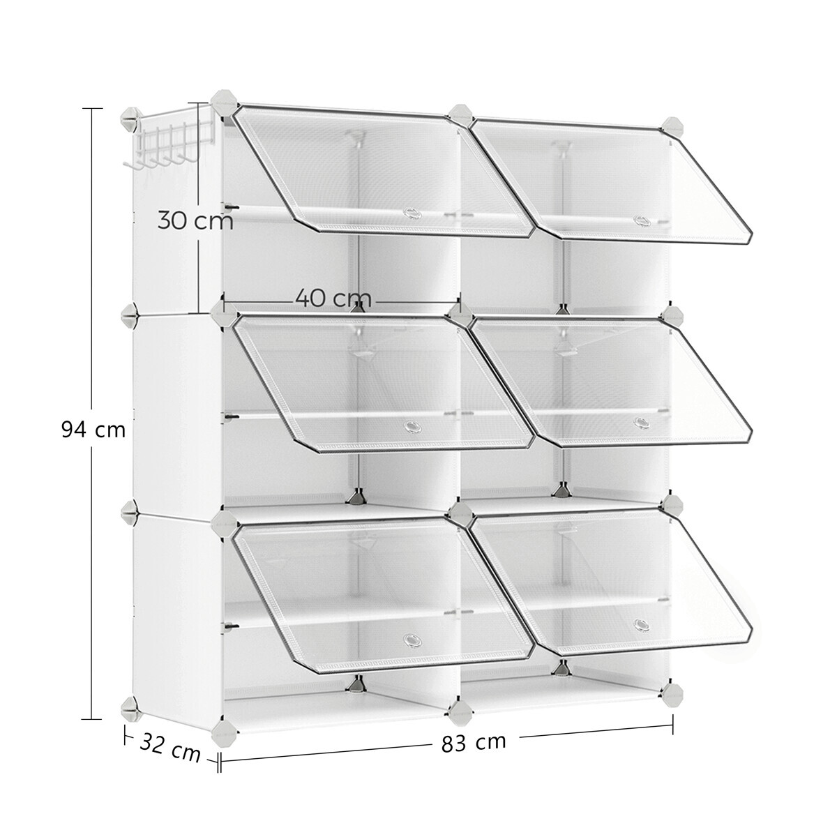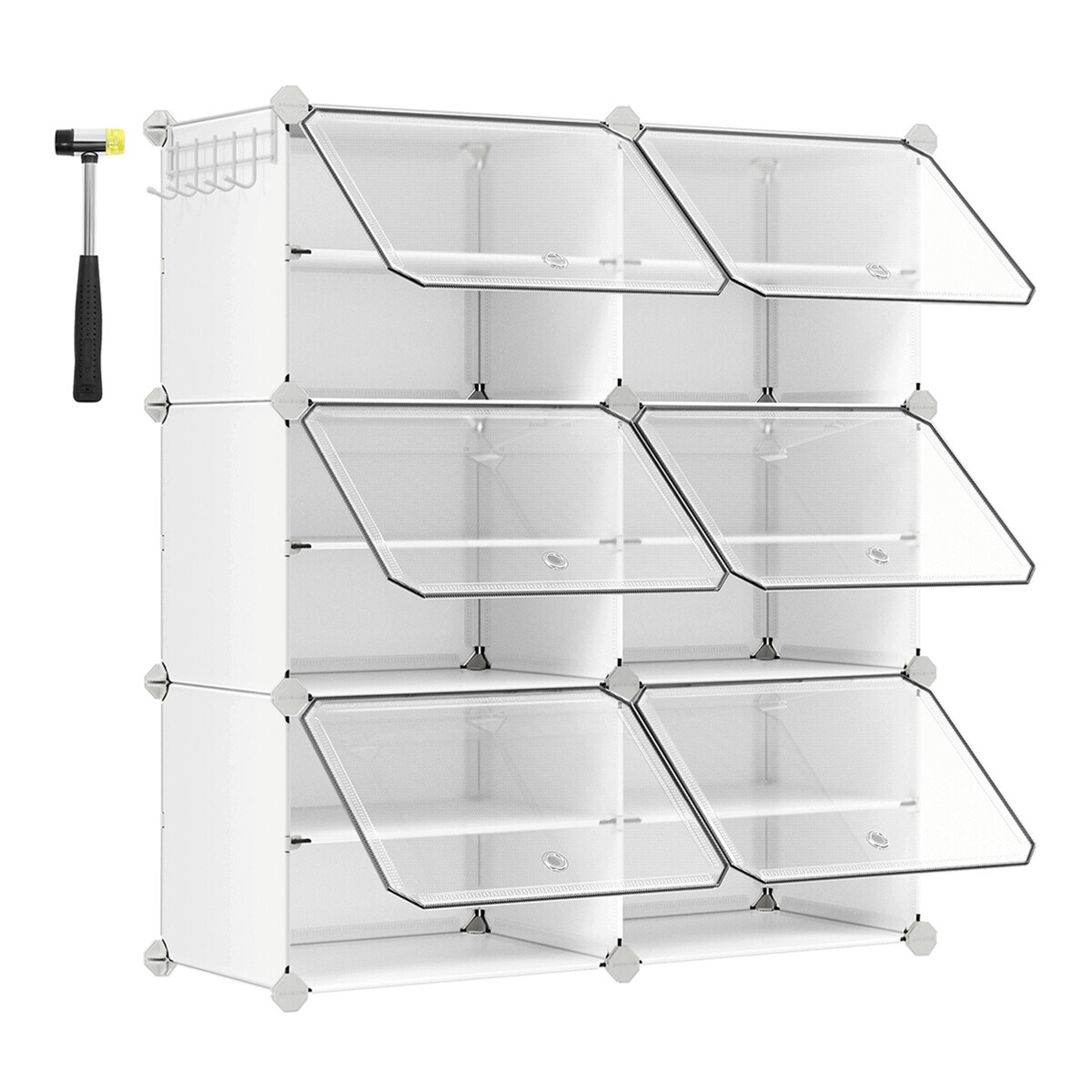 Modulární plastový botník v bílé barvě nabízí šest samostatných přihrádek s dvířky, která umožňují přehledné a praktické uskladnění obuvi. Každá přihrádka je vybavena průhlednými dvířky s otevíráním směrem nahoru, což usnadňuje přístup a zároveň chrání obsah před prachem. Díky modulárnímu provedení lze botník snadno sestavit a přizpůsobit prostoru podle potřeby. Plastový materiál se snadno udržuje a zajišťuje lehkost celého systému. Součástí balení je i gumová palička pro jednoduchou montáž.