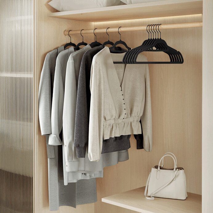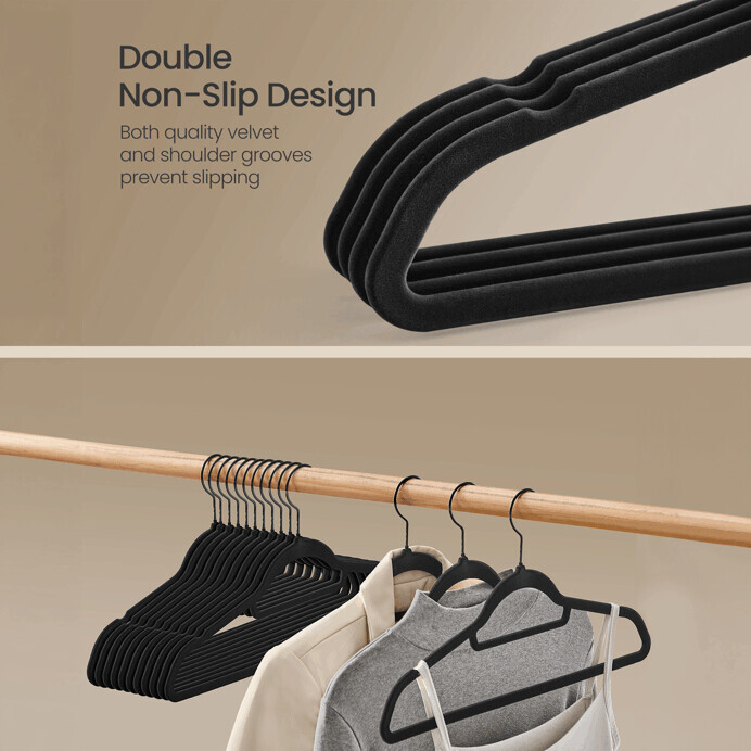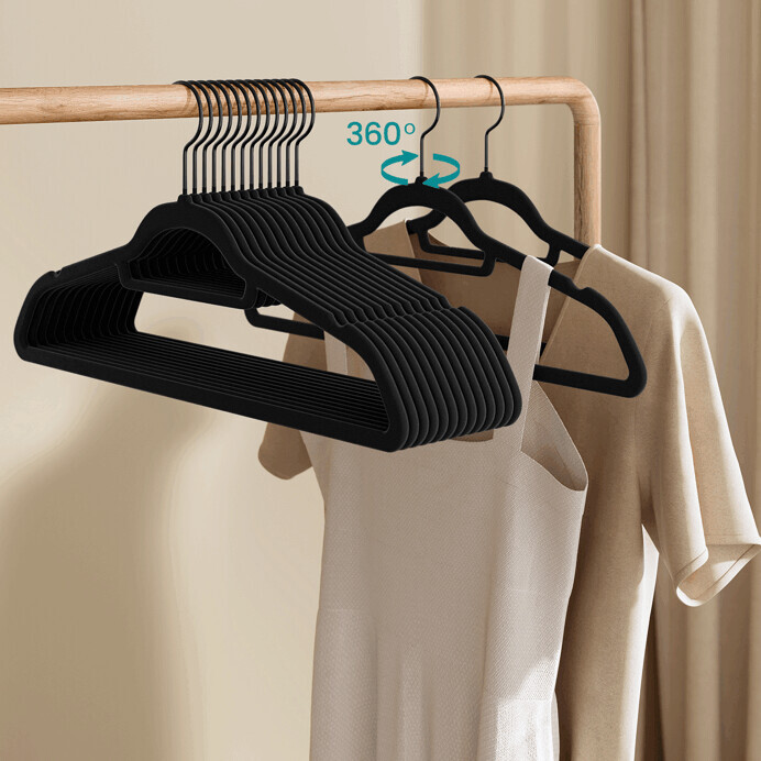 Sada 50 černých sametových ramínek je ideální pro uspořádání šatníku s důrazem na ochranu oděvů před sklouznutím. Ramínka mají hladký povrch s jemnou sametovou úpravou, která zabraňuje poškození tkanin a zároveň působí elegantně. Kovové háčky jsou otočné o 360°, což usnadňuje zavěšení a manipulaci. Díky tenkému profilu šetří místo v šatní skříni a umožňují přehledné uložení různých typů oděvů. Jsou vhodná pro domácí i komerční použití.