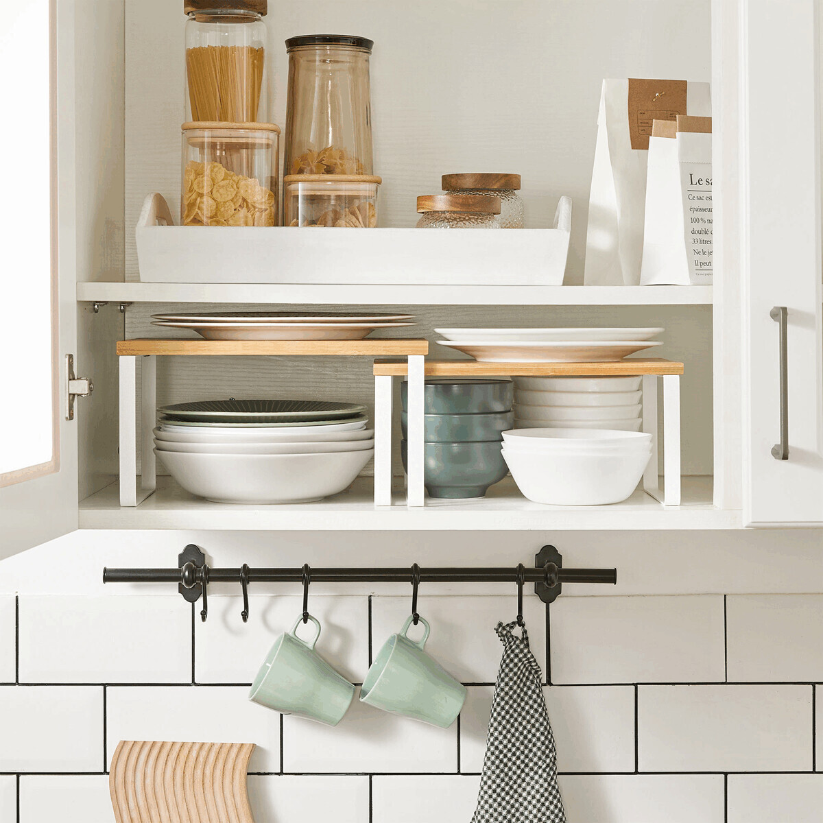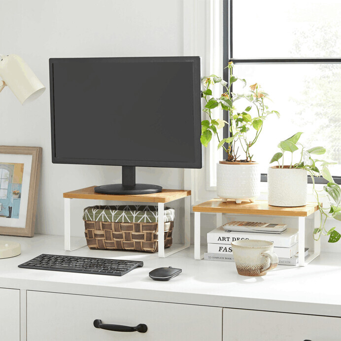 Set kuchyňských poliček kombinuje přírodní bambusové desky s bílými kovovými rámy, které zajišťují stabilitu a moderní vzhled. Poličky nabízejí dva odkládací prostory vhodné pro uspořádání kuchyňských doplňků, koření nebo menších nádobí. Bambusové desky jsou hladké s jemnou texturou, která přináší do prostoru přírodní atmosféru a snadnou údržbu. Bílý kovový rám je lakovaný práškovou metodou, což zvyšuje jeho odolnost vůči opotřebení. Díky kompaktním rozměrům je tento set ideální pro využití v menších kuchyních nebo jako doplněk na pracovní desku.