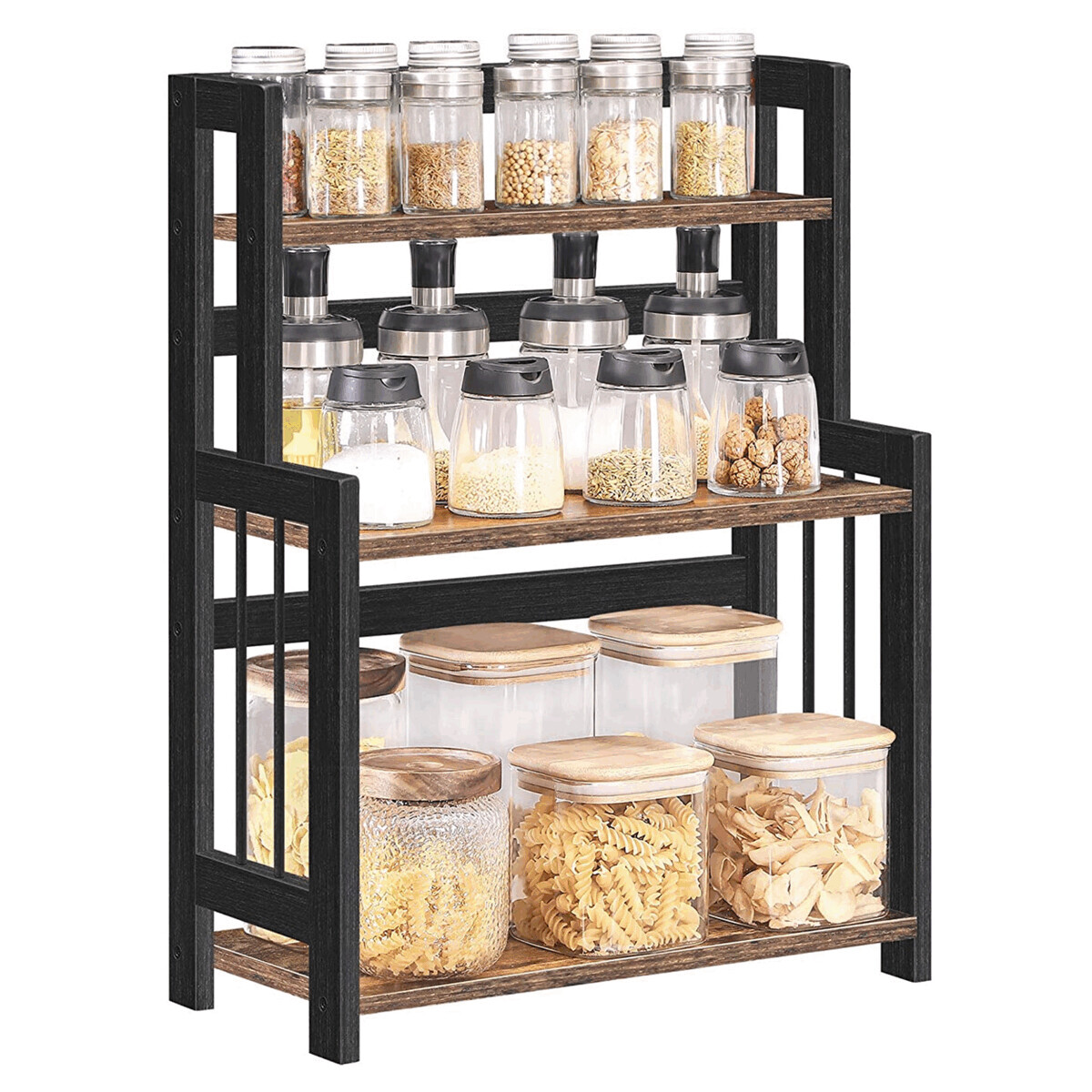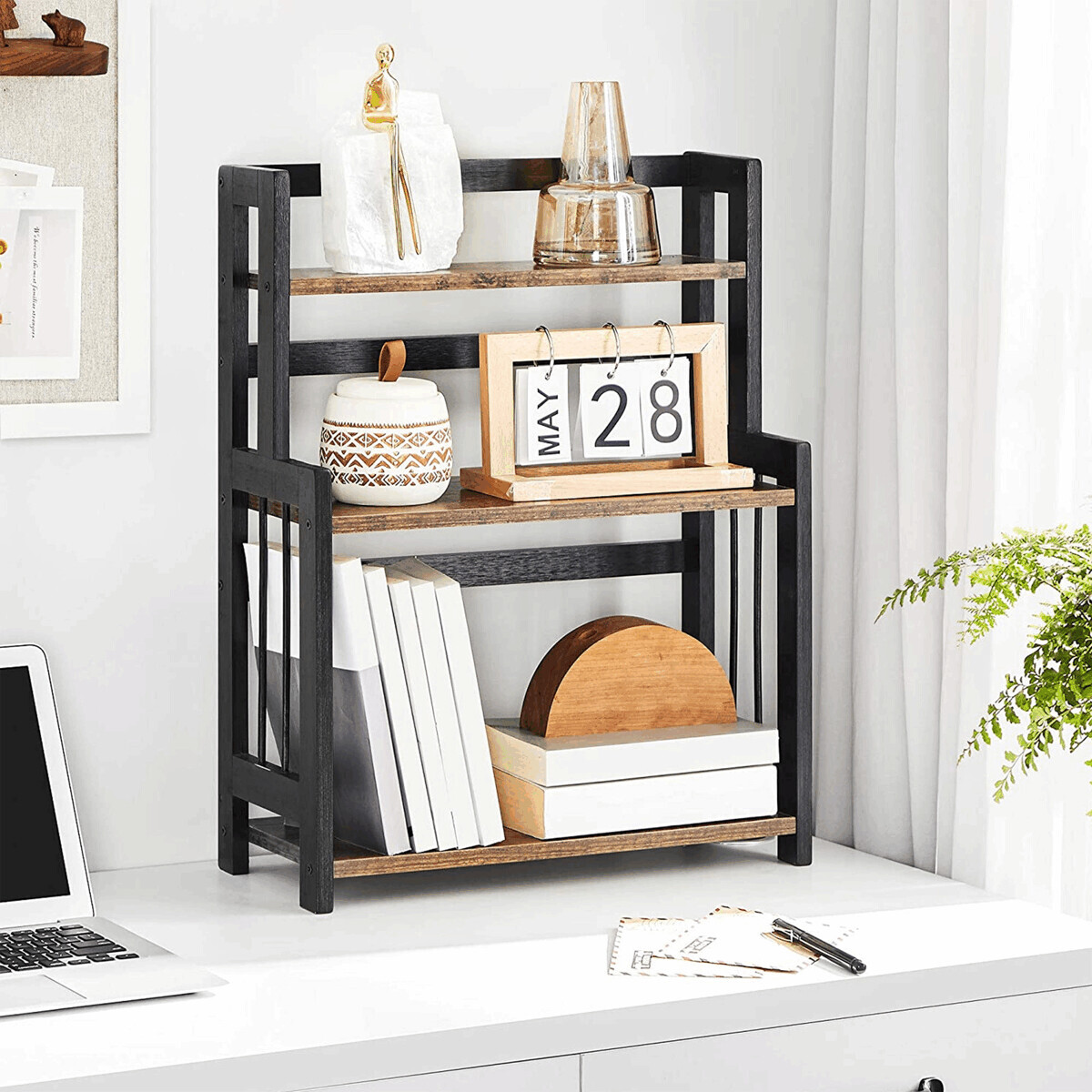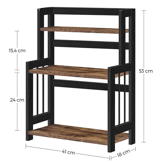 Organizér s třemi patry kombinuje pevný bambusový rám v černém provedení s odkládacími plochami z hnědé MDF desky, které nabízejí dostatek místa pro uspořádání drobných předmětů. Robustní rám z bambusu zajišťuje stabilitu a dlouhou životnost, zatímco MDF desky jsou hladké a snadno udržovatelné. Otevřená konstrukce umožňuje rychlý přístup k uloženým věcem a zároveň přispívá k vzdušnému vzhledu. Díky kompaktním rozměrům je organizér vhodný pro použití v různých prostorách, jako jsou kanceláře, kuchyně nebo obývací pokoje. Praktický design s třemi úrovněmi usnadňuje efektivní využití prostoru.