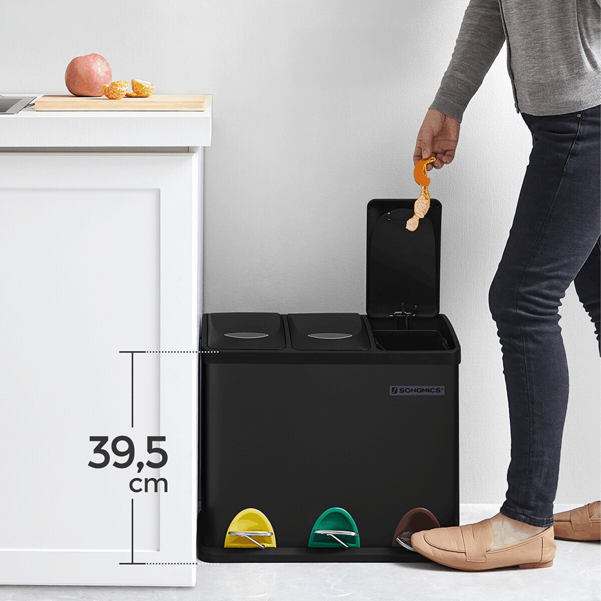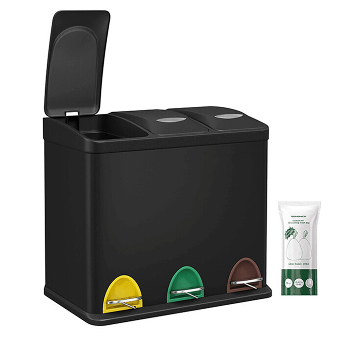 Odpadkový koš s pedály v elegantní černé barvě nabízí praktické řešení pro třídění odpadu v domácnosti i kanceláři. Tři samostatné nádoby o objemu 8 litrů umožňují snadné rozdělení odpadu, zatímco barevně odlišené pedály zajišťují rychlou a hygienickou manipulaci bez nutnosti dotyku rukou. Pevné ocelové tělo dodává stabilitu a moderní vzhled, vzduchotěsná víka pomáhají minimalizovat zápach. Vyjímatelné vnitřní nádoby usnadňují vysypávání i údržbu. Tento produkt značky Autronic představuje funkční a designové řešení pro efektivní recyklaci.