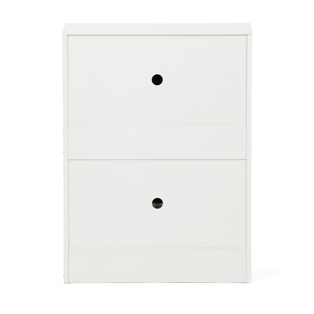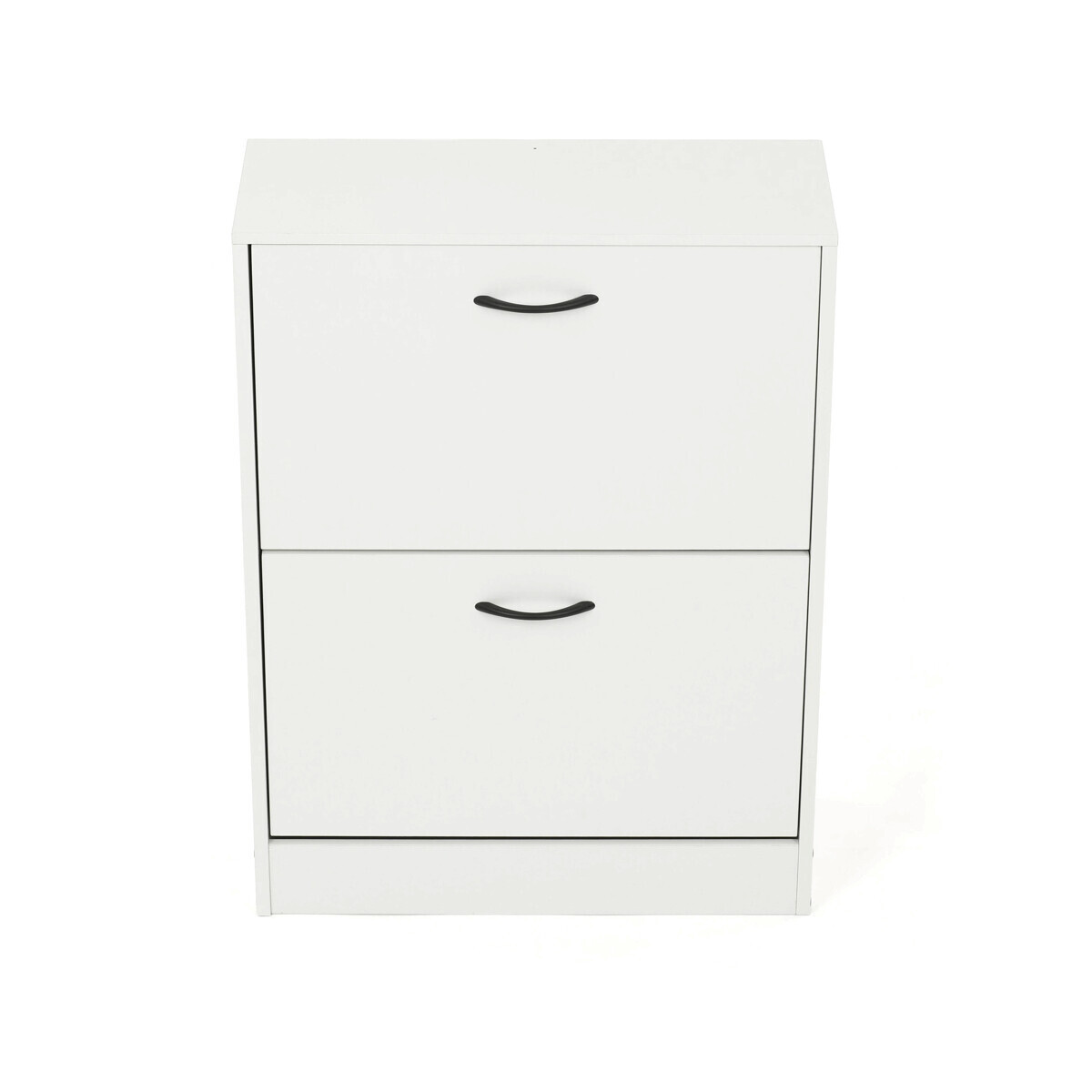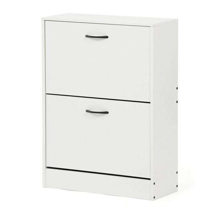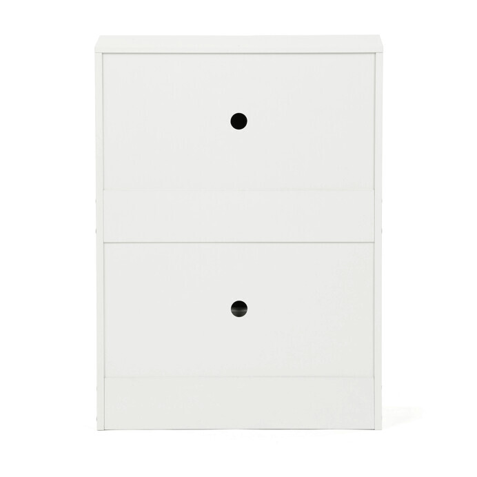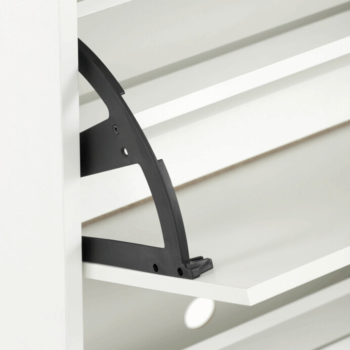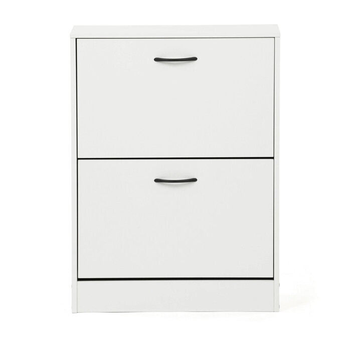 Botník s dvěma přihrádkami je vyroben z MDF desek v bílé barvě, které zajišťují pevnost a stabilitu celého kusu nábytku. Každá přihrádka je vybavena otevíracím mechanismem s černými kovovými panty, které umožňují snadný přístup k uloženým botám a zároveň pevné držení přihrádky v zavřené poloze. Kompaktní rozměry botníku umožňují jeho umístění i do menších prostor, přičemž horní deska nabízí možnost využití jako odkládací plocha. Povrchová úprava MDF desek je hladká a snadno se udržuje, což přispívá k dlouhé životnosti produktu. Botník je vhodný pro uložení několika párů obuvi a pomáhá udržet pořádek v předsíni či chodbě.