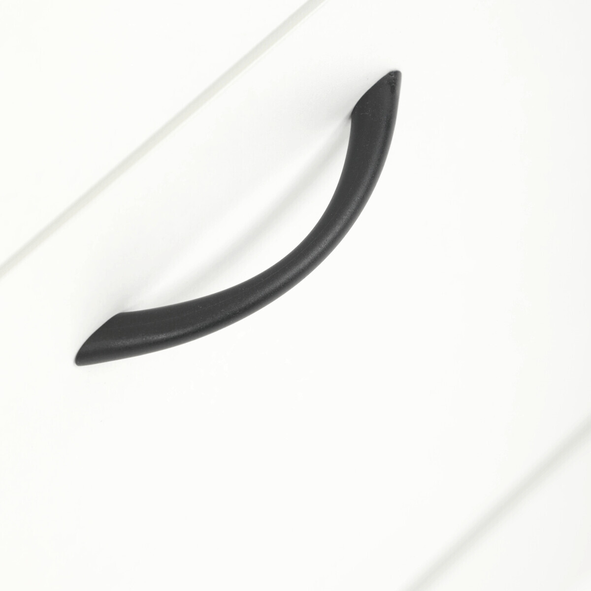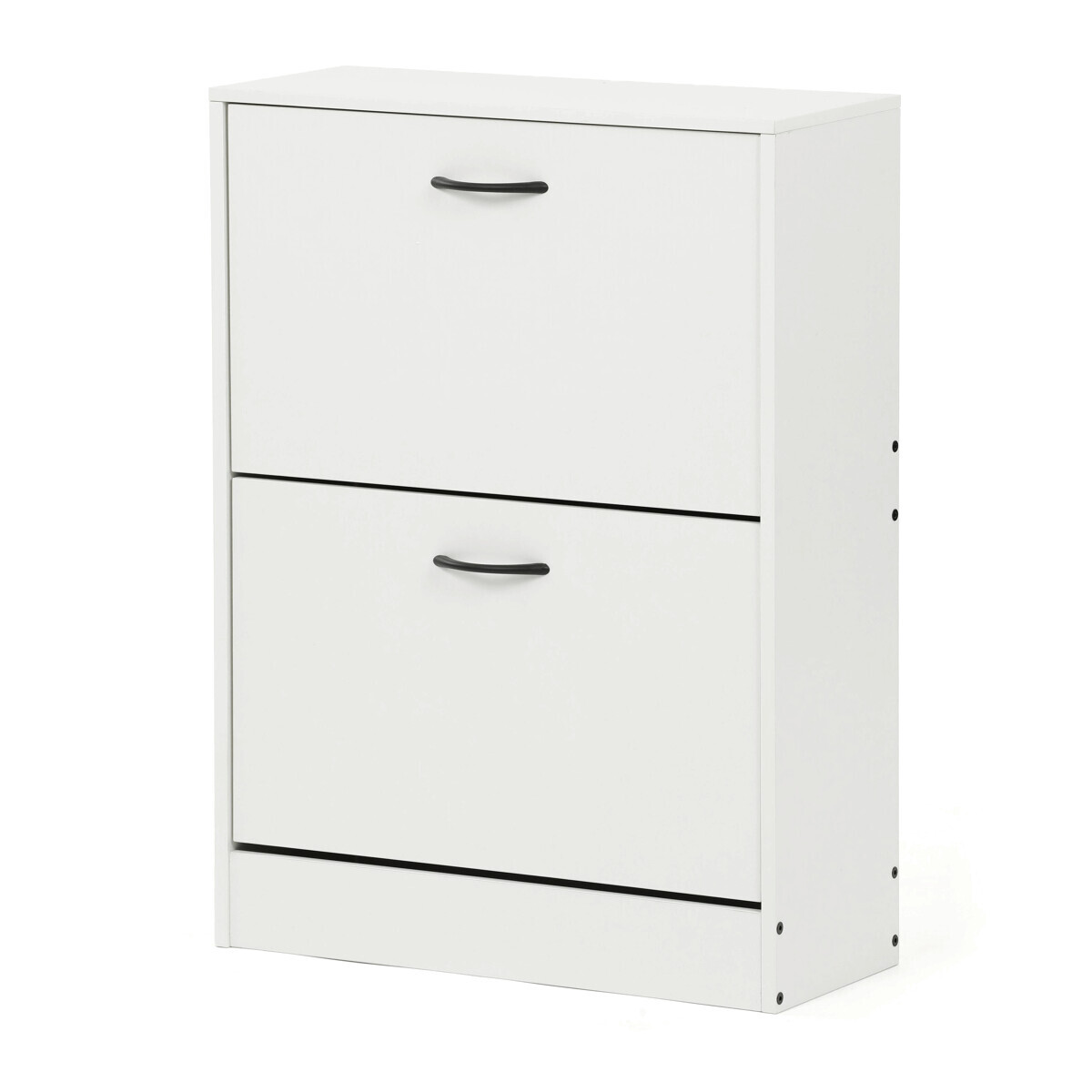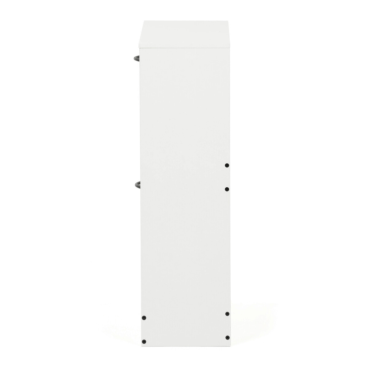 Botník s dvěma přihrádkami je vyroben z MDF desek v bílé barvě, které zajišťují pevnost a stabilitu celého kusu nábytku. Každá přihrádka je vybavena otevíracím mechanismem s černými kovovými panty, které umožňují snadný přístup k uloženým botám a zároveň pevné držení přihrádky v zavřené poloze. Kompaktní rozměry botníku umožňují jeho umístění i do menších prostor, přičemž horní deska nabízí možnost využití jako odkládací plocha. Povrchová úprava MDF desek je hladká a snadno se udržuje, což přispívá k dlouhé životnosti produktu. Botník je vhodný pro uložení několika párů obuvi a pomáhá udržet pořádek v předsíni či chodbě.