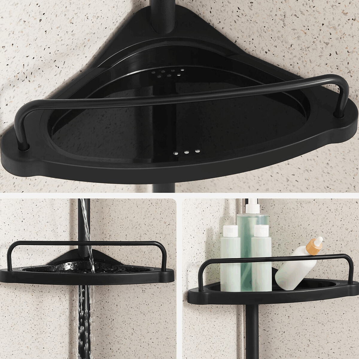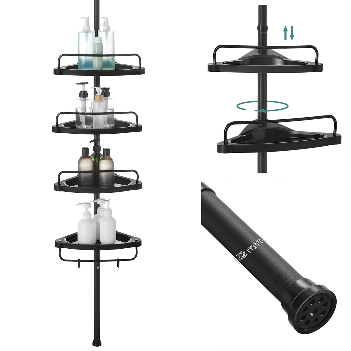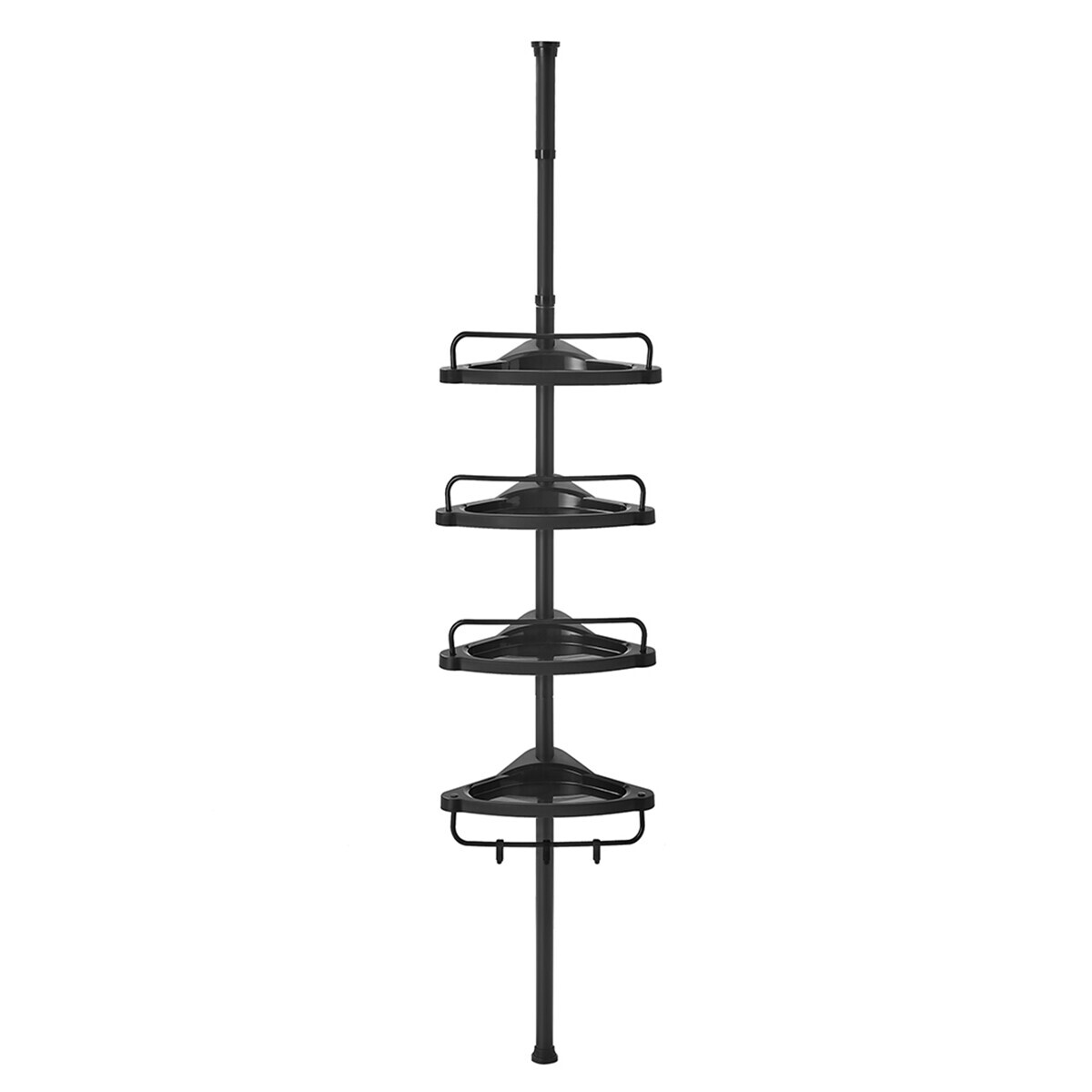Nastavitelná rohová police do koupelny nabízí čtyři odkládací plochy uspořádané do praktického trojúhelníkového tvaru, které efektivně využívají prostor v rohu místnosti. Výška police je plynule nastavitelná v rozmezí od 85 do 305 cm, což umožňuje přizpůsobení různým výškám stropu a potřebám uživatele. Police jsou vyrobeny z černého plastu s matným povrchem, který se snadno udržuje a odolává vlhkosti běžné v koupelnovém prostředí. Každá police je opatřena nízkým zábradlím, které zabraňuje sklouznutí předmětů, a spodní police navíc obsahuje dva háčky pro zavěšení drobných doplňků. Stabilní teleskopická tyč zajišťuje pevné uchycení mezi podlahou a stropem bez nutnosti vrtání.
