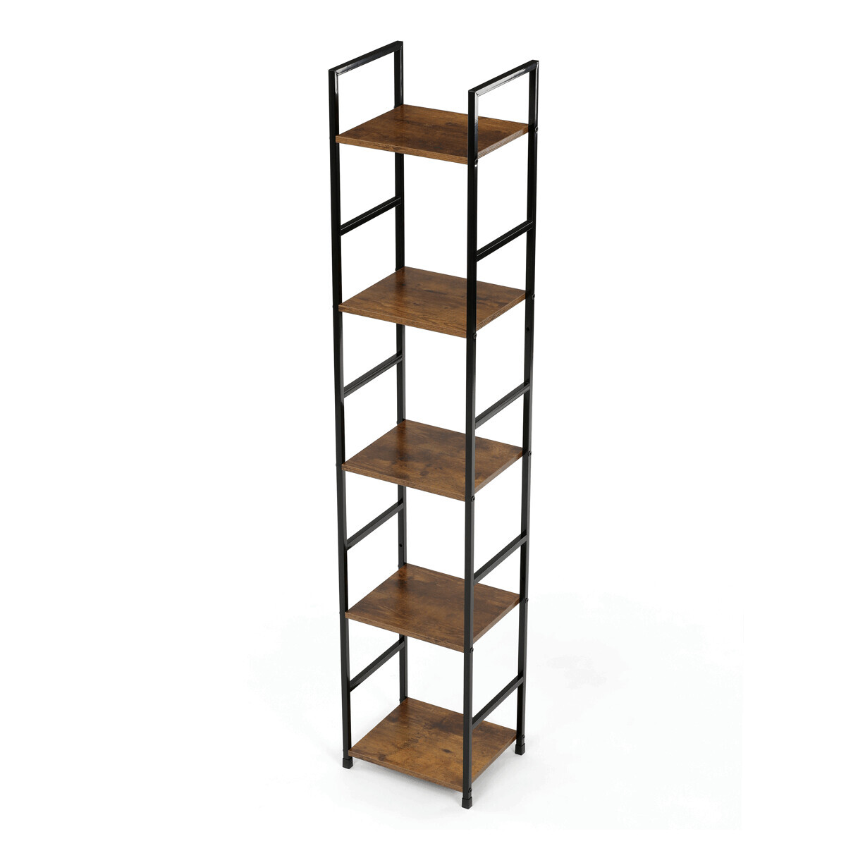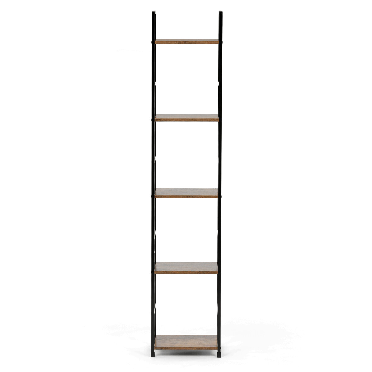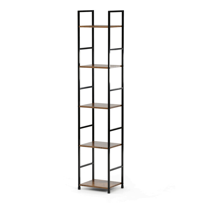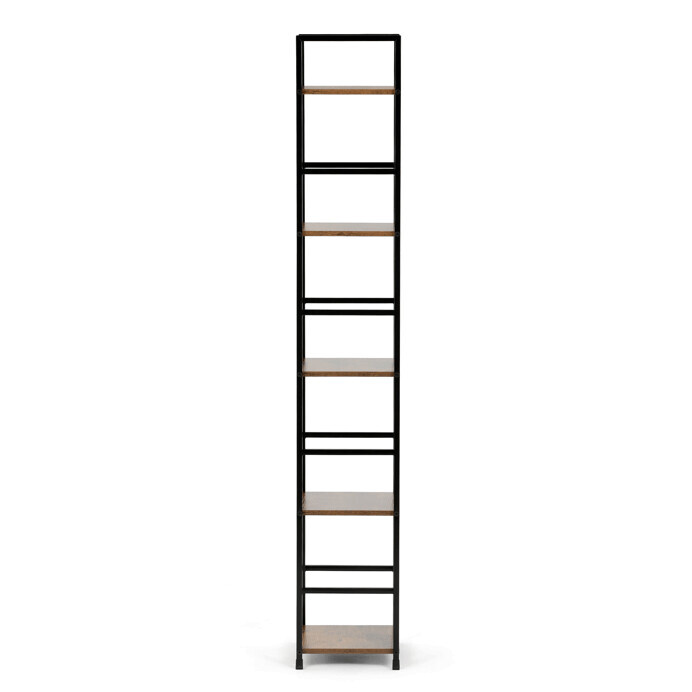Regál s pěti policemi nabízí praktický odkládací prostor v industriálním stylu. Police jsou vyrobeny z MDF desek s dekorem starého dřeva v hnědém odstínu, které doplňuje černý lakovaný kovový rám zajišťující stabilitu a pevnost. Otevřená konstrukce umožňuje snadný přístup a přehledné uspořádání předmětů. Díky kombinaci materiálů je regál navržen pro dlouhou životnost a snadnou údržbu. Je vhodný do obývacích pokojů, pracovních koutů i kanceláří, kde vynikne jako funkční i designový prvek.