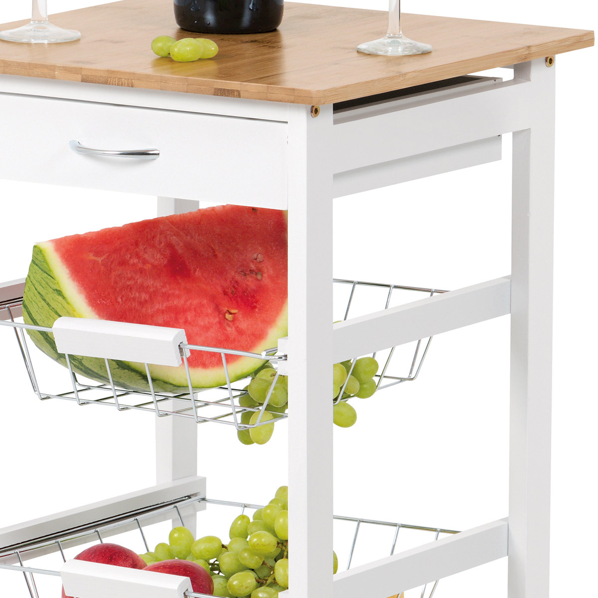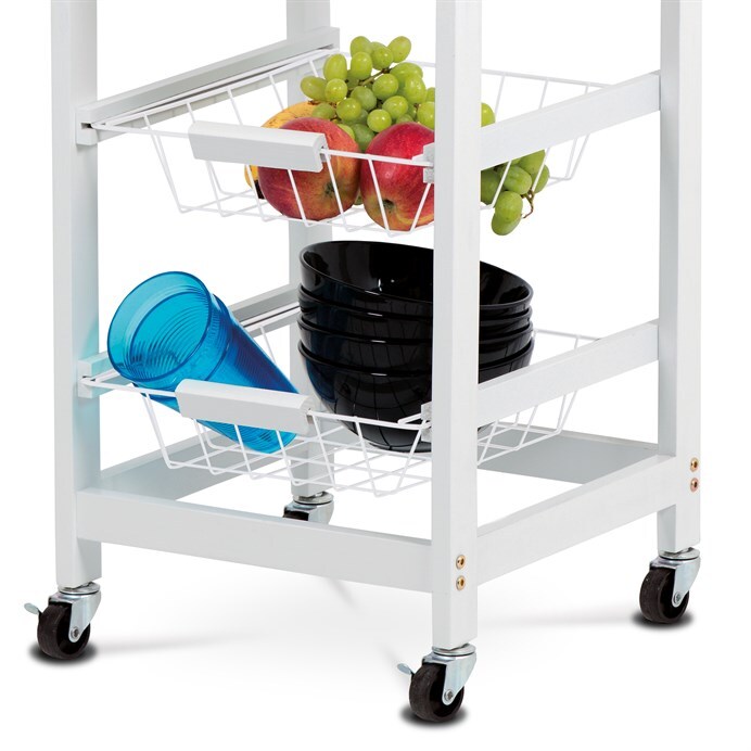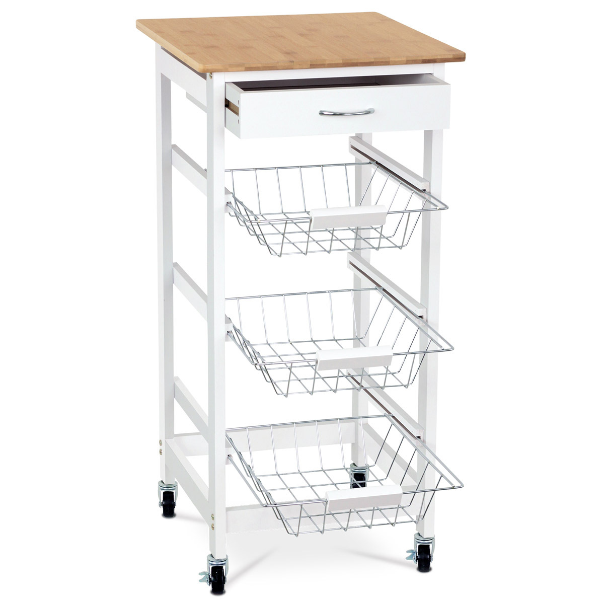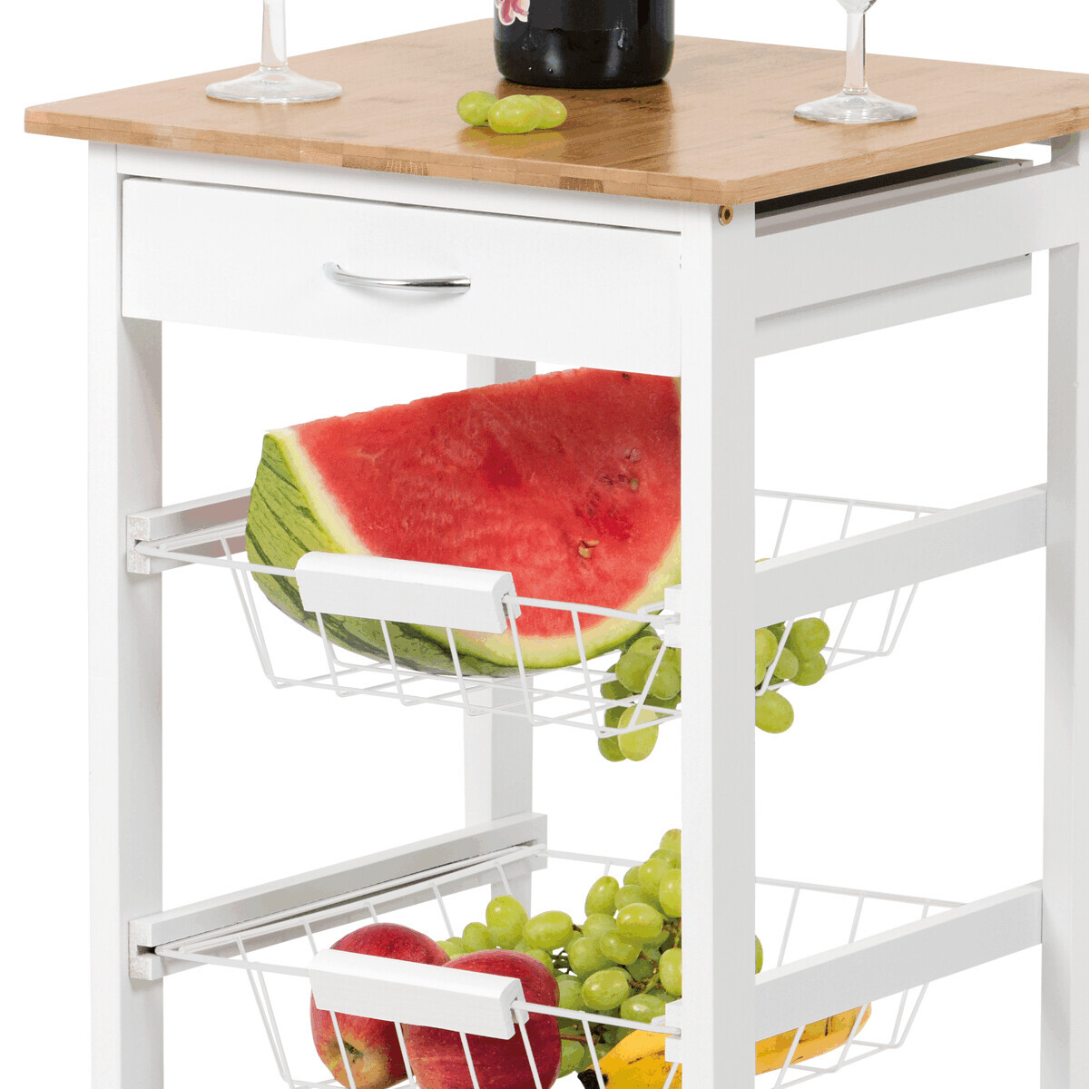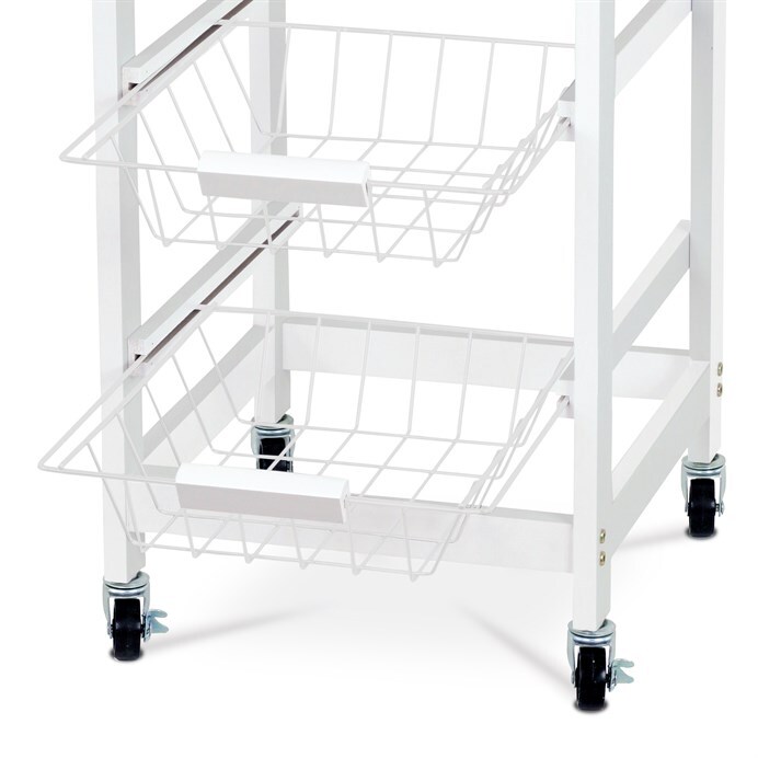 Servírovací stolek a regál je vyrobený z MDF s matným bílým lakem a masivní bambusovou deskou v přírodním dekoru, která dodává výrobku příjemný a teplý vzhled. Konstrukce je doplněna třemi kovovými drátěnými koši, které jsou praktické pro uskladnění ovoce, zeleniny nebo kuchyňských doplňků. Stolek je vybaven čtyřmi pojezdovými kolečky, z nichž dvě mají brzdy pro bezpečné zajištění na místě, což umožňuje snadnou manipulaci a přesun v prostoru. Jednoduchý úchyt zásuvky zajišťuje pohodlný přístup k dalšímu úložnému prostoru. Kompaktní rozměry a kombinace materiálů činí tento stolek vhodným doplňkem do kuchyně či jídelny, kde oceníte jeho funkčnost i estetiku.