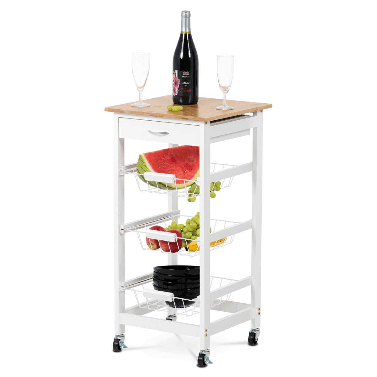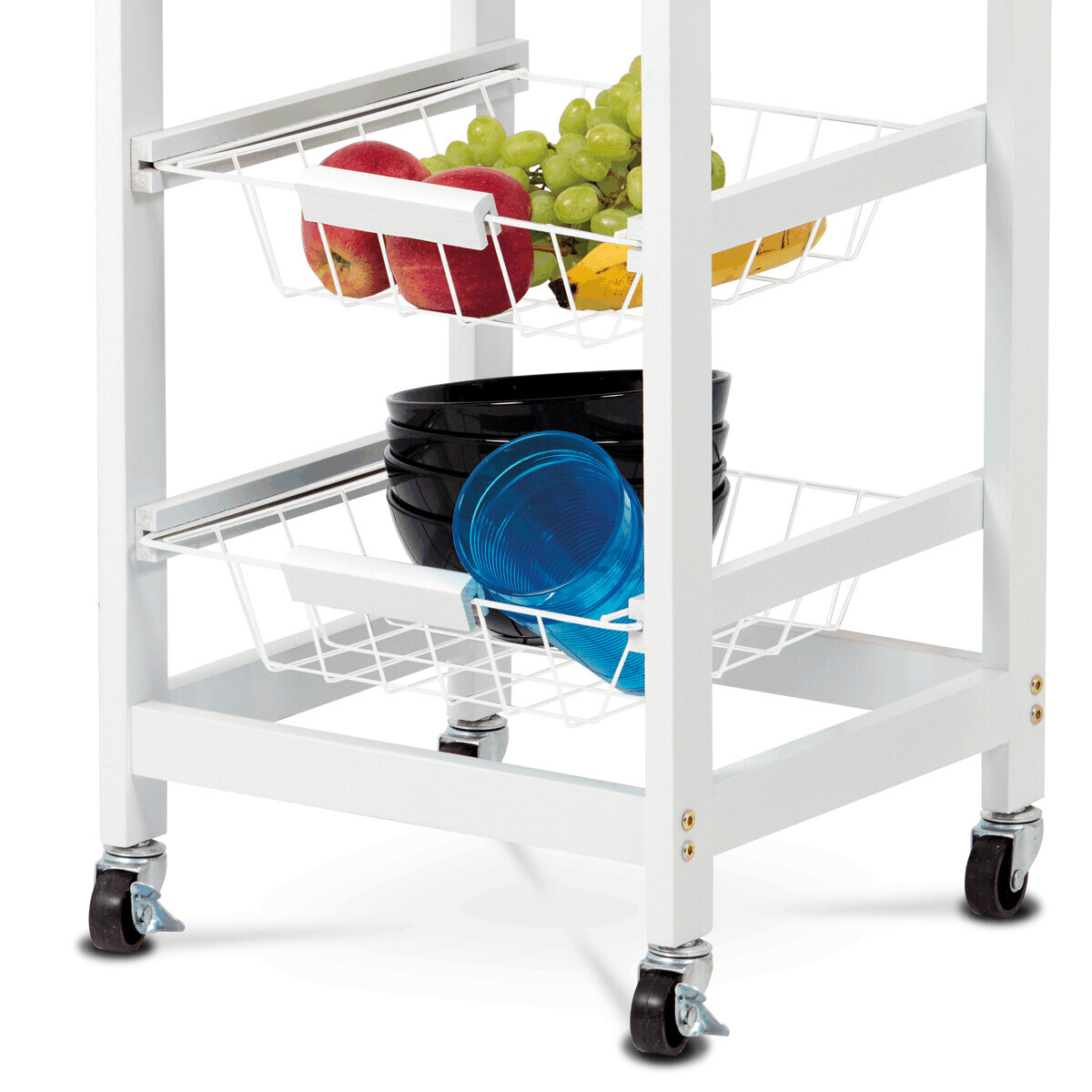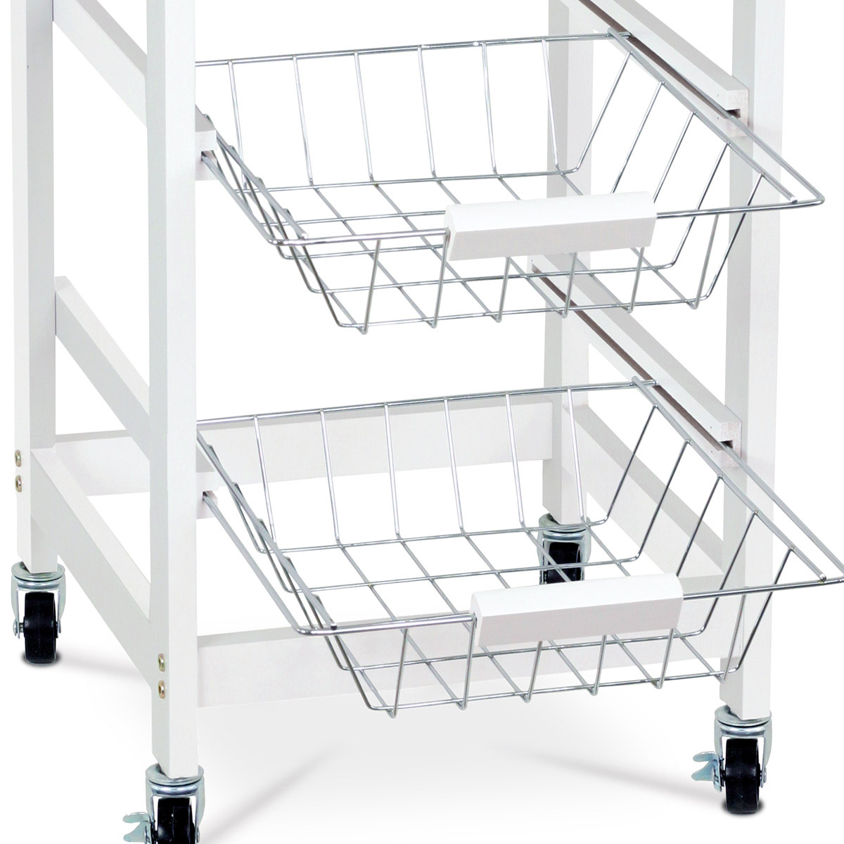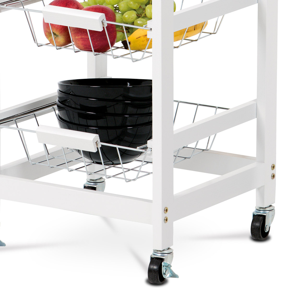Servírovací stolek a regál je vyrobený z MDF s matným bílým lakem a masivní bambusovou deskou v přírodním dekoru, která dodává výrobku příjemný a teplý vzhled. Konstrukce je doplněna třemi kovovými drátěnými koši, které jsou praktické pro uskladnění ovoce, zeleniny nebo kuchyňských doplňků. Stolek je vybaven čtyřmi pojezdovými kolečky, z nichž dvě mají brzdy pro bezpečné zajištění na místě, což umožňuje snadnou manipulaci a přesun v prostoru. Jednoduchý úchyt zásuvky zajišťuje pohodlný přístup k dalšímu úložnému prostoru. Kompaktní rozměry a kombinace materiálů činí tento stolek vhodným doplňkem do kuchyně či jídelny, kde oceníte jeho funkčnost i estetiku.