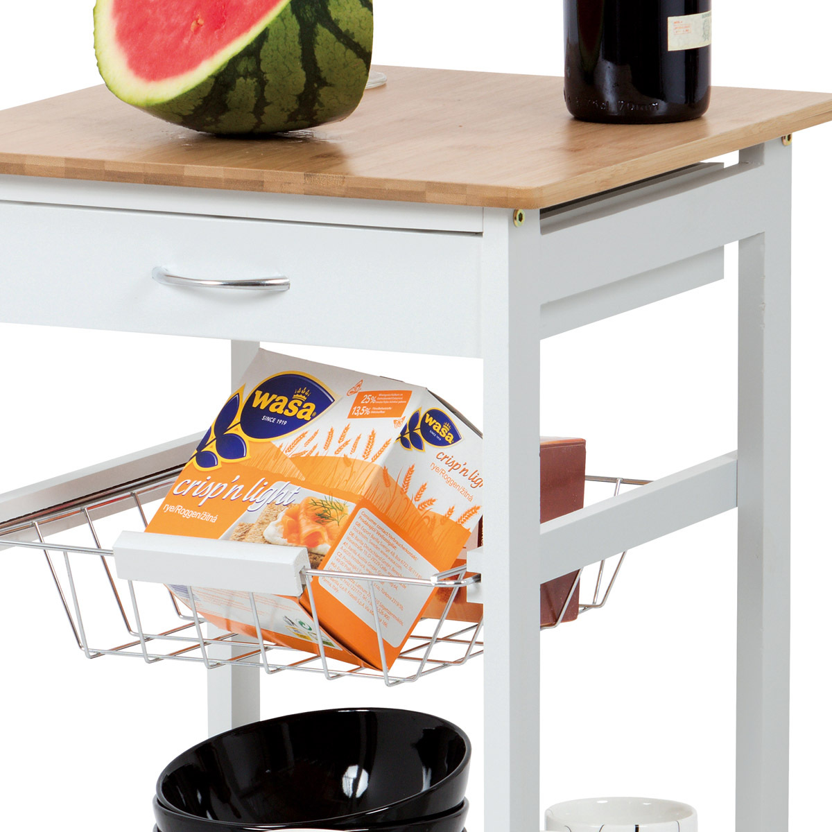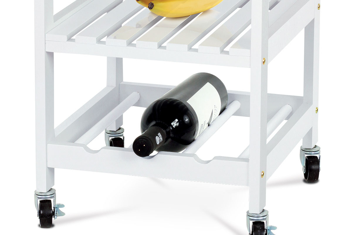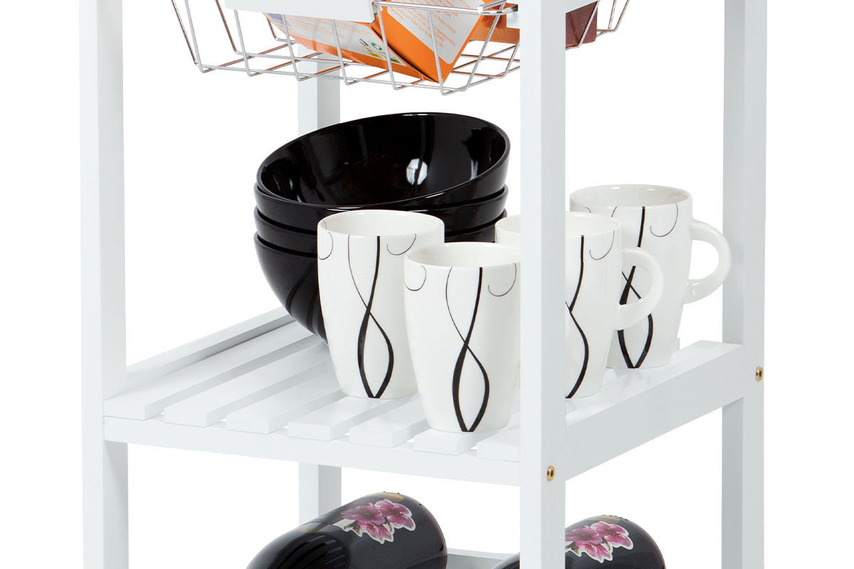 Servírovací stolek a regál DR-044 kombinuje přírodní masiv bambusové desky s bílým matným lakem na MDF nohou, což zajišťuje pevné a stabilní provedení vhodné do moderních i klasických interiérů. Vrchní deska z bambusu nabízí odolný a snadno udržovatelný povrch ideální pro přípravu a servírování jídel. Stolek je vybaven praktickou zásuvkou s kovovou úchytkou pro uložení drobných předmětů, drátěným košíkem pro snadný přístup k potravinám a dvěma policemi, které umožňují efektivní uspořádání nádobí či lahví. Pojezdová kolečka s brzdou zajišťují snadnou mobilitu a stabilitu při použití. Kompaktní rozměry a funkční design přinášejí do kuchyně nebo jídelny praktické řešení pro organizaci a servírování.