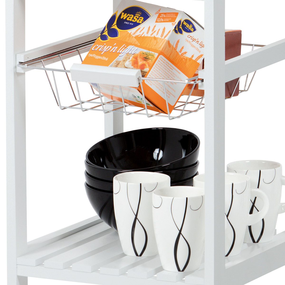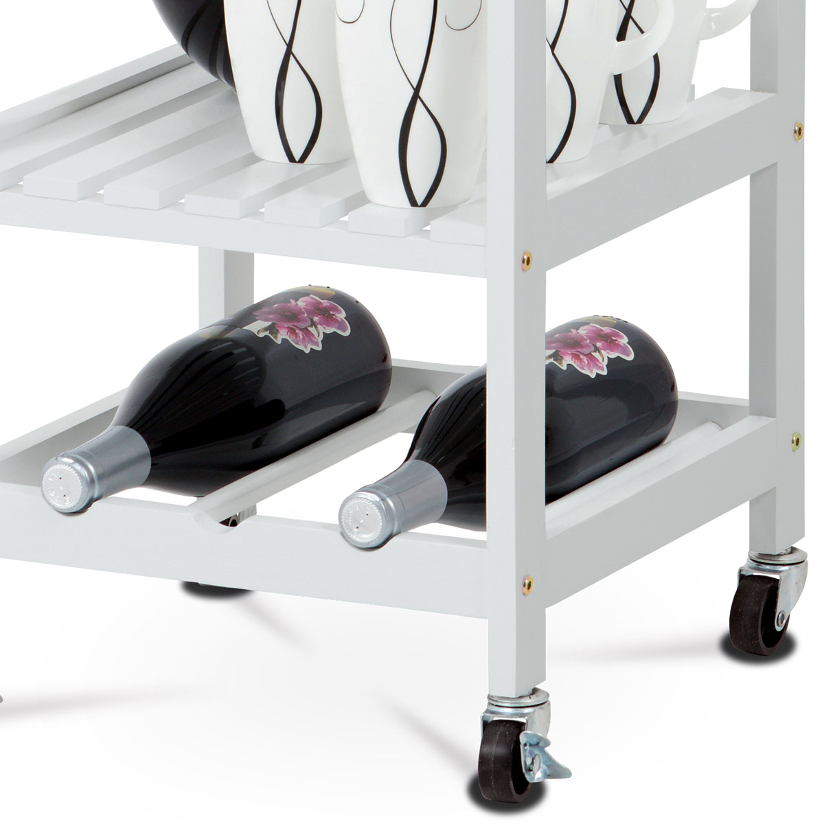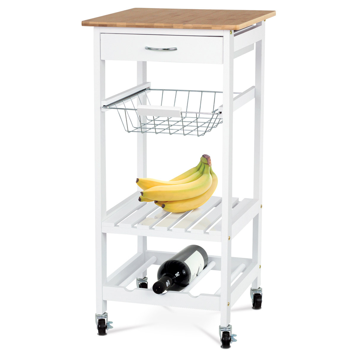 Servírovací stolek a regál DR-044 kombinuje přírodní masiv bambusové desky s bílým matným lakem na MDF nohou, což zajišťuje pevné a stabilní provedení vhodné do moderních i klasických interiérů. Vrchní deska z bambusu nabízí odolný a snadno udržovatelný povrch ideální pro přípravu a servírování jídel. Stolek je vybaven praktickou zásuvkou s kovovou úchytkou pro uložení drobných předmětů, drátěným košíkem pro snadný přístup k potravinám a dvěma policemi, které umožňují efektivní uspořádání nádobí či lahví. Pojezdová kolečka s brzdou zajišťují snadnou mobilitu a stabilitu při použití. Kompaktní rozměry a funkční design přinášejí do kuchyně nebo jídelny praktické řešení pro organizaci a servírování.