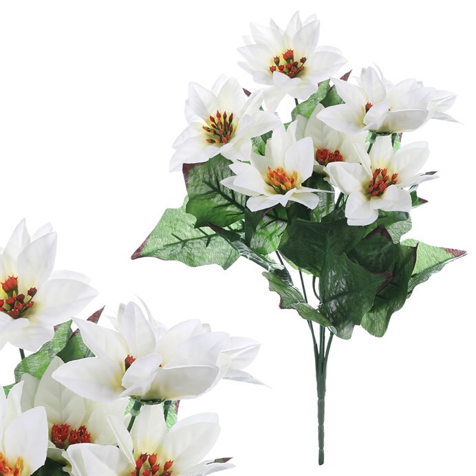 Oslavte vánoční období s květinovou výzdobou za použití umělé kytice vytvořené speciálně pro tyto nejkrásnější svátky v roce. Je navržená a vyrobená tak, aby vaše prostory obohatila přírodním prvkem i v tomto období. Kombinace použití textilu a plastu při výrobě v realistických barvách s jemnými detaily dodává umělé rostlině autentický živý vzhled. Taková umělá květina vám nikdy neuvadne a neztratí na své kráse, díky čemuž ji můžete používat opakovaně. Lze si samozřejmě vybrat z naší široké nabídky i jiný druh květiny a zkombinovat je dle vaší libosti. Přineste si do svého domova kouzlo Vánoc s naší exkluzivní umělou kyticí bílých vánočních růží a vytvořte si každý rok nezapomenutelnou sváteční atmosféru.