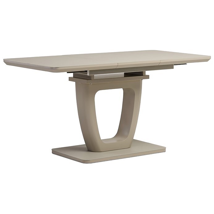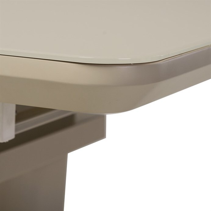Jídelní stůl o rozměrech 110x75 cm s možností rozložení o dalších 40 cm nabízí praktické řešení pro větší počet stolujících. Deska je vyrobena z matného cappuccino skla o tloušťce 4 mm, které je snadno udržovatelné a odolné vůči běžnému opotřebení. Stabilní podnož i deska jsou z MDF materiálu v odstínu cappuccino mat, což dodává stolku moderní a zároveň příjemný vzhled. Rozkládací mechanismus je intuitivní a umožňuje rychlé zvětšení pracovní plochy bez nutnosti složité manipulace. Nosnost stolu odpovídá běžnému domácímu použití a jeho design je vhodný do moderních i klasických interiérů.