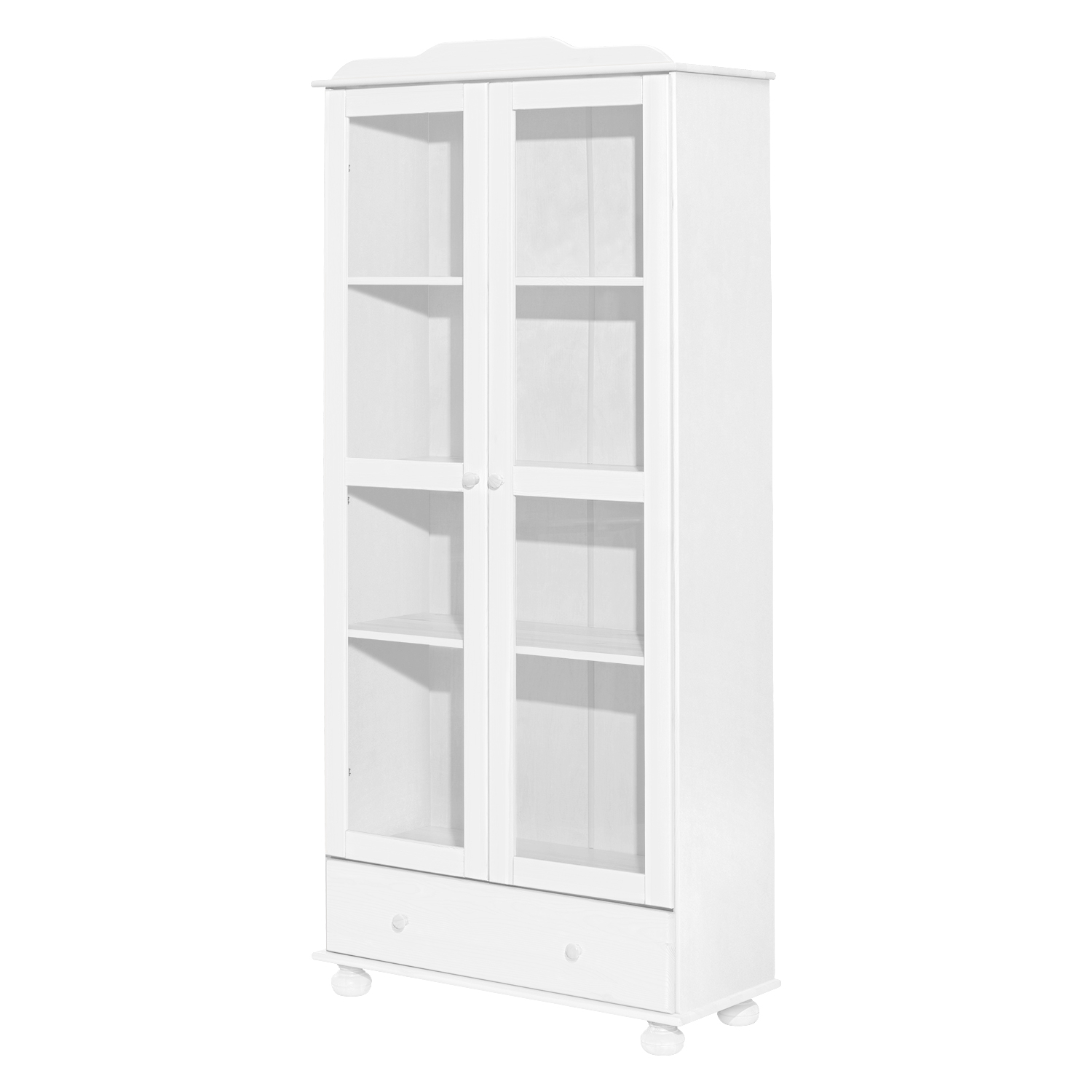 materiál masiv borovice, barevné provedení bílý lak široká zásuvka s kovovými pojezdy, 2 prosklené dveře 2 variabilní a 1 pevná police