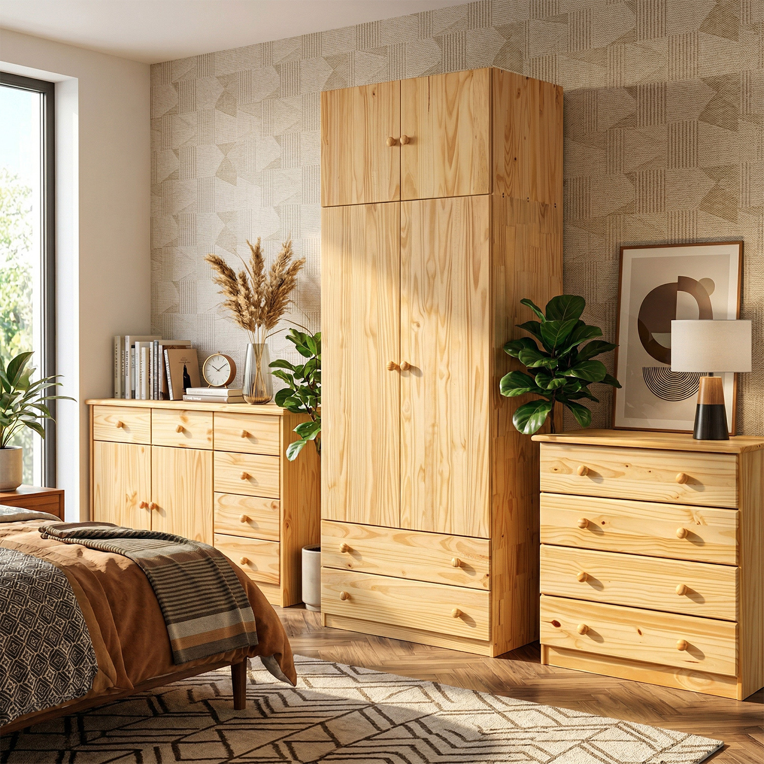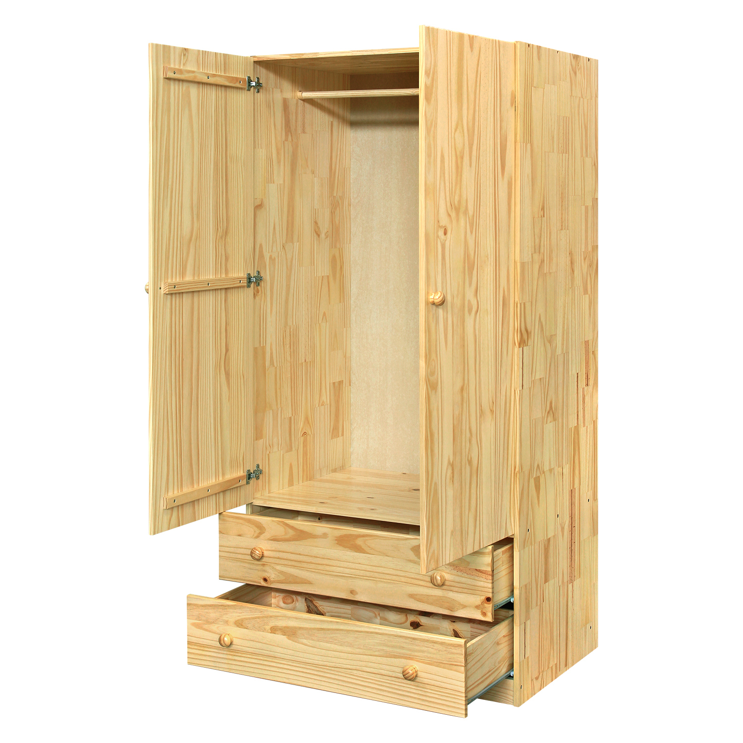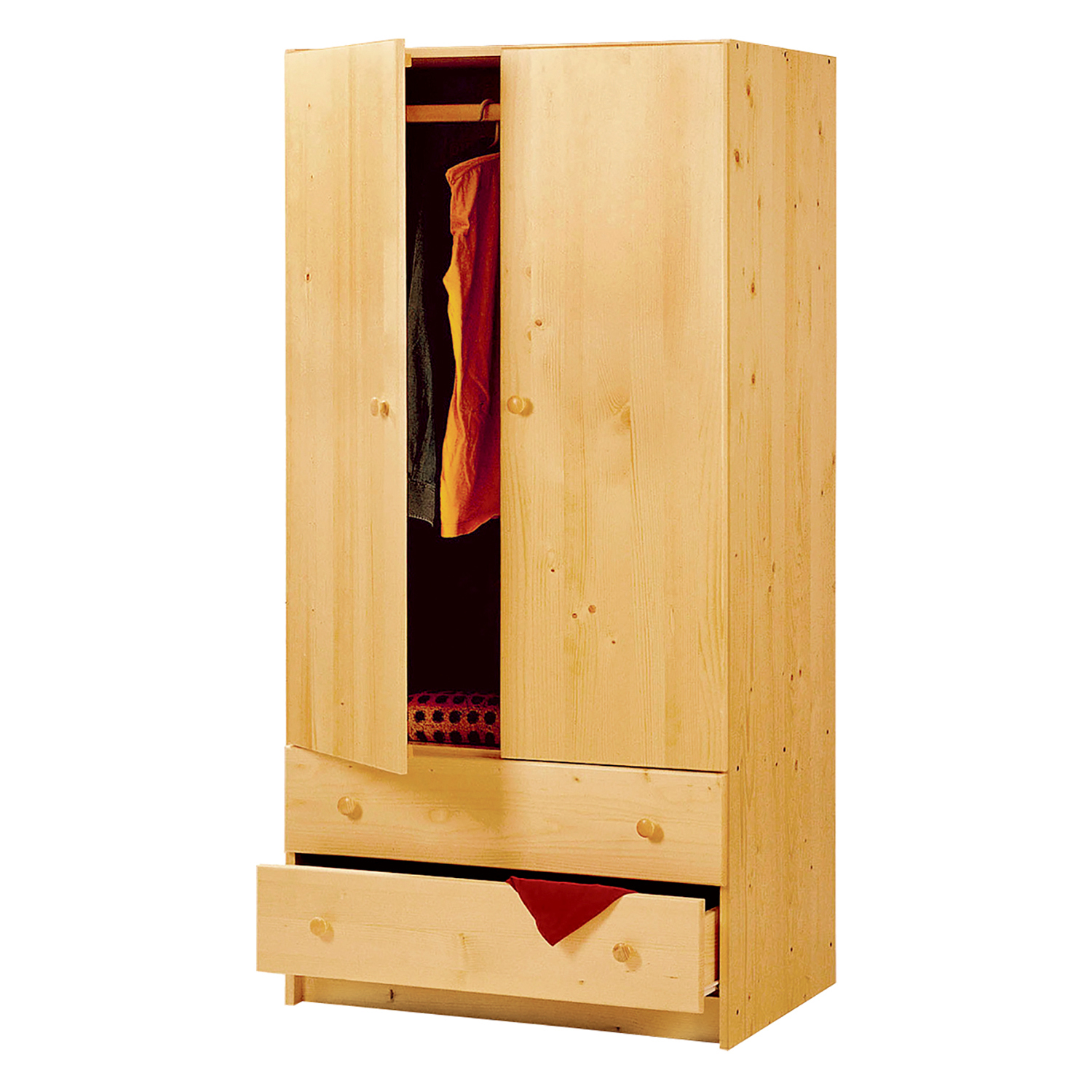 materiál masiv borovice, lakované provedení šatní skříň vybavená šatní tyčí dvě široké zásuvky s kovovými pojezdy doporučený nástavec 811