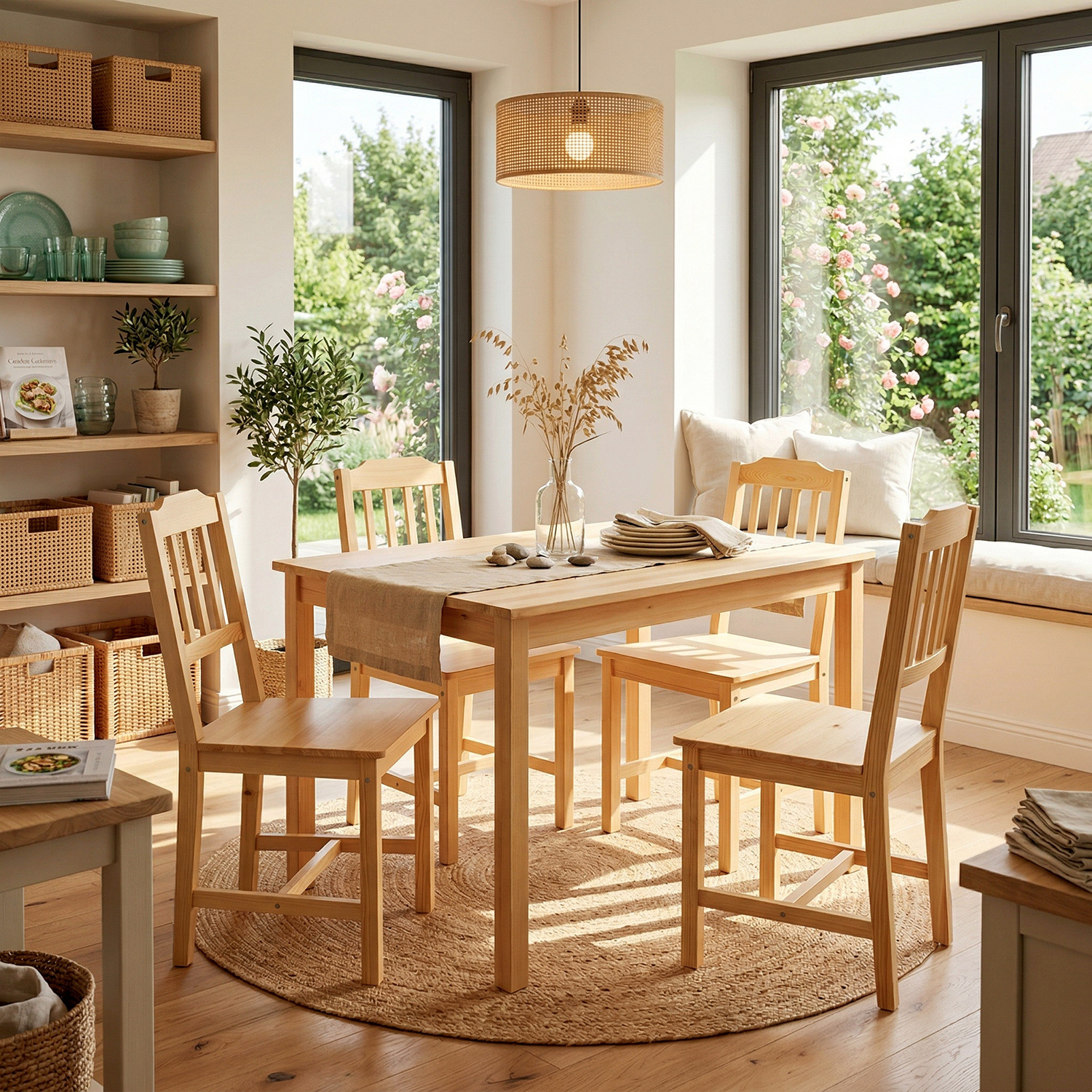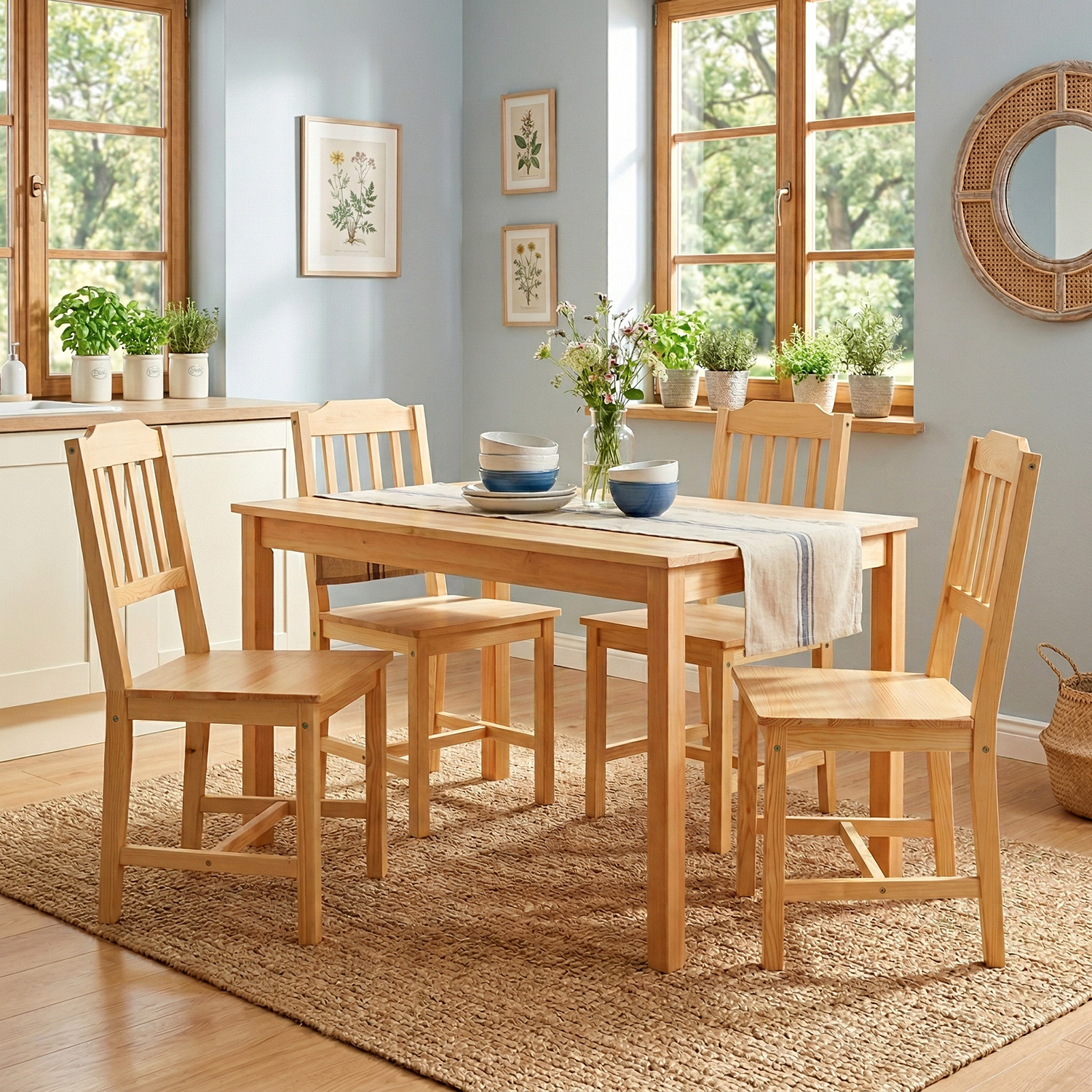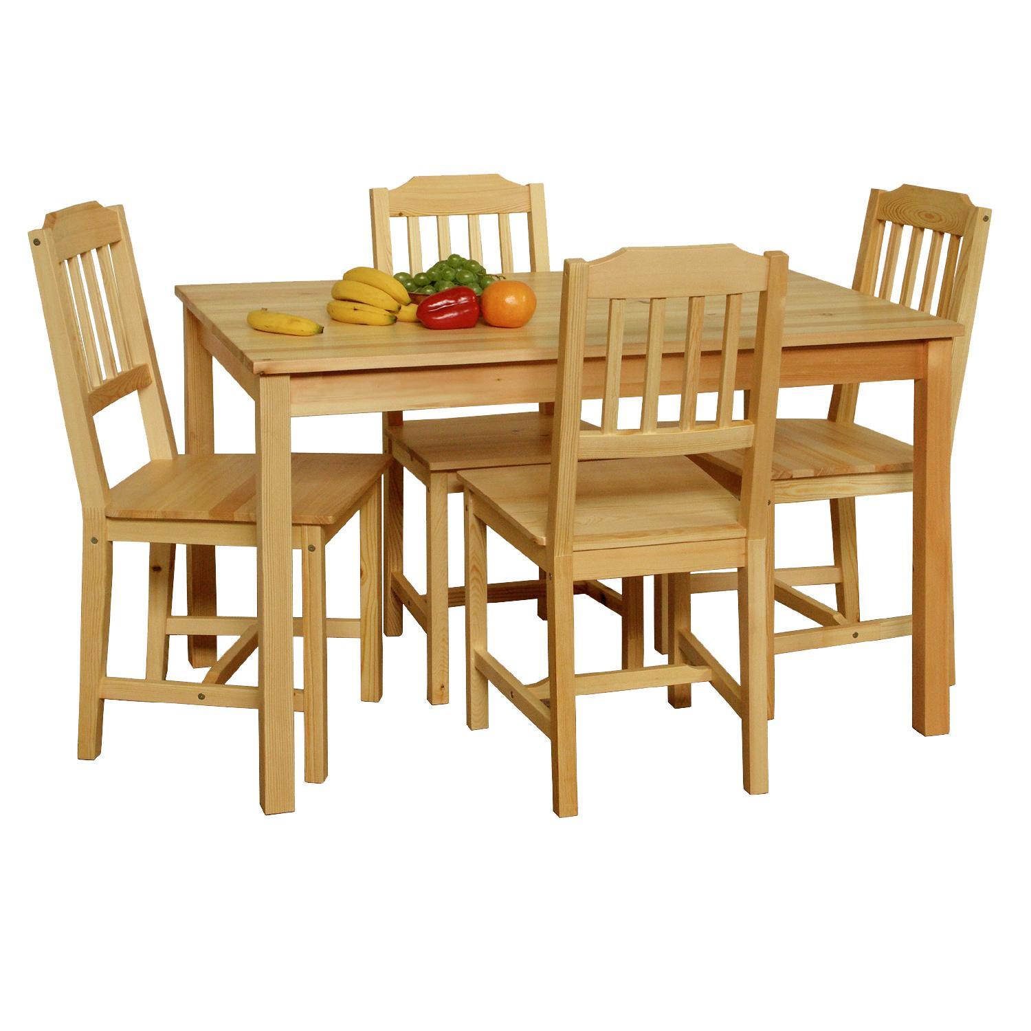 materiál masiv borovice, lakované provedení sestava obsahuje stůl a 4 židle, výška sedu židle 45 cm rozměr stolu (š/h/v) 118 × 75 × 73 cm rozměr židle (š/h/v) 41 × 42 × 86 cm
