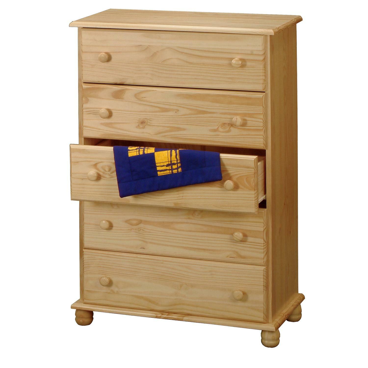 materiál masiv borovice, lakované provedení 5 širokých zásuvek s kovovými pojezdy, hloubka zásuvky 33,5 cm