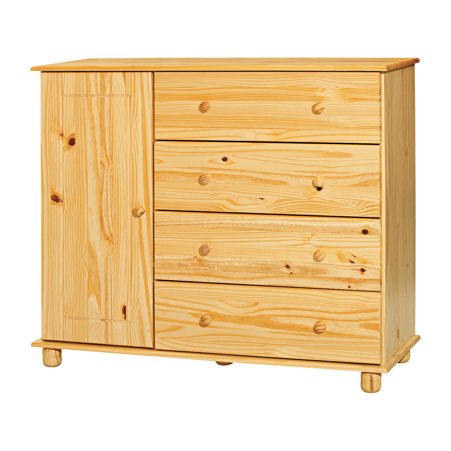 materiál masiv borovice, lakované provedení jedny dvířka, jedna variabilní police 4 široké zásuvky s kovovými pojezdy, hloubka zásuvky 33,5 cm