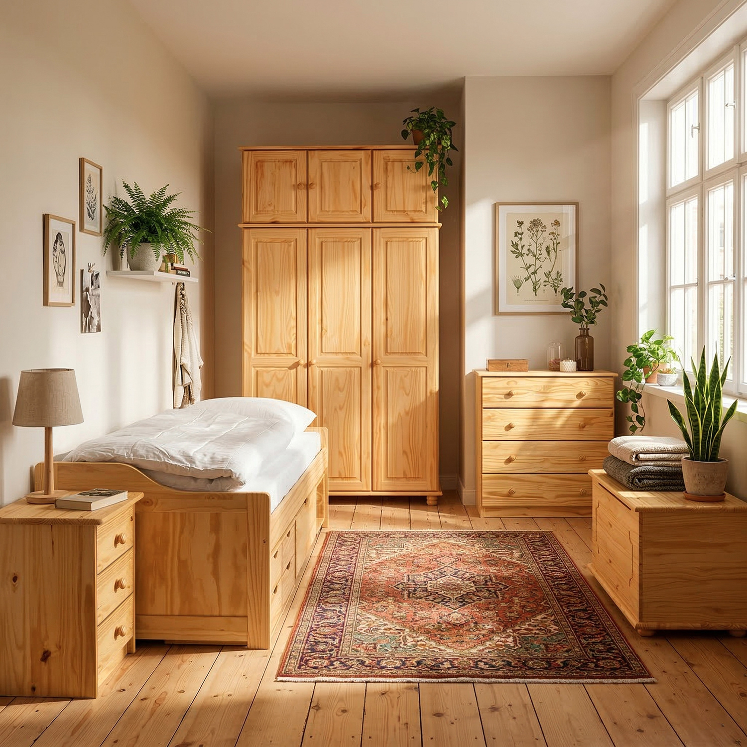 materiál masiv borovice, lakované provedení prostor dělený v poměru 2:1 širší část šatní tyč a police, užší část 3 variabilní police doporučený nástavec 8864