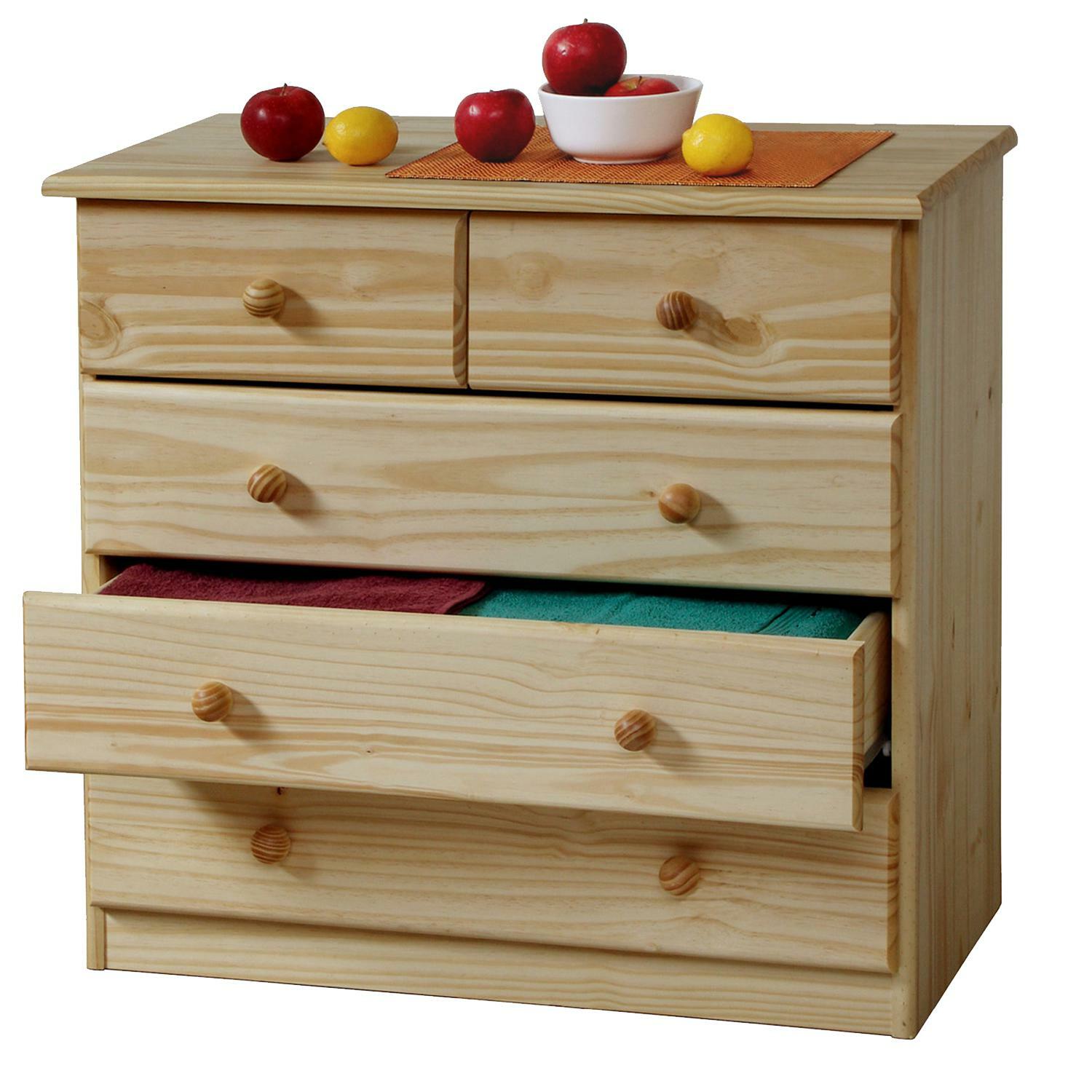 materiál masiv borovice, lakované provedení 2 úzké a 3 široké zásuvky s kovovými pojezdy, hloubka zásuvky 32,5 cm