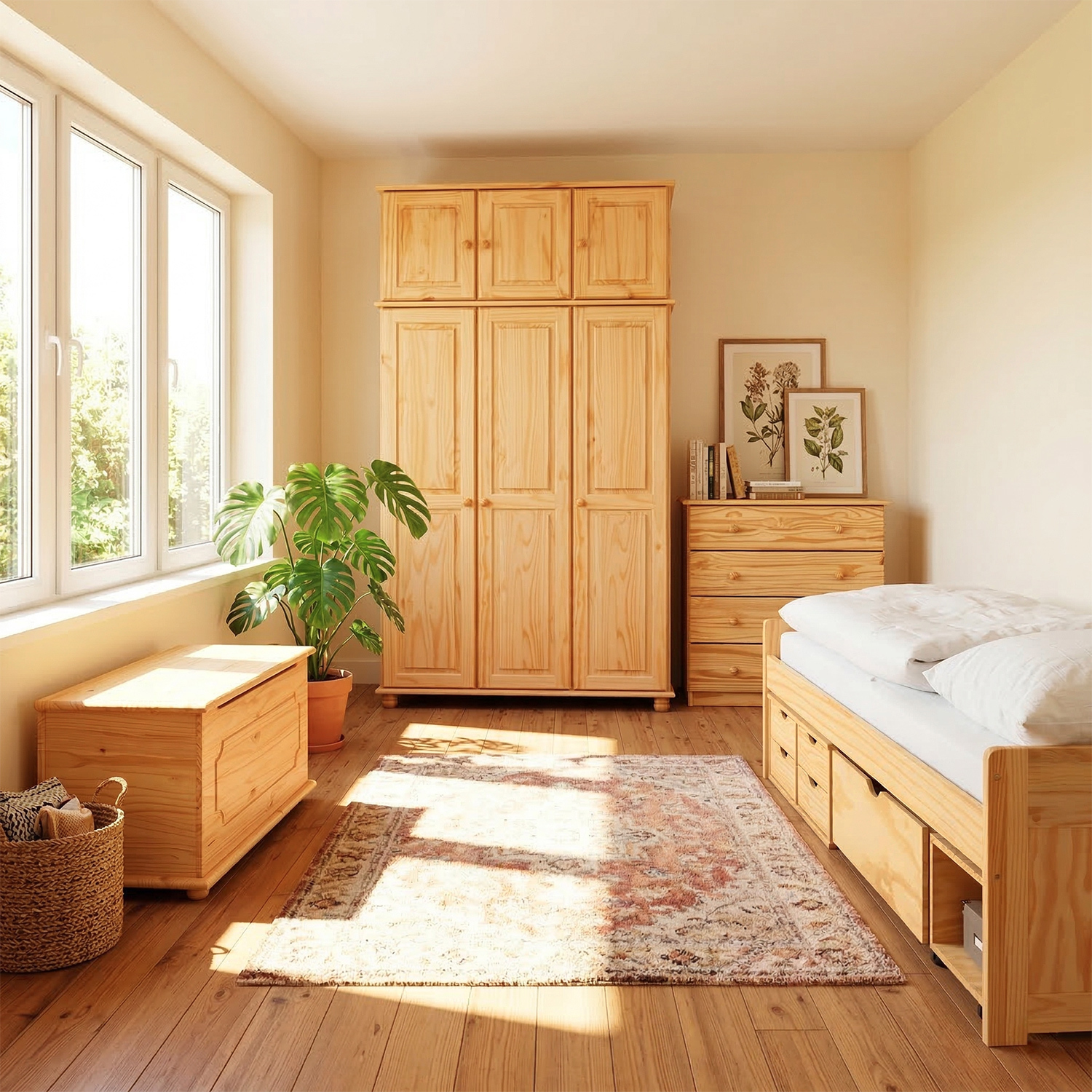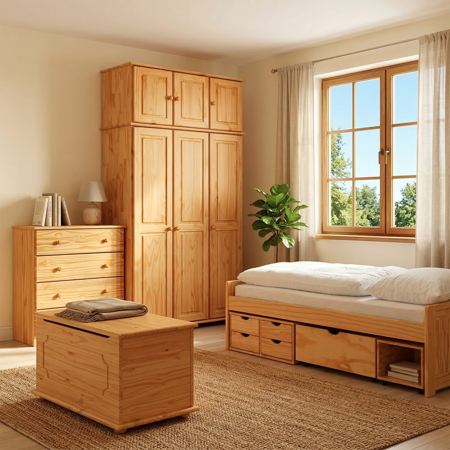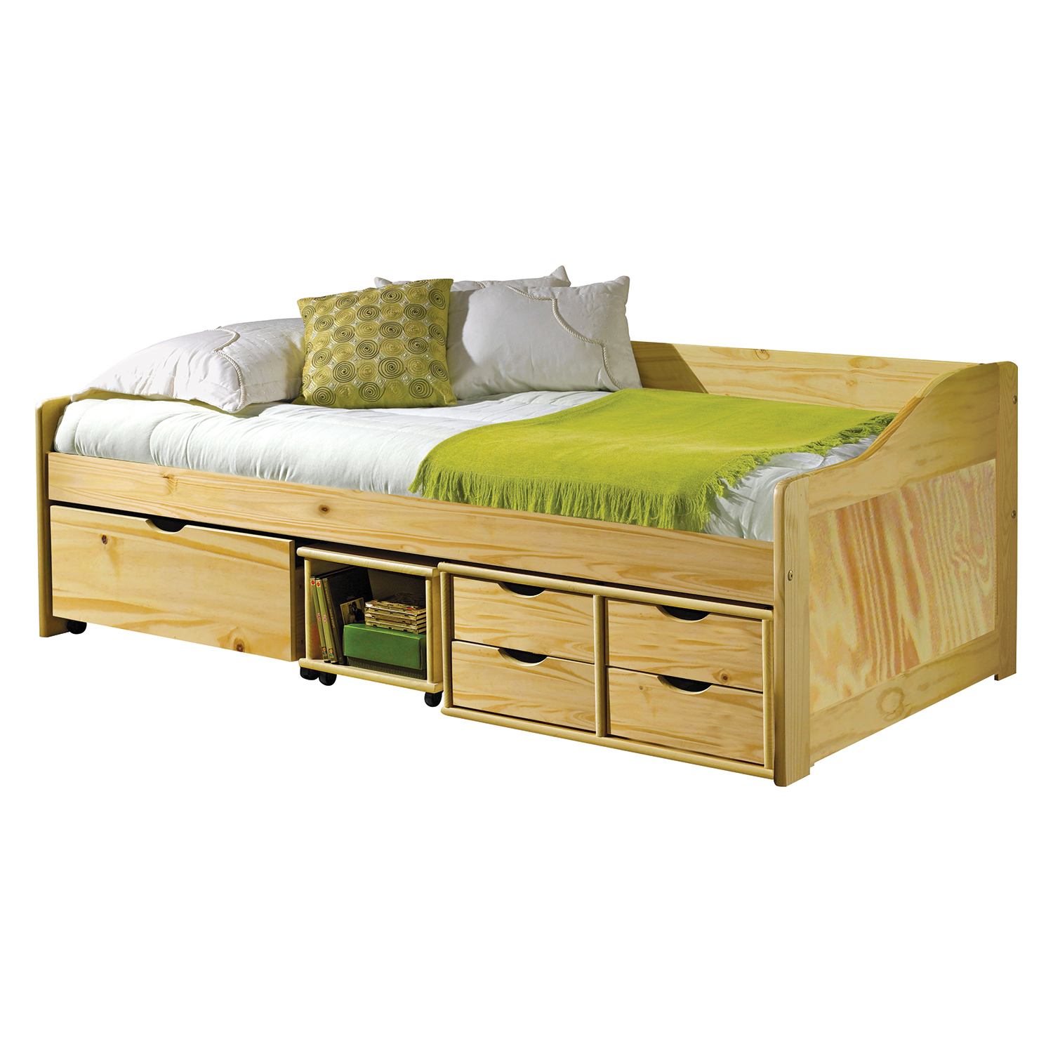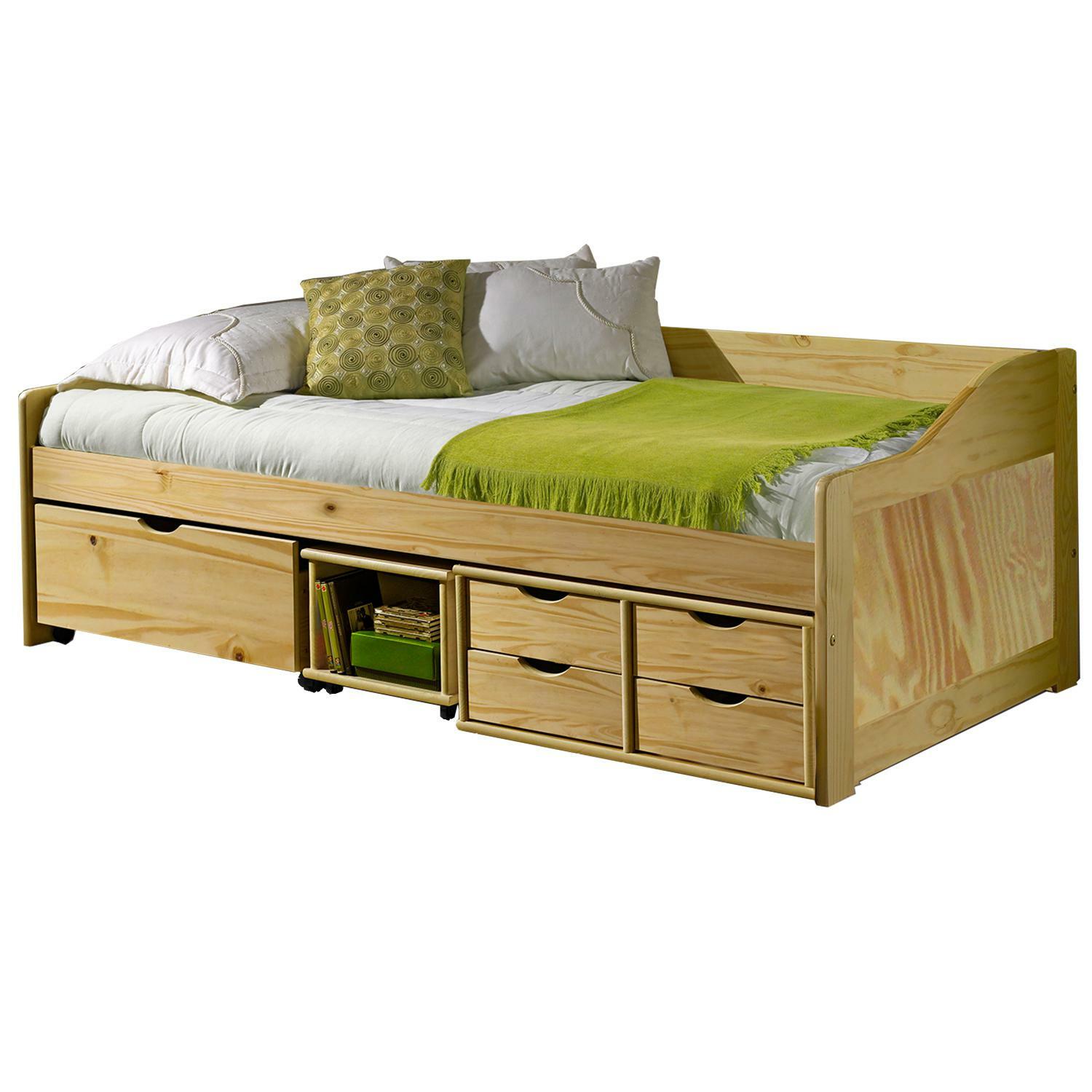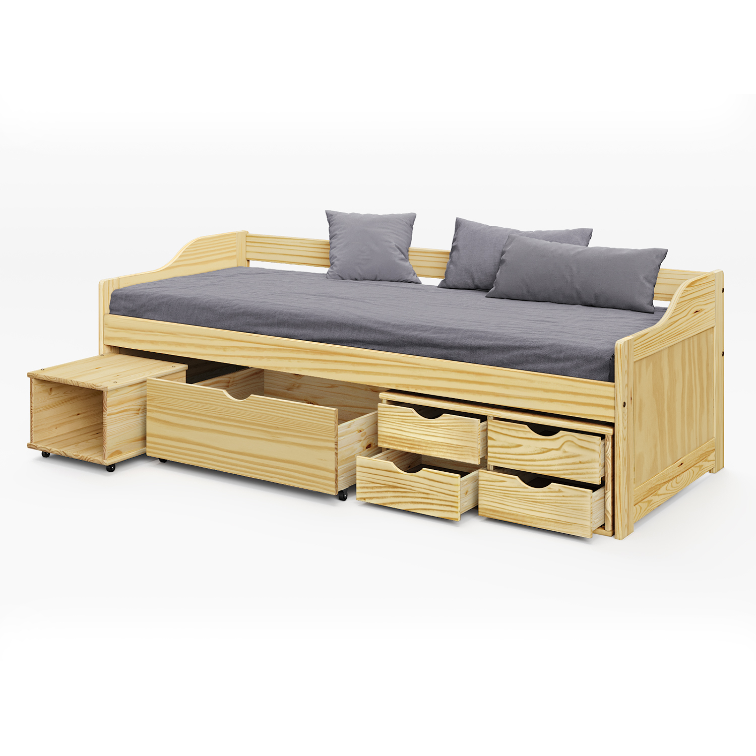 materiál masiv borovice, lakované provedení praktické úložné prostory pod postelí (zásuvky a otevřená police) v ceně výška sedu 50 cm, cena včetně roštu (dřevěný laťkový), matrace není v ceně doporučený rozměr matrace 90 × 200 cm (M2, M5, M9, M12, M24, M26) jako vhodný doplněk doporučujeme čalouněný válec M10 hloubka široké zásuvky 65,5 cm, hloubka malých zásuvek 39 cm, hloubka otevřené police 44,5 cm