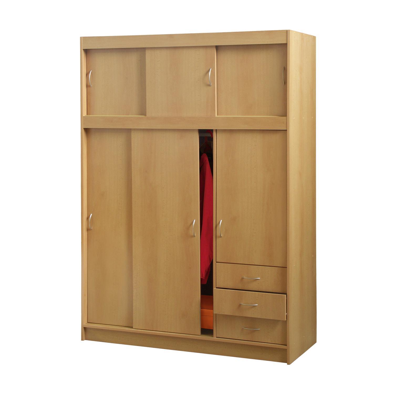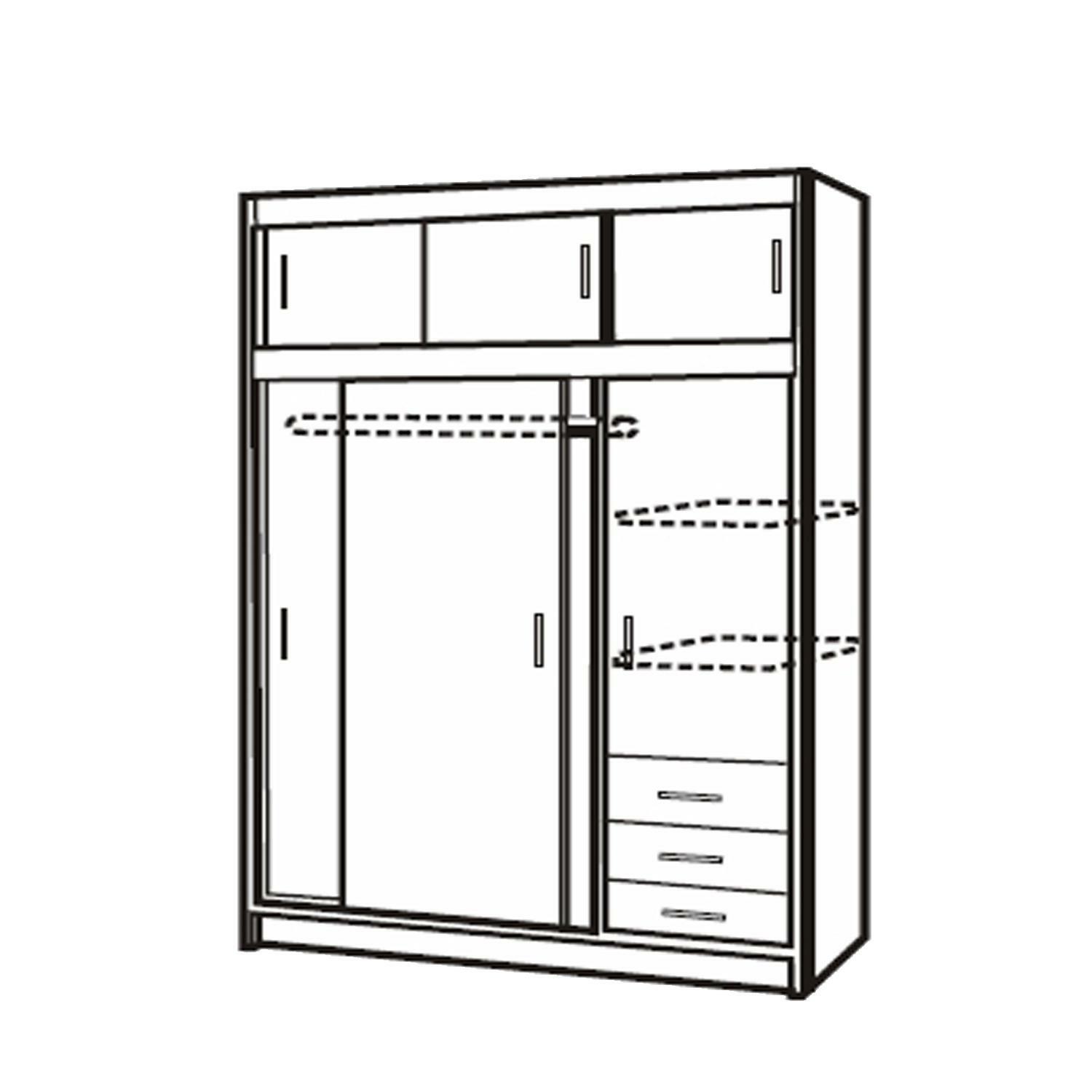 barevné provedení buk posuvné dveře, cena včetně nástavce, prostor dělený v poměru 2:1 širší část šatní tyč, užší část 2 variabilní police, 3 zásuvky s kovovými pojezdy